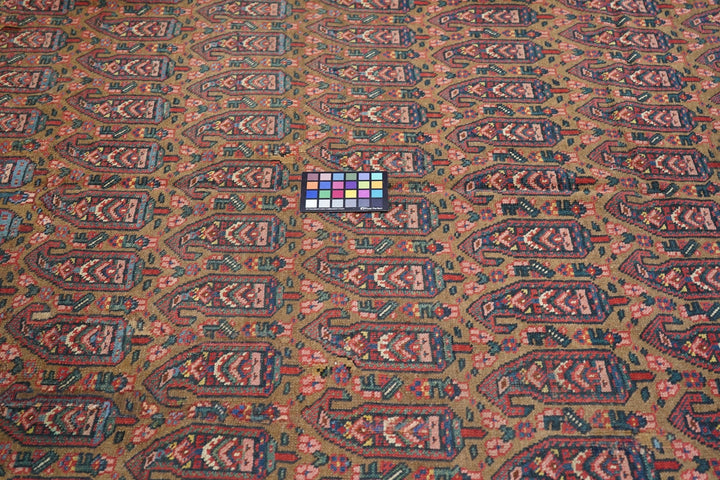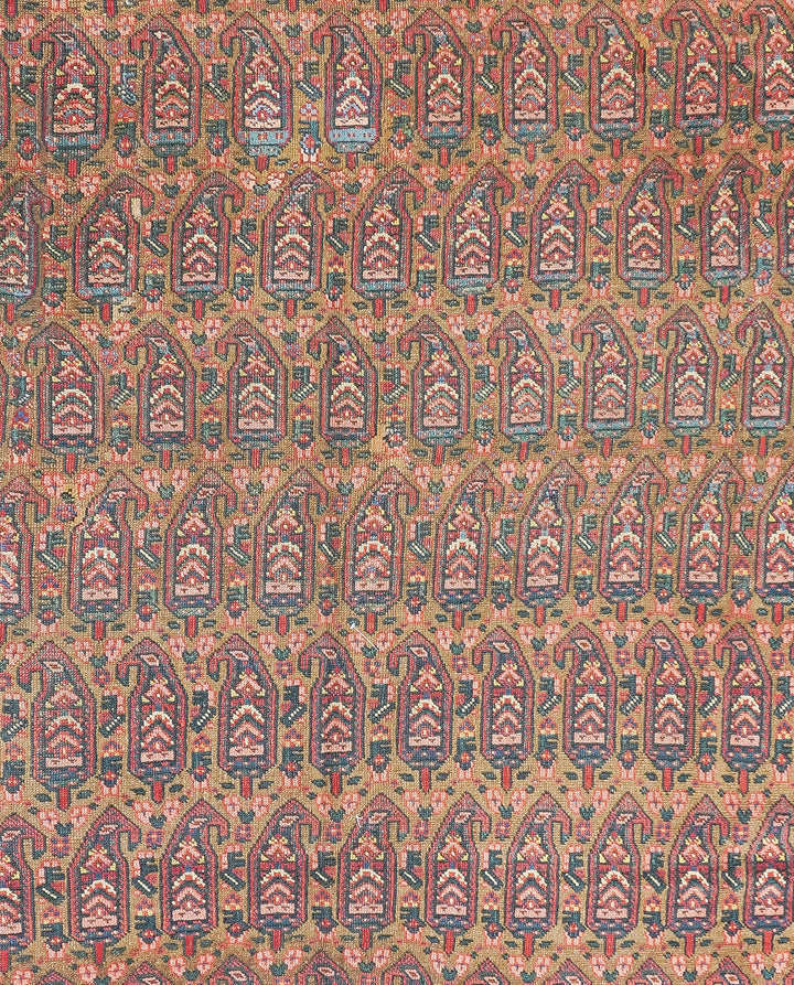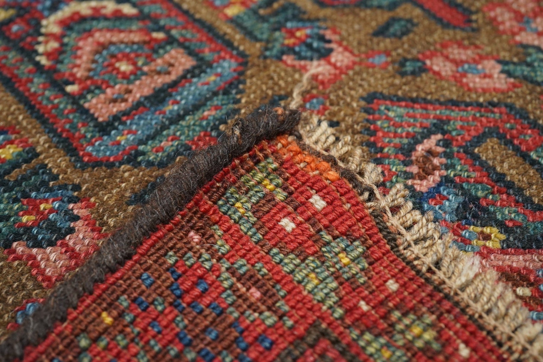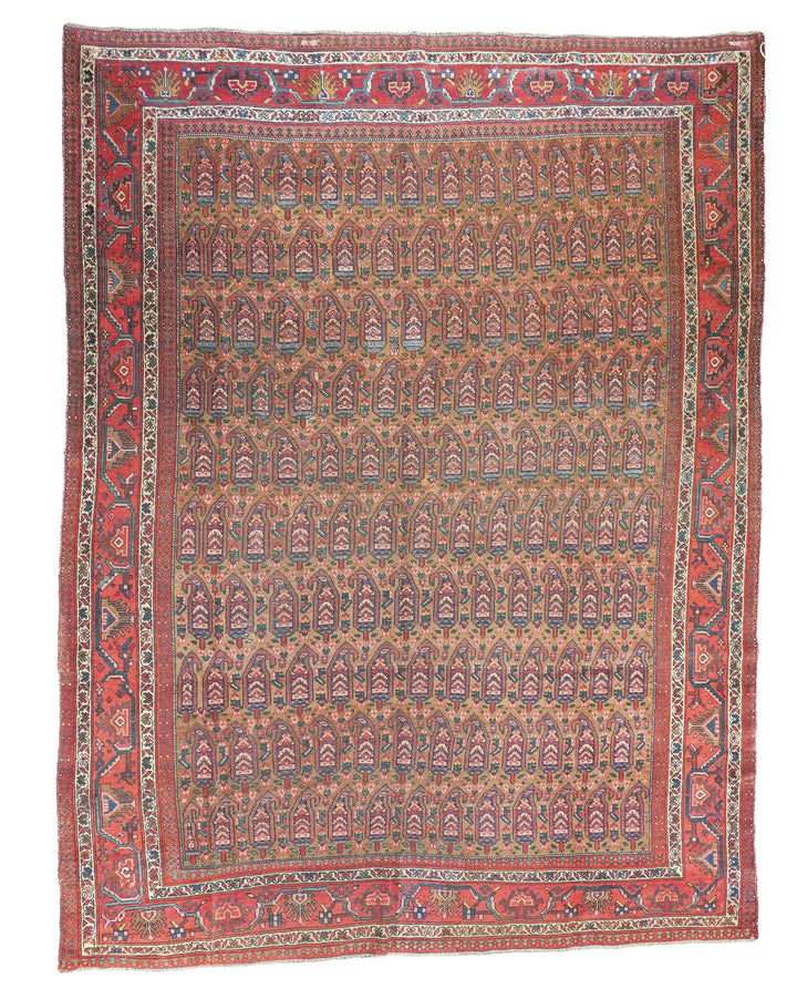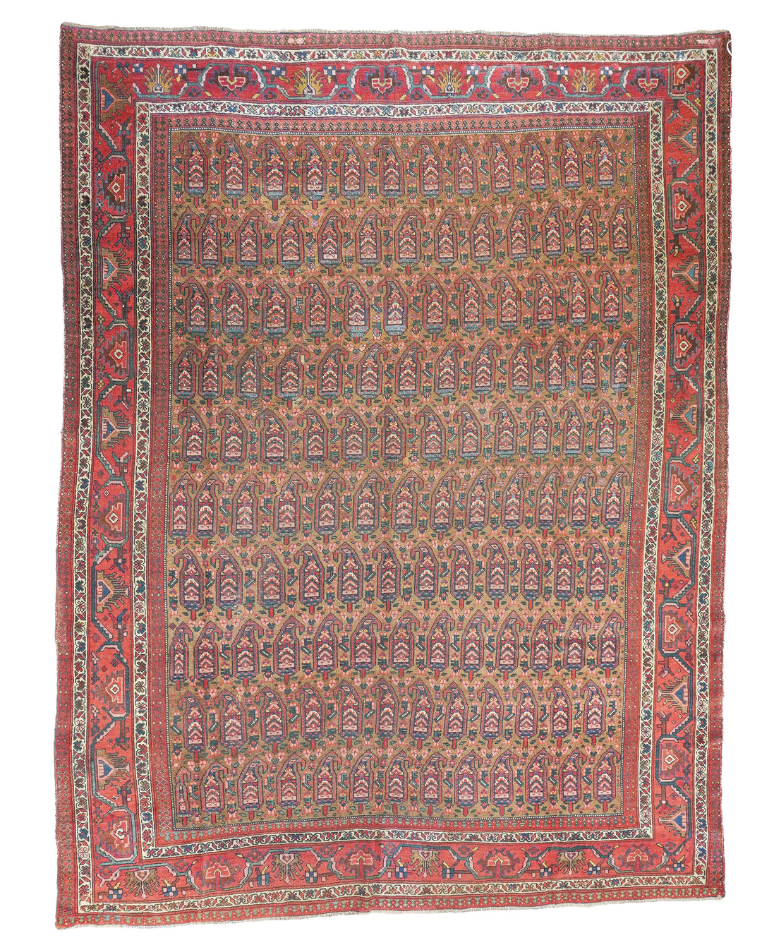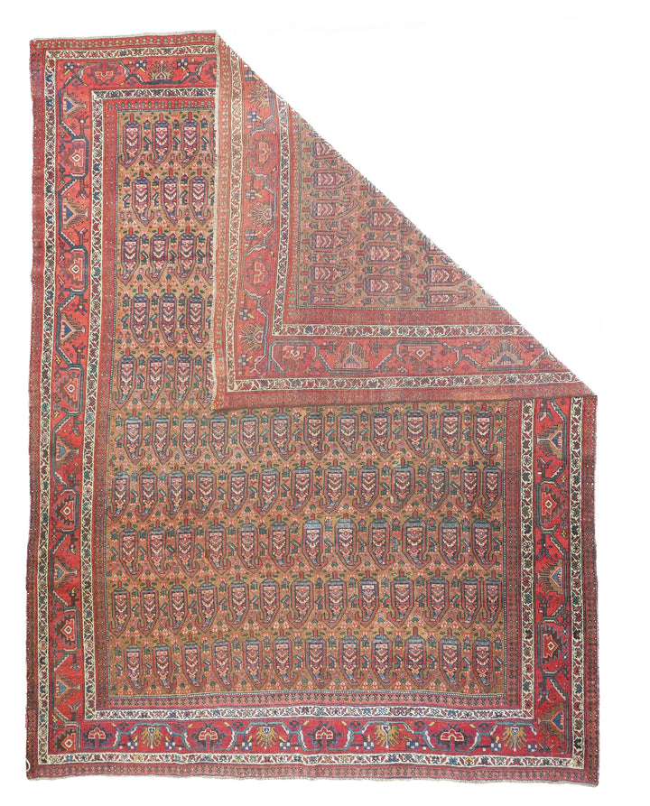 The coral tan field shows yen reversing, offset rows of geometric botehs. Red main strip style border with reversing triangular, fringed palmettes in the Malayer manner. En suite, ecru minors with reversing fan palmette repeats. All wool, with a robust handle. Good condition. Probably Kurdish town work.