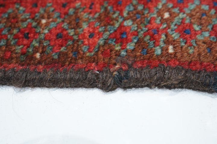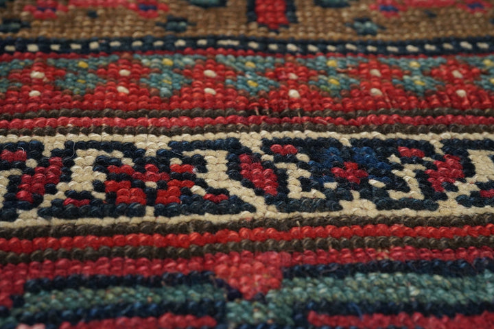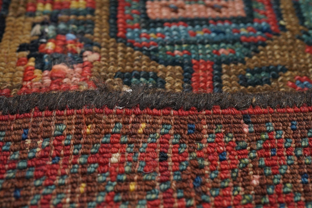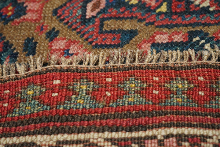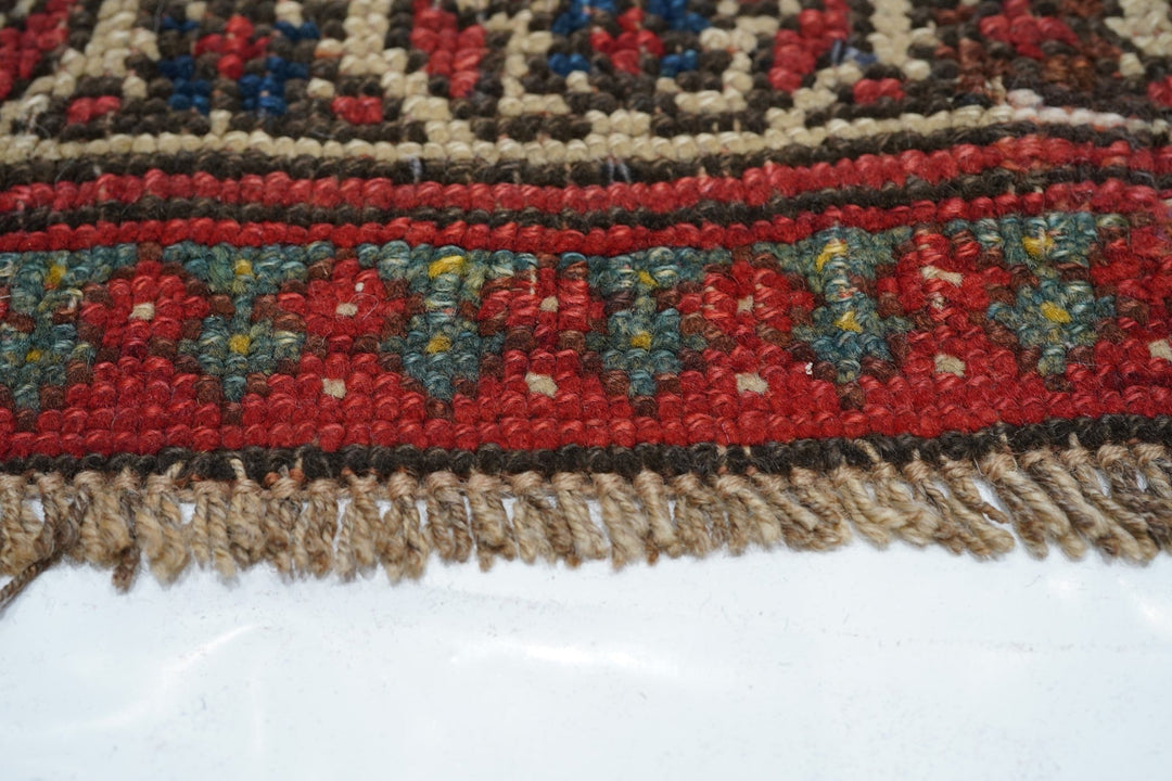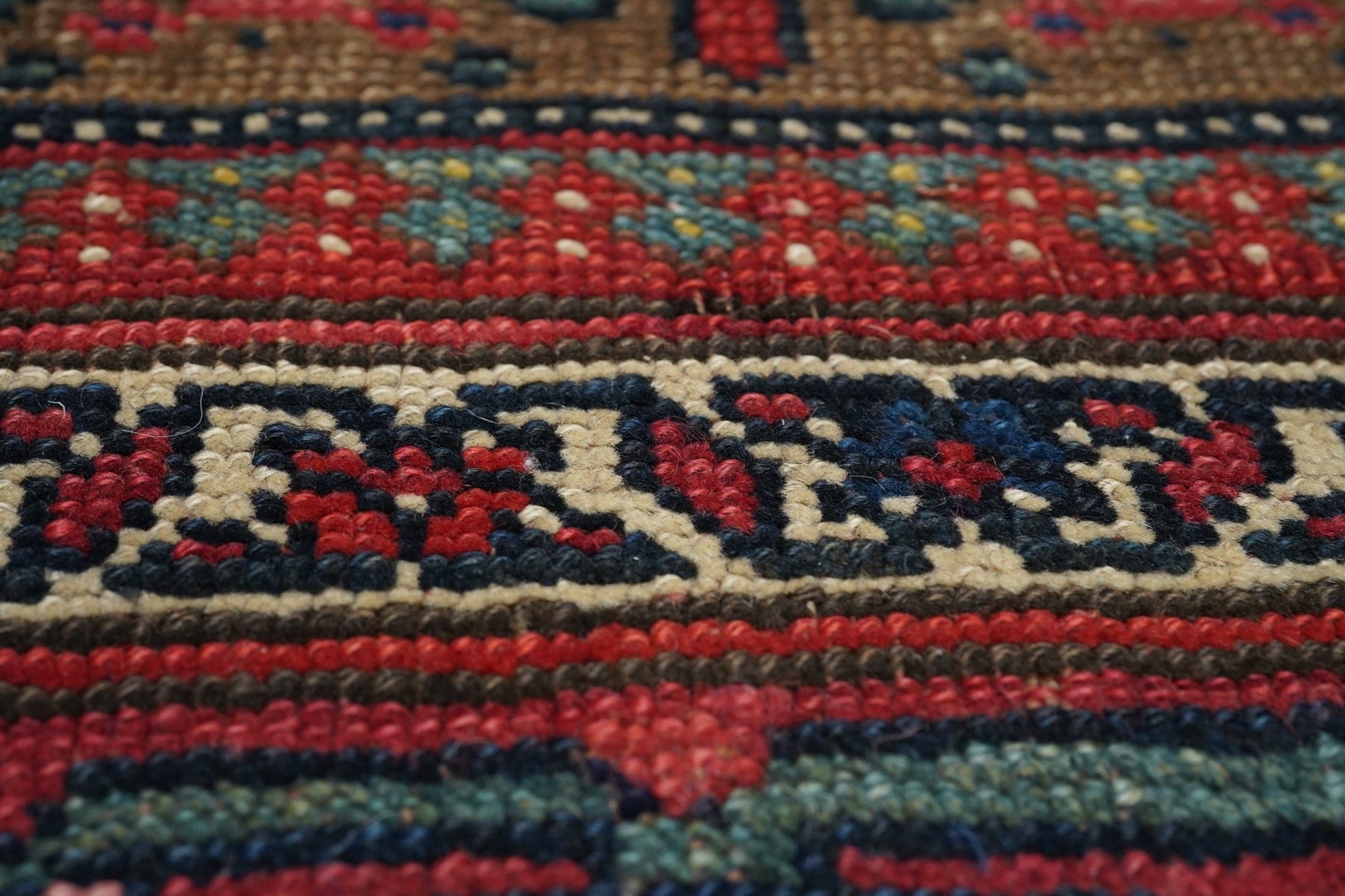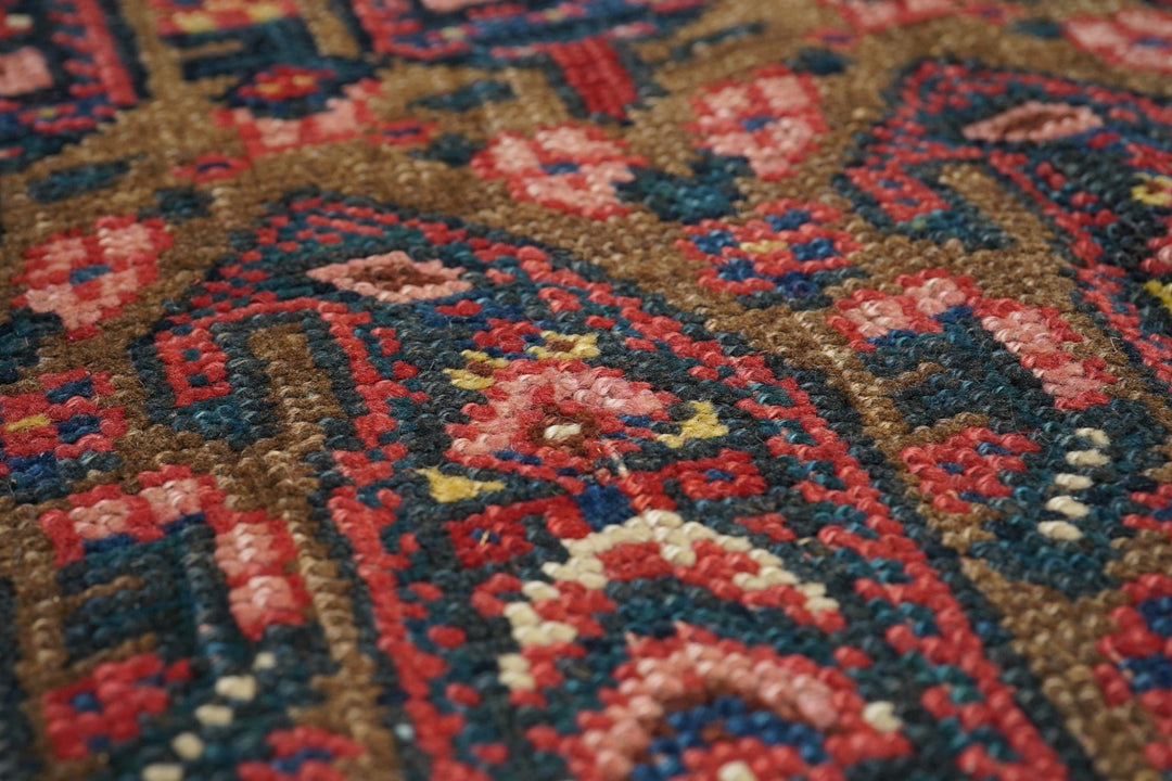 The coral tan field shows yen reversing, offset rows of geometric botehs. Red main strip style border with reversing triangular, fringed palmettes in the Malayer manner. En suite, ecru minors with reversing fan palmette repeats. All wool, with a robust handle. Good condition. Probably Kurdish town work.