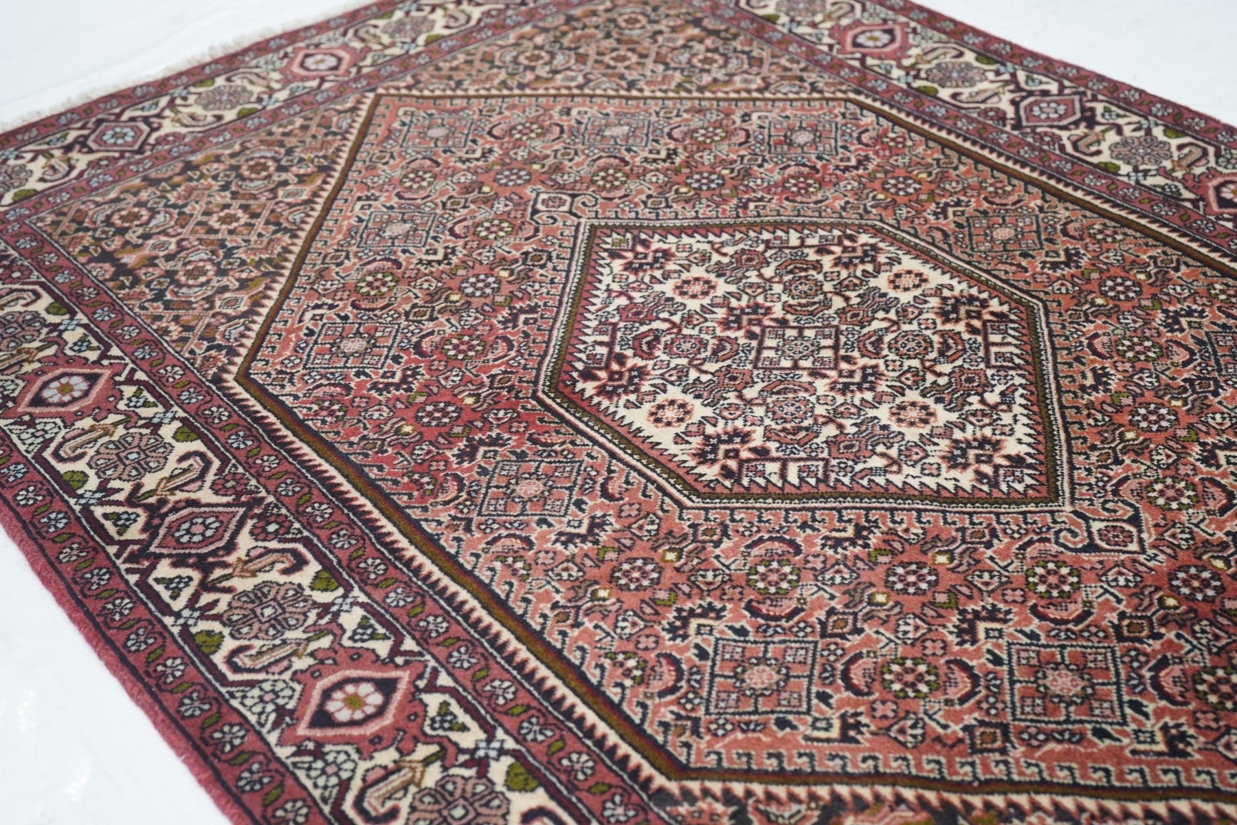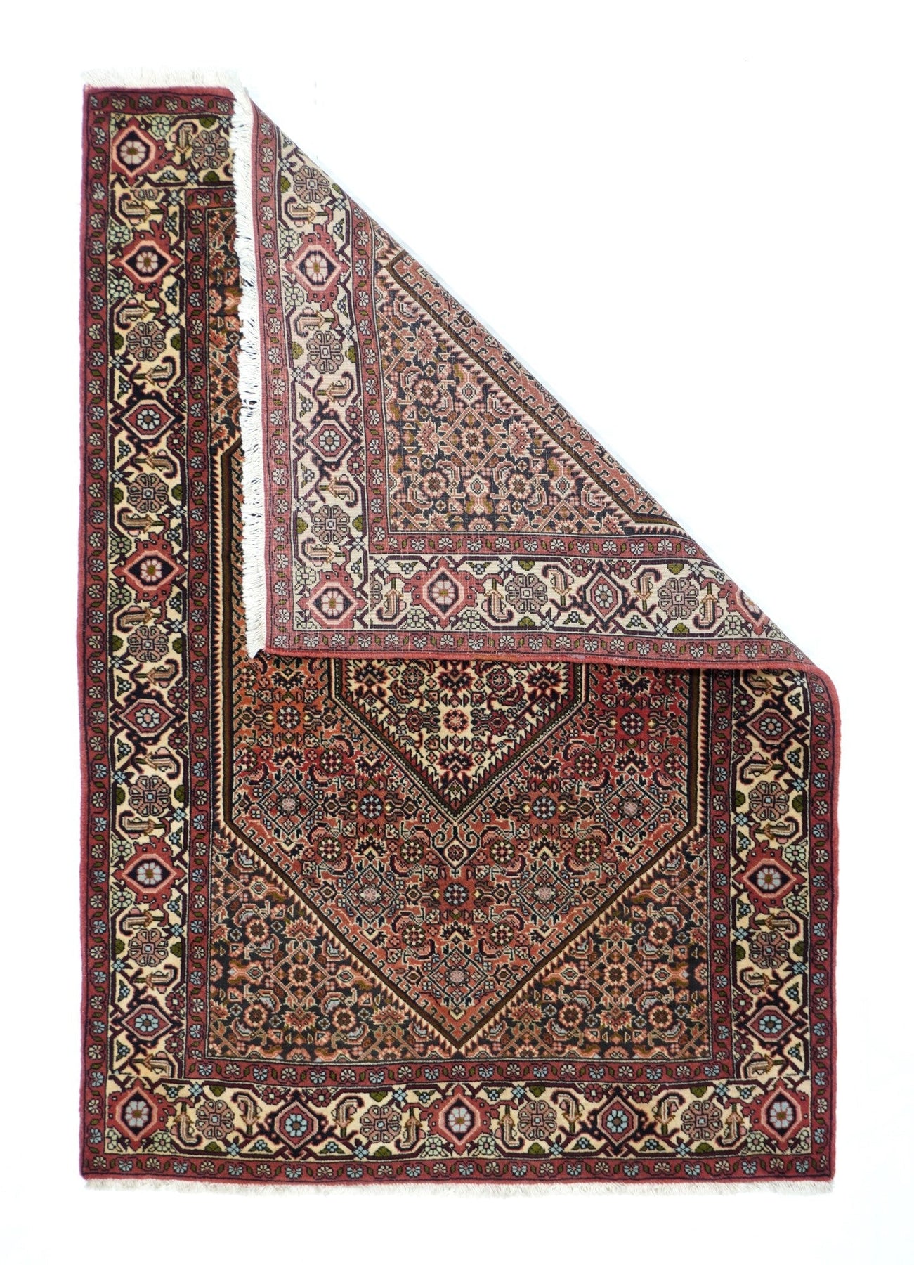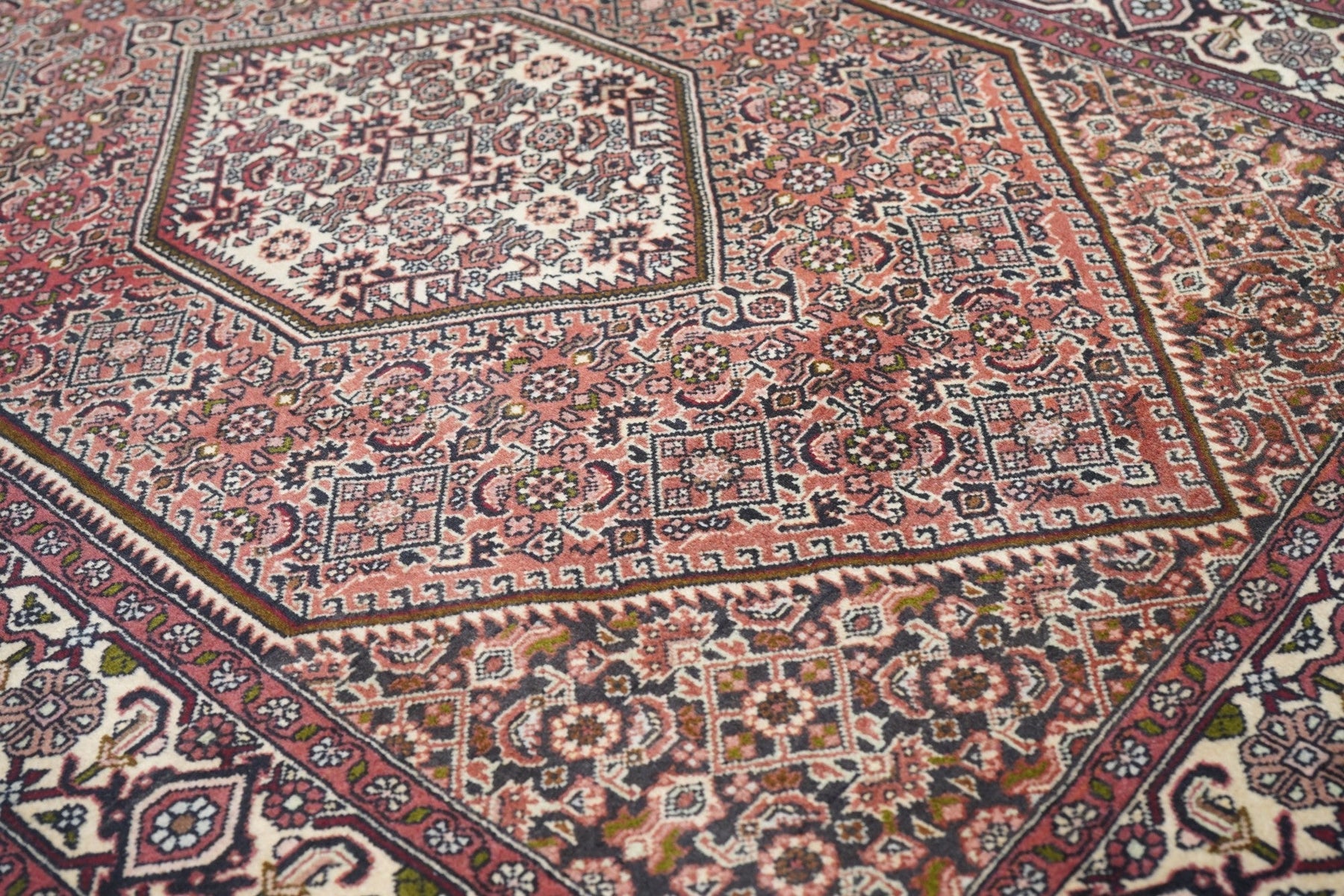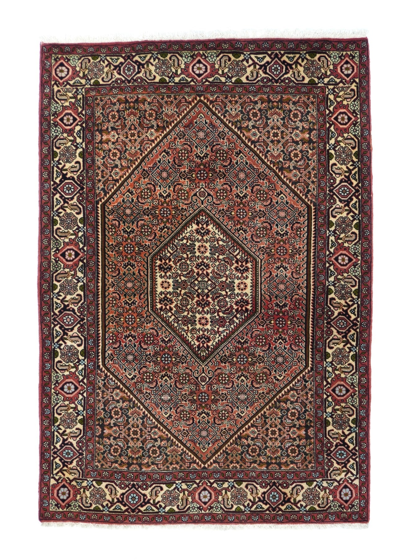 This all-Herati rug shows the same pattern uniformly on the brown corners, serrated coral field and cream central hexagonal medallion. Ivory strip-style reversing turtle border. Fine urban weave; impeccable, balanced drawing. As new condition.