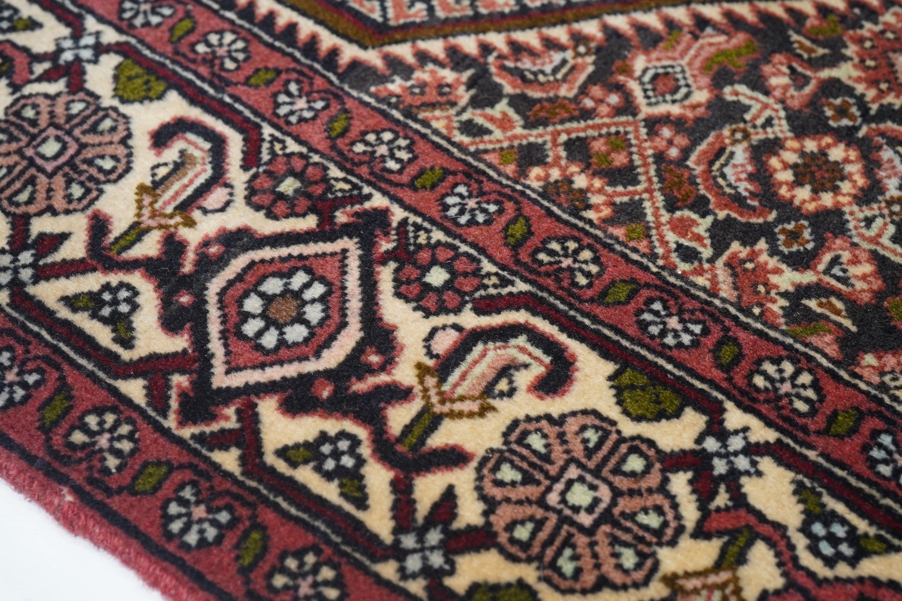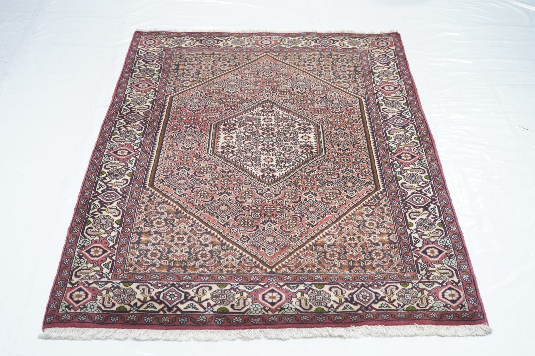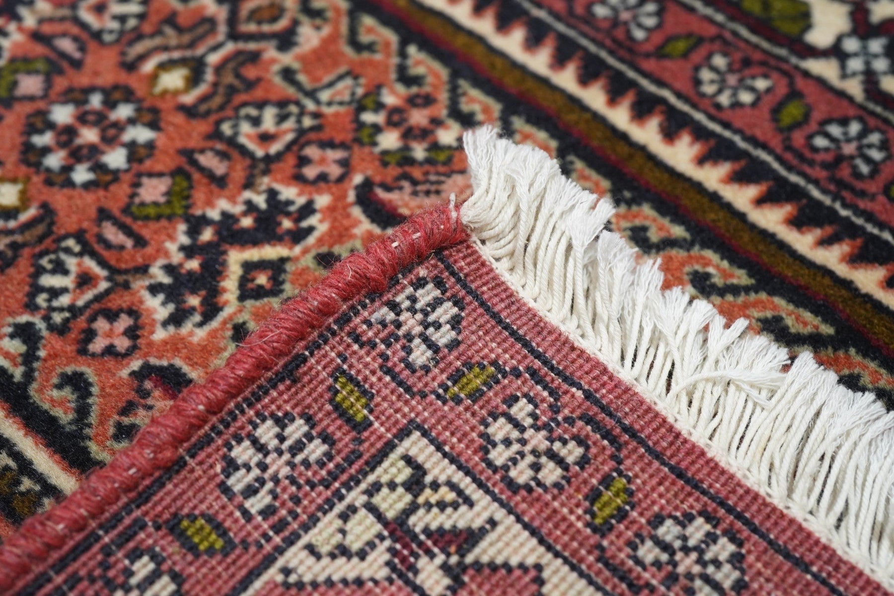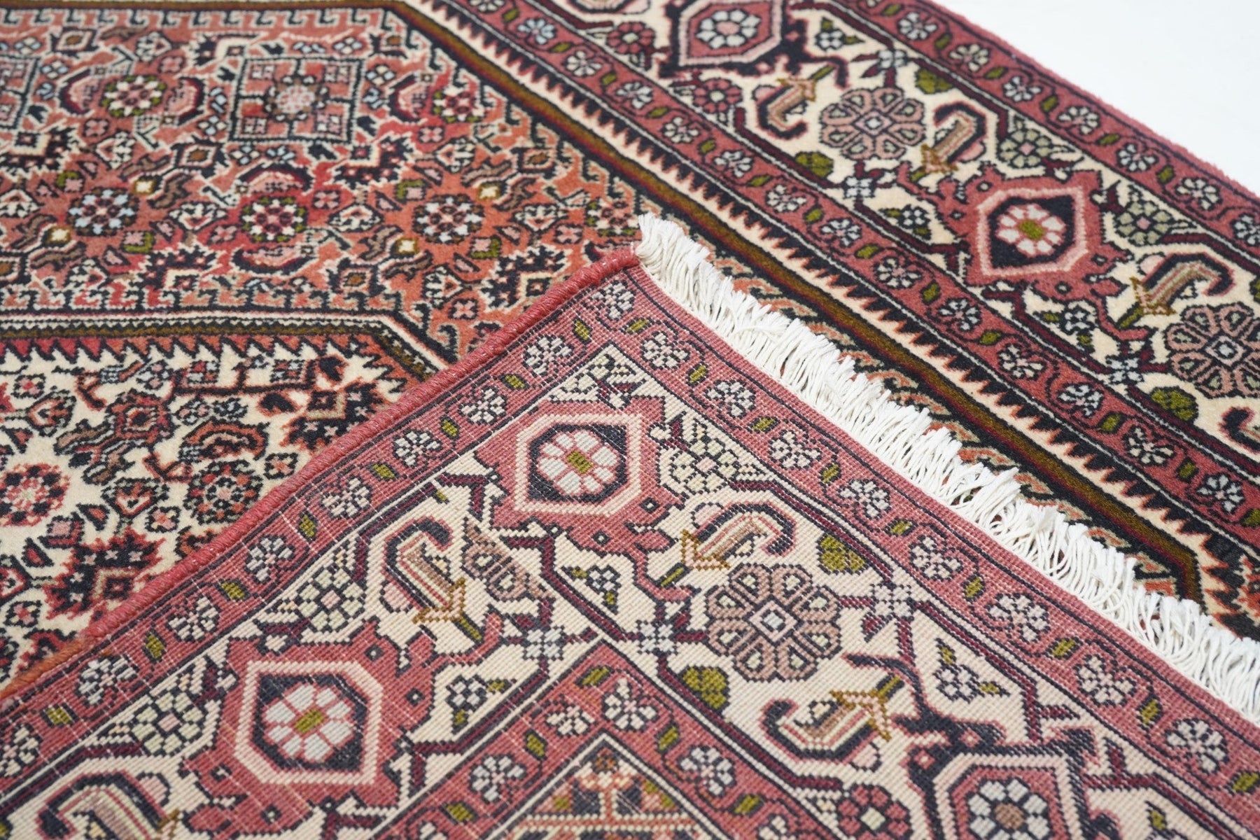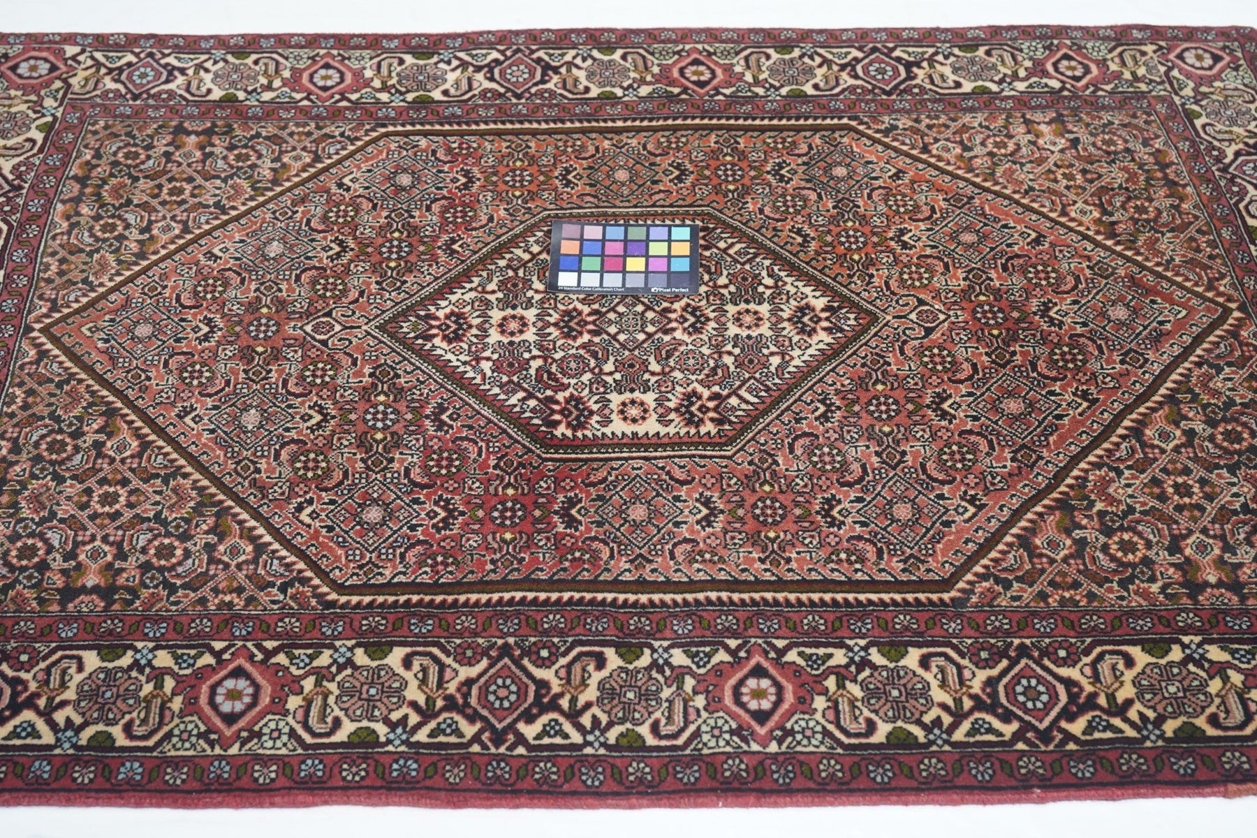 This all-Herati rug shows the same pattern uniformly on the brown corners, serrated coral field and cream central hexagonal medallion. Ivory strip-style reversing turtle border. Fine urban weave; impeccable, balanced drawing. As new condition.