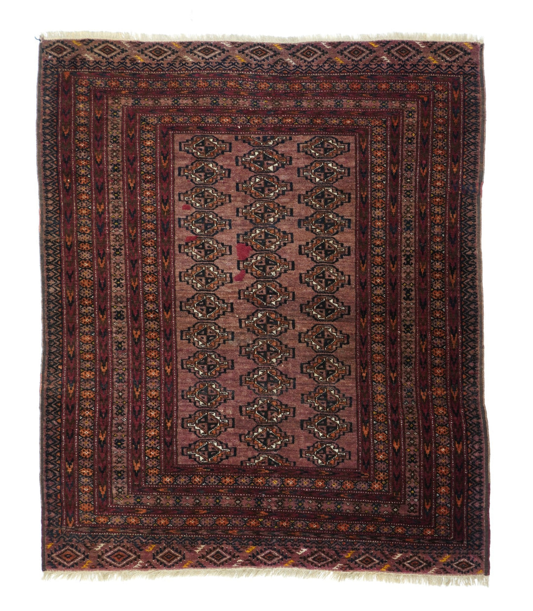 This all wool nomadic scatter shows a small red field with three offset columns of flattened, quartered guls, with a system of eight patterned borders including four with chevrons. Elem's (extra end borders) with rows of lozenge ashiks. Well-woven, with slight end reduction. Short, resilient tribal wool pile. Good condition.