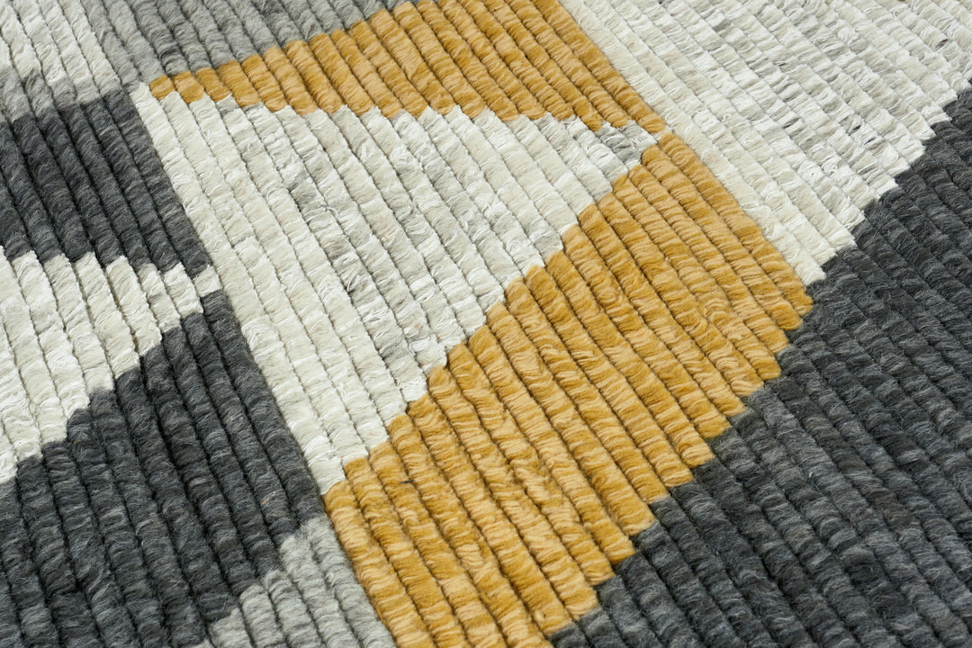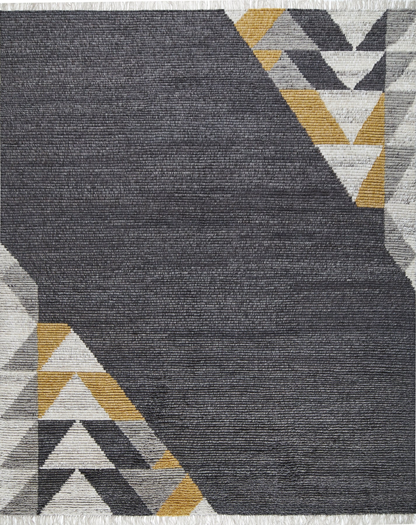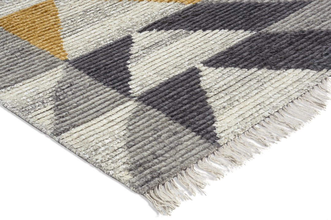 Feel right at home with this fringed symmetrical design. Angled geometric shapes are artfully highlighted with a negative space reveal. Three different techniques – Persian knot, flat-weave and low shag cut pile – create textural delight while three shades of undyed wool skillfully intermingle with dyed New Zealand wool and accents of canary yellow.