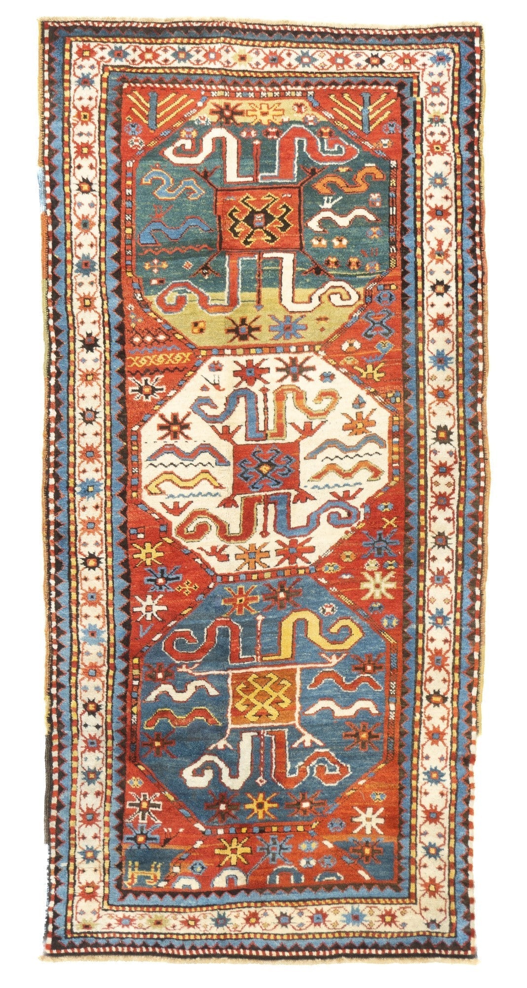 SW Caucasus/Armenia. Boldly patterned, strongly coloured, totally geometric, all wool, coarse to moderate weave, medium to long pile, scatter format pieces, in medallion, allover and prayer (directional) layouts, with numerous identified source villages: Karachof, Bord shaly, Sewan, Shulaver and Lori Pambak. Natural dyes, decorative to highly collectible. Often dated.