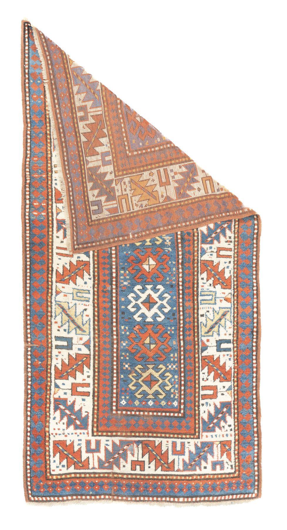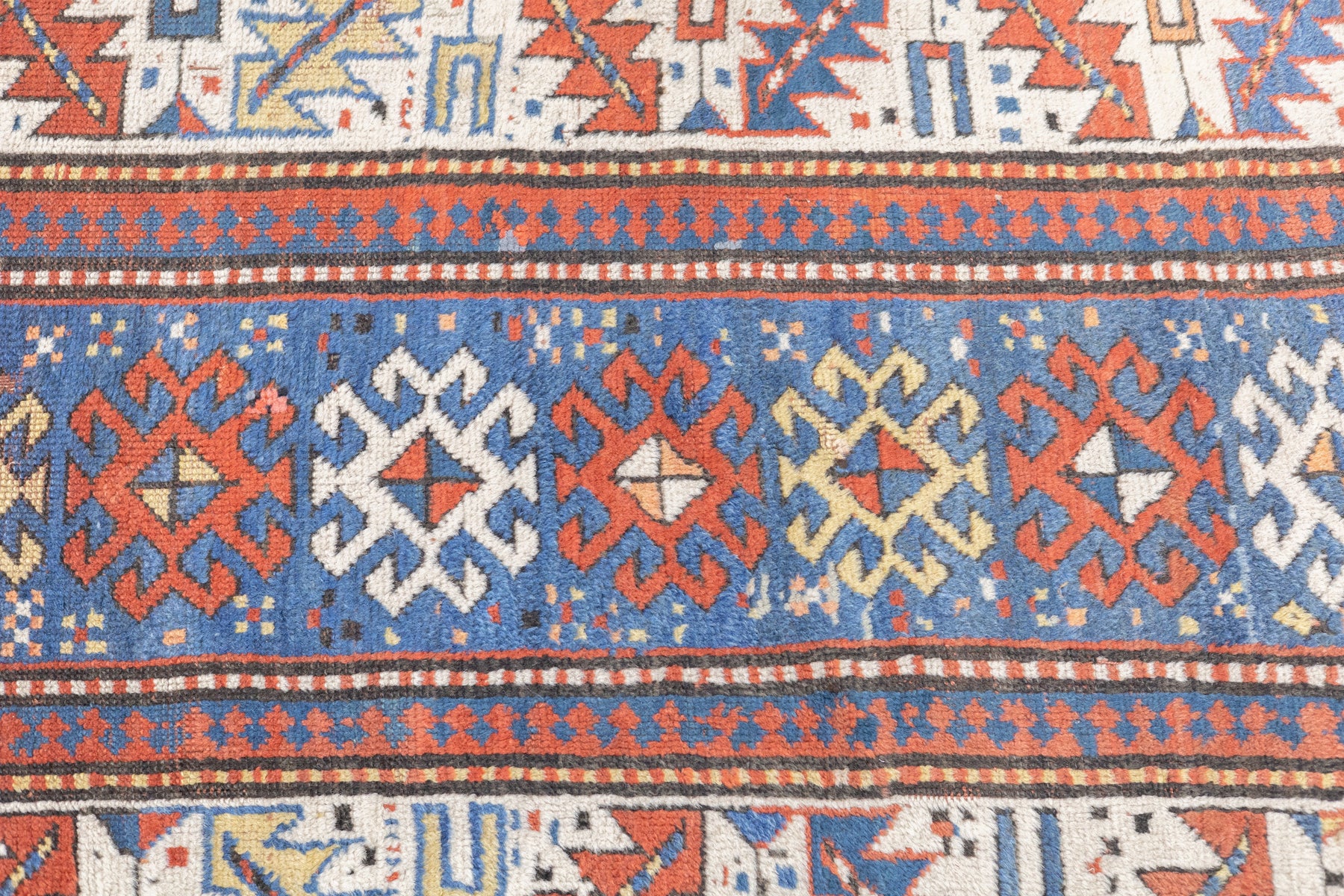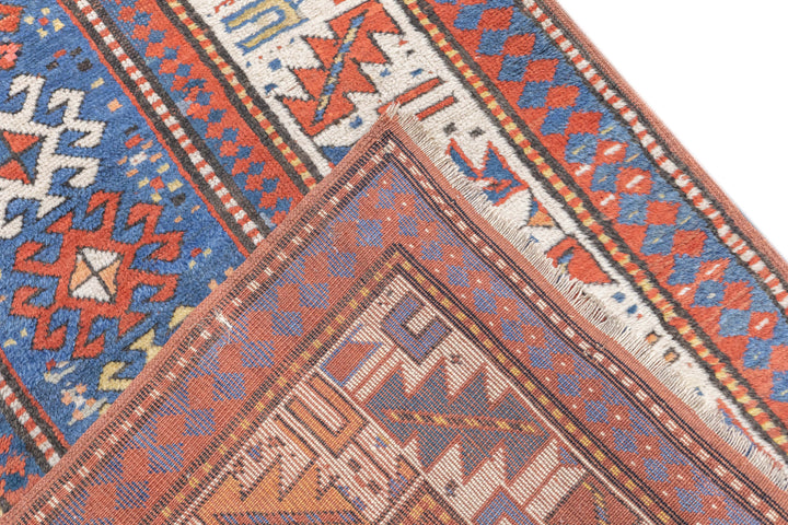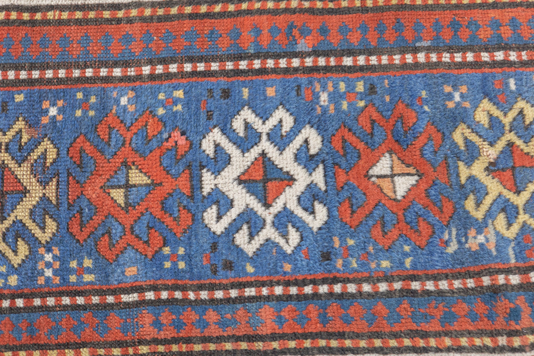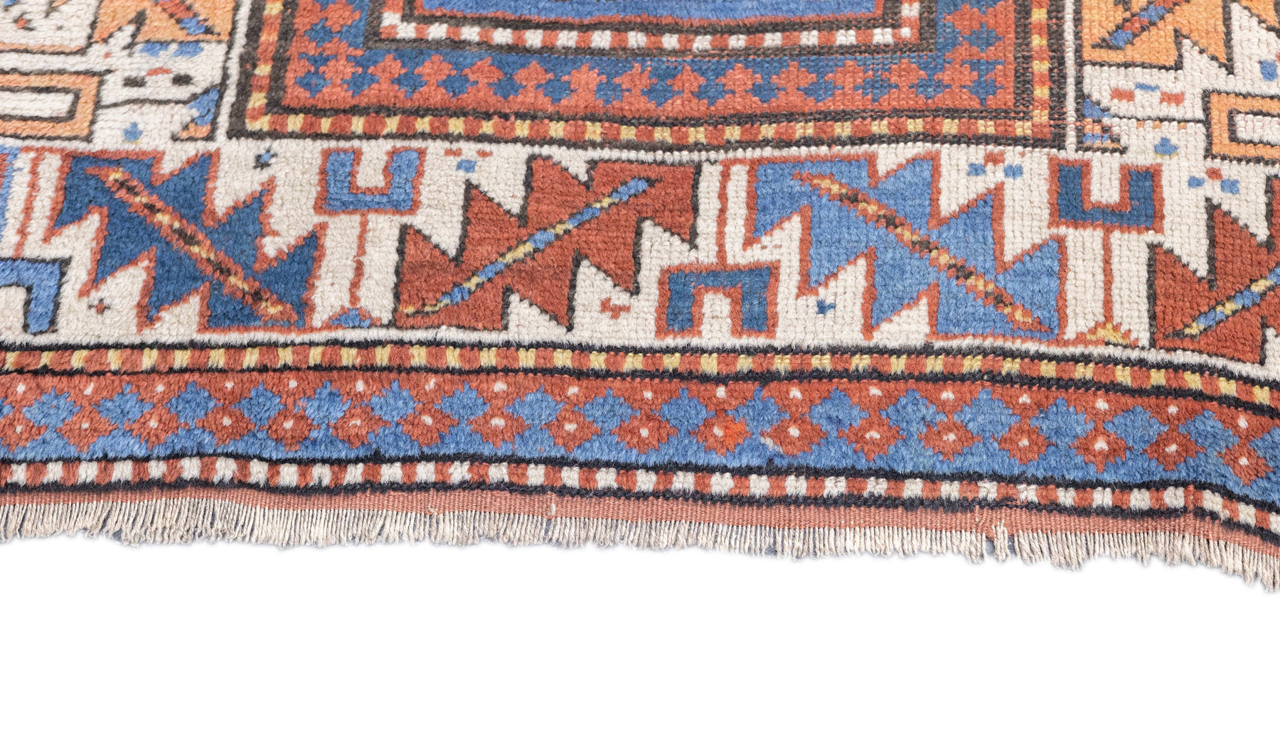 This thick pile, moderately coarsely woven SW Caucasian scatter presents seven rust and ecru hooked diamonds on an abrashed light-medium blue narrow field. Main bold strip style border with a colorful calyx and slanted, serrate leaf design. Minor borders in rust/light blue keyhole reciprocal patterns. All wool construction. Good condition.