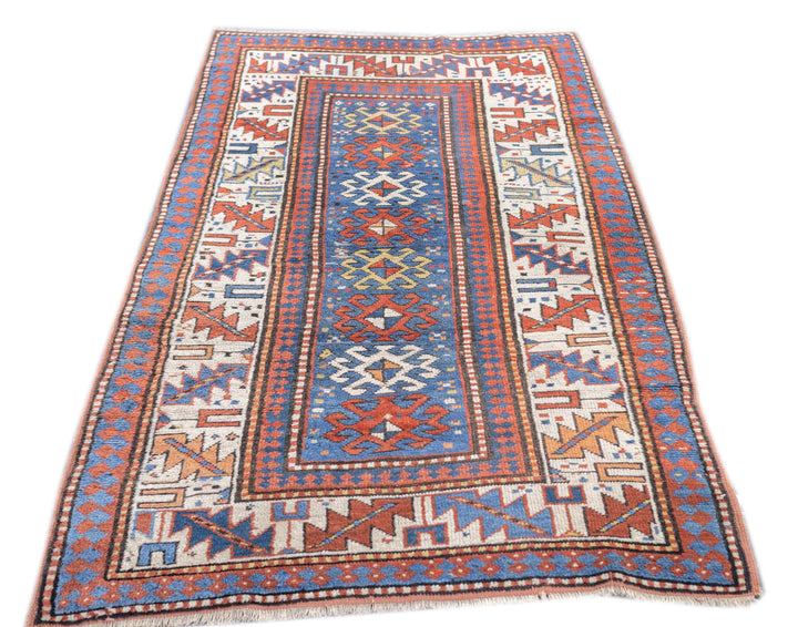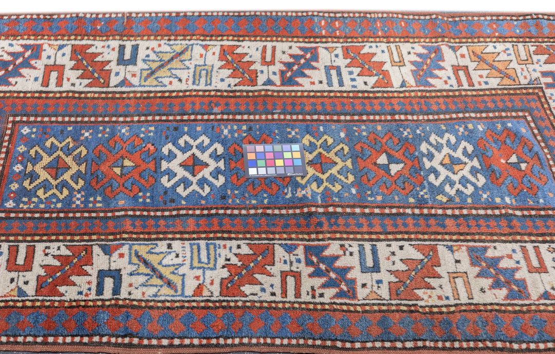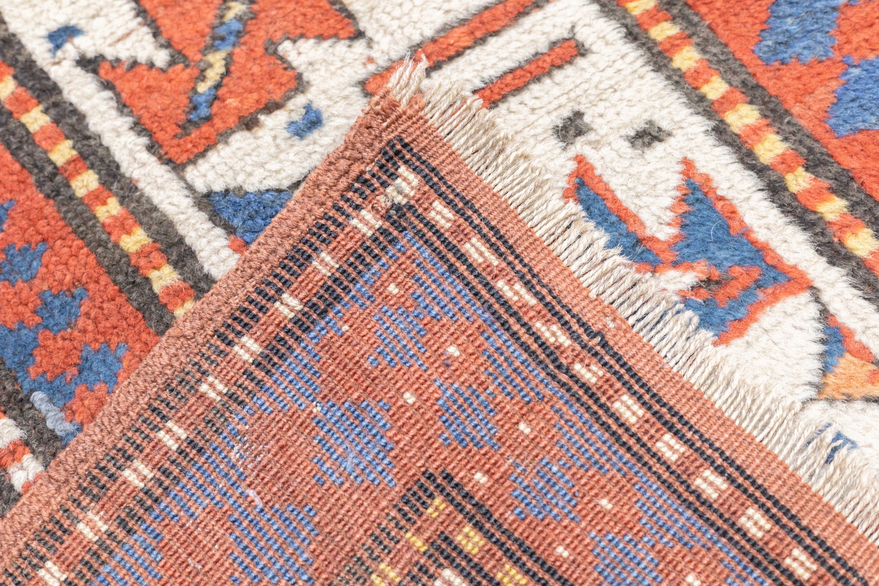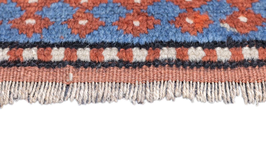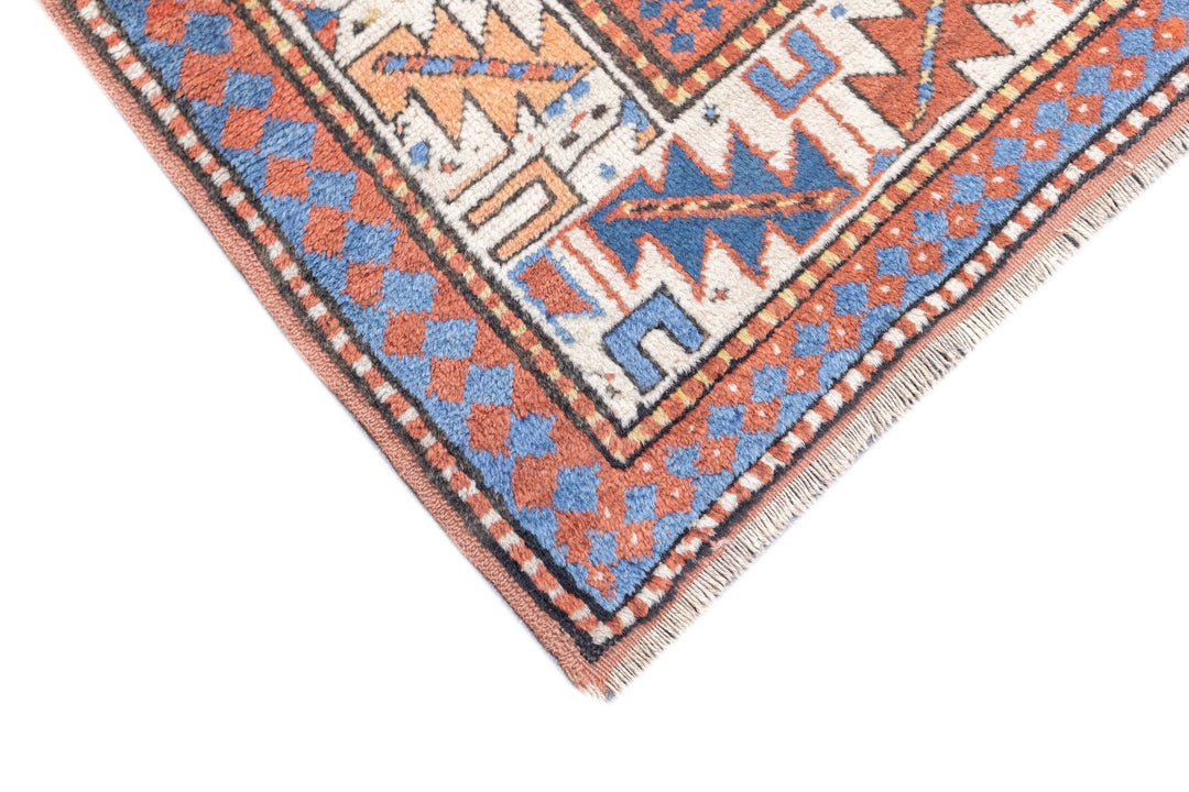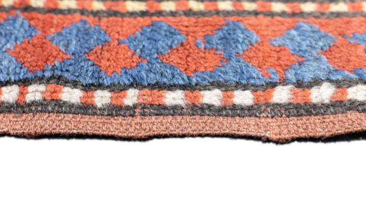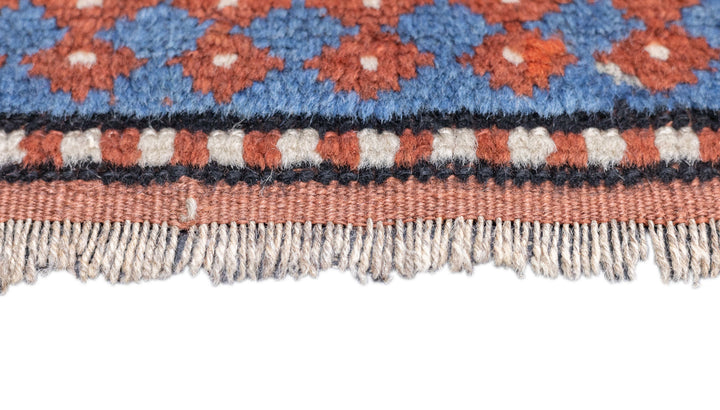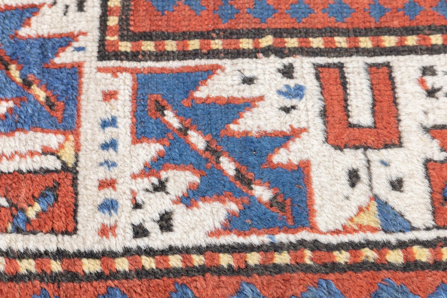 This thick pile, moderately coarsely woven SW Caucasian scatter presents seven rust and ecru hooked diamonds on an abrashed light-medium blue narrow field. Main bold strip style border with a colorful calyx and slanted, serrate leaf design. Minor borders in rust/light blue keyhole reciprocal patterns. All wool construction. Good condition.
