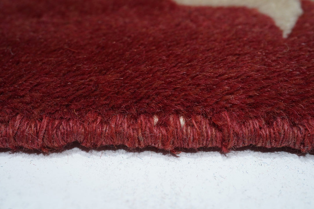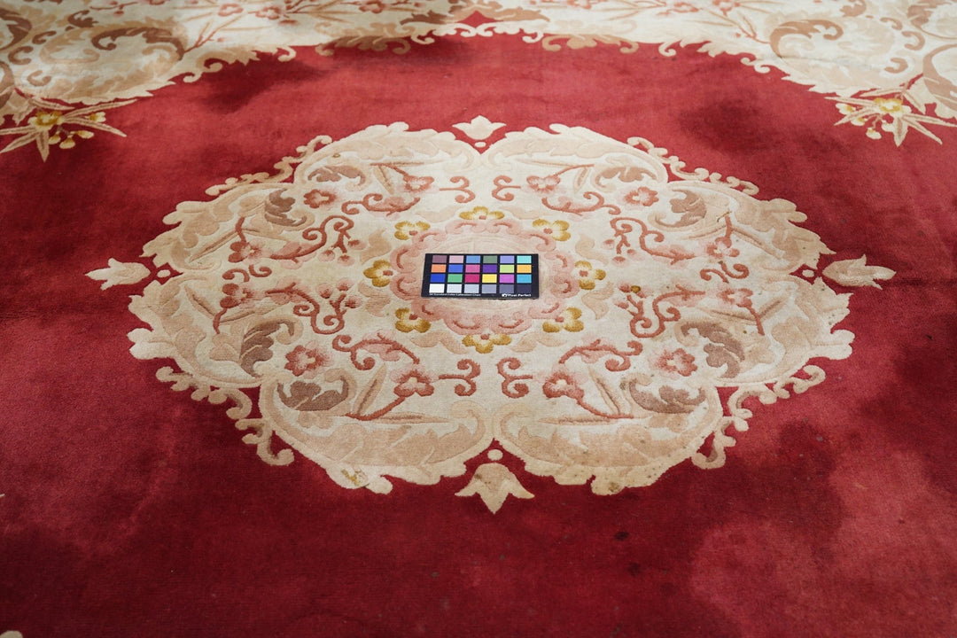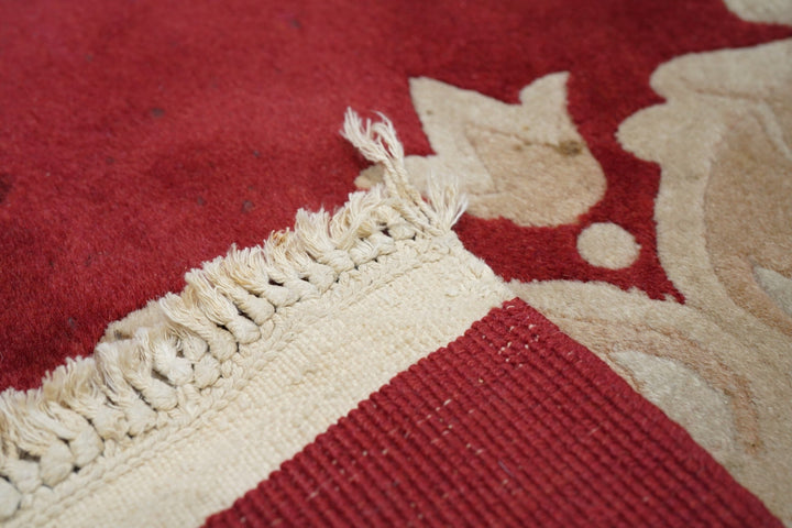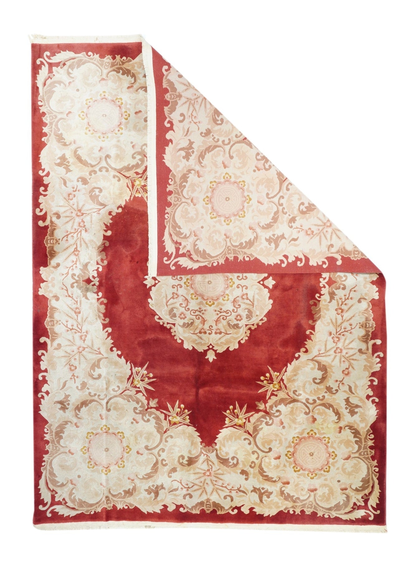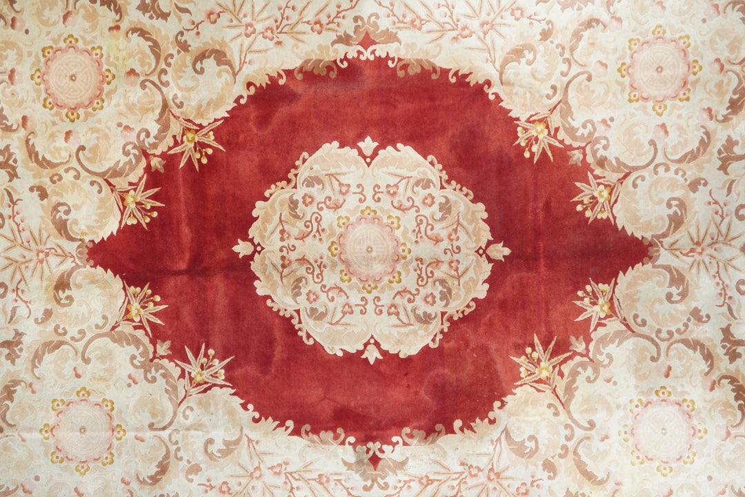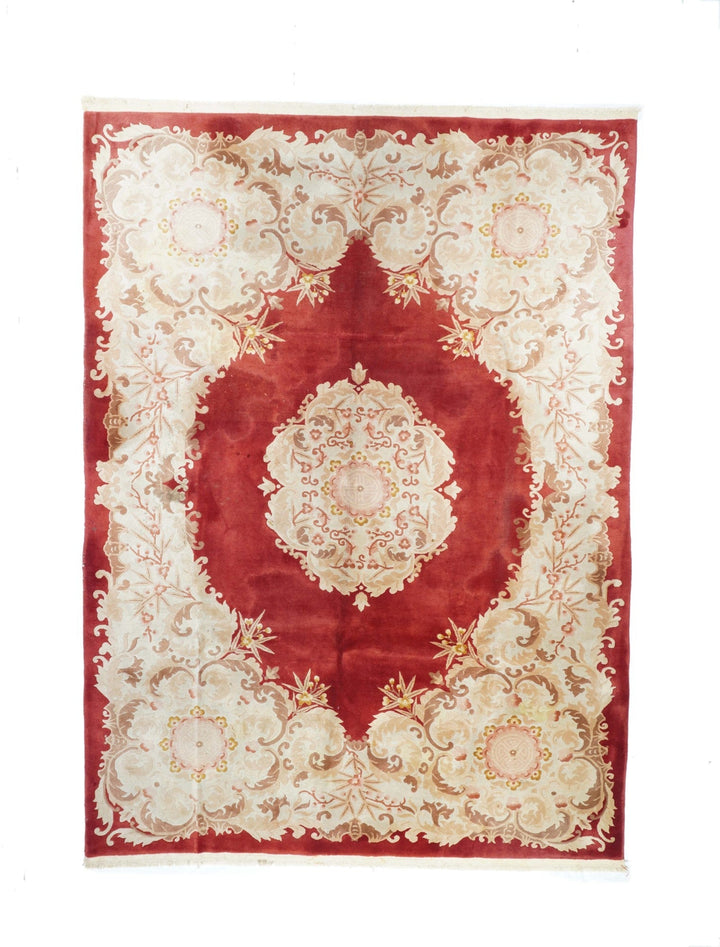 In the Franco-Kerman style, the scarlet field shows an elliptical, eight lobe cream medallion with en suite corners developing into cream sections with bamboo stems. Central round sub-medallion. Red outer plain edge. Contour sculpted outlines. Medium weave on cotton foundation. Heavy weave. As new condition.