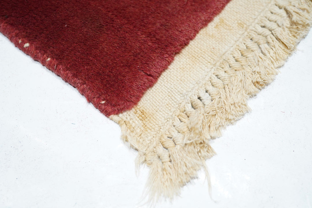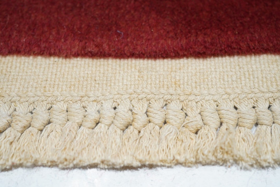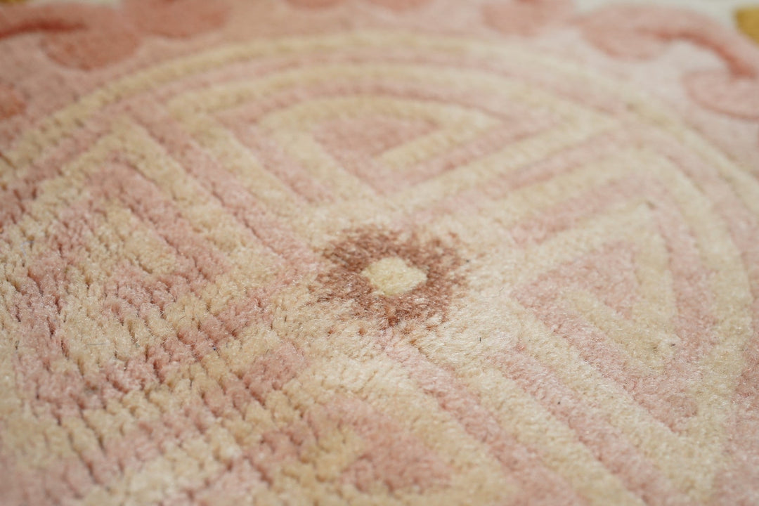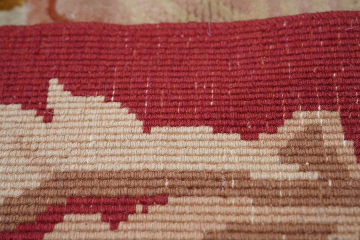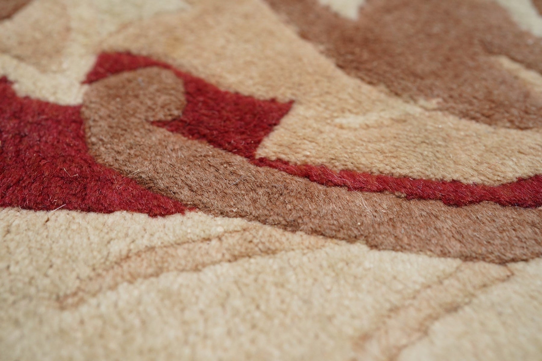 In the Franco-Kerman style, the scarlet field shows an elliptical, eight lobe cream medallion with en suite corners developing into cream sections with bamboo stems. Central round sub-medallion. Red outer plain edge. Contour sculpted outlines. Medium weave on cotton foundation. Heavy weave. As new condition.