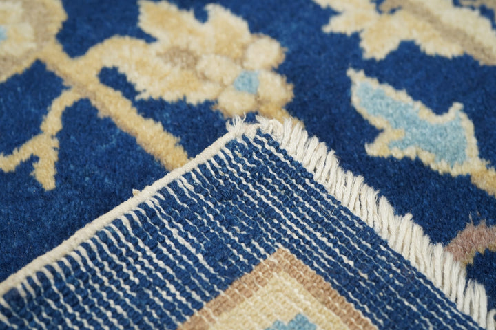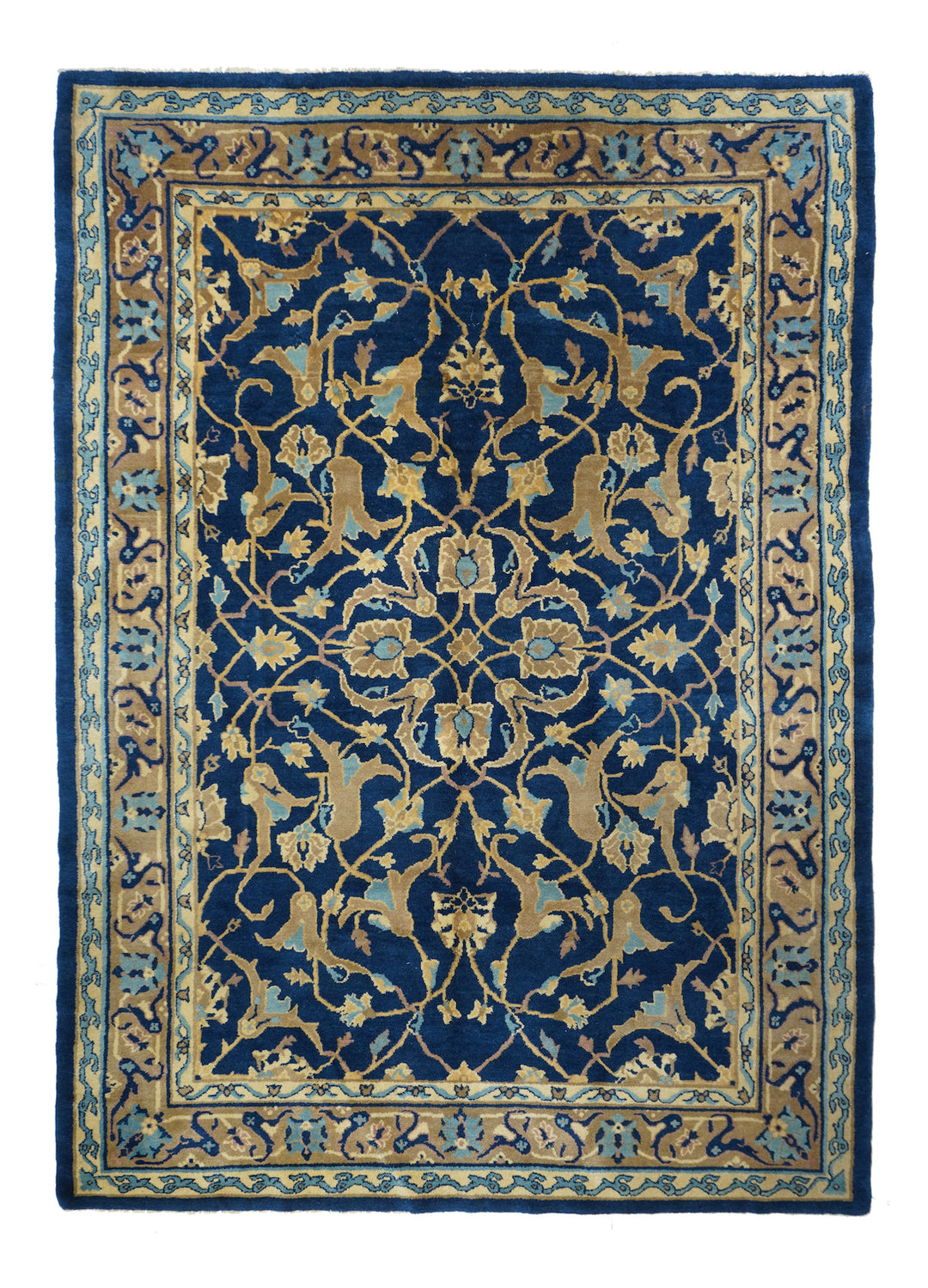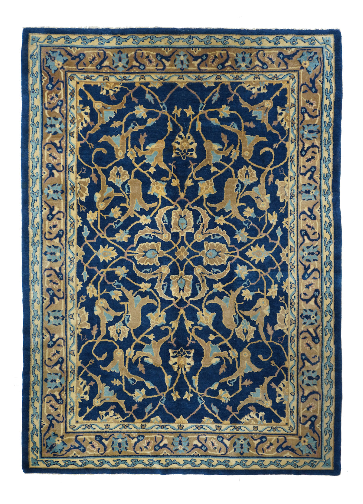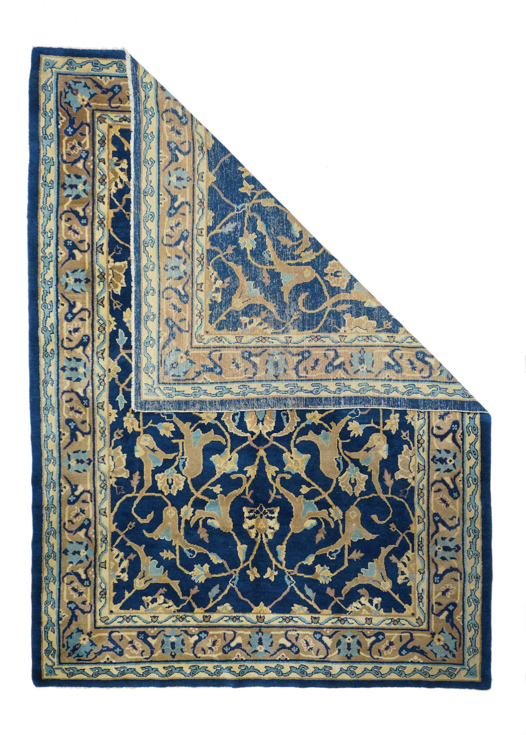 From the short Post-WWI period when Chinese weavers copied Persian pieces which were then in short supply. The dark blue field displays a two level arabesque and forked leaf pattern around a central four palmette motif. Rose-coral border with bitonal oval palmettes and lavishly split leaves. Cotton foundation, medium workshop weave. Good condition. "Sino-Persian" carpet.