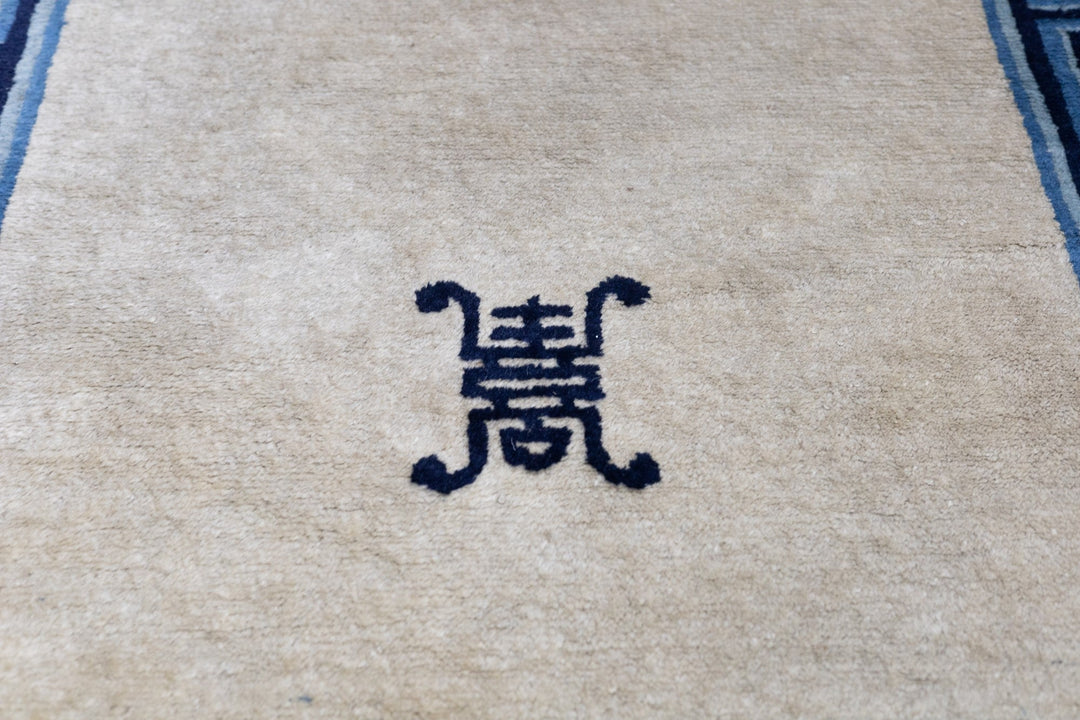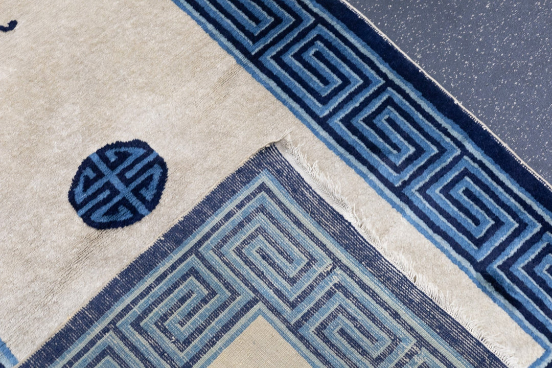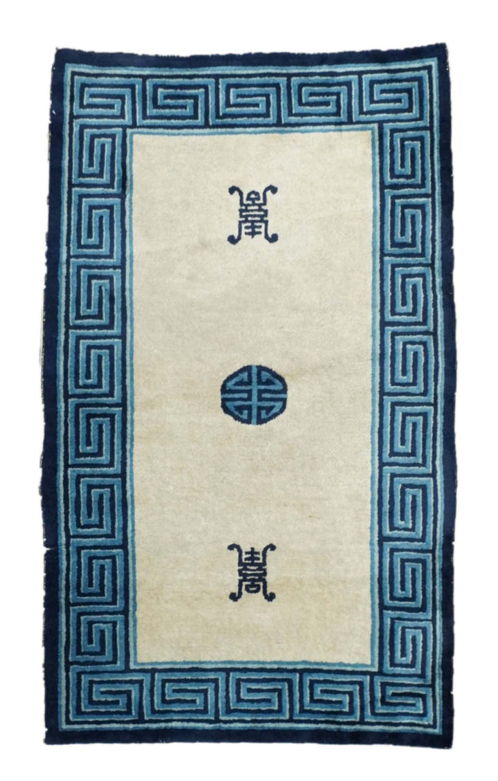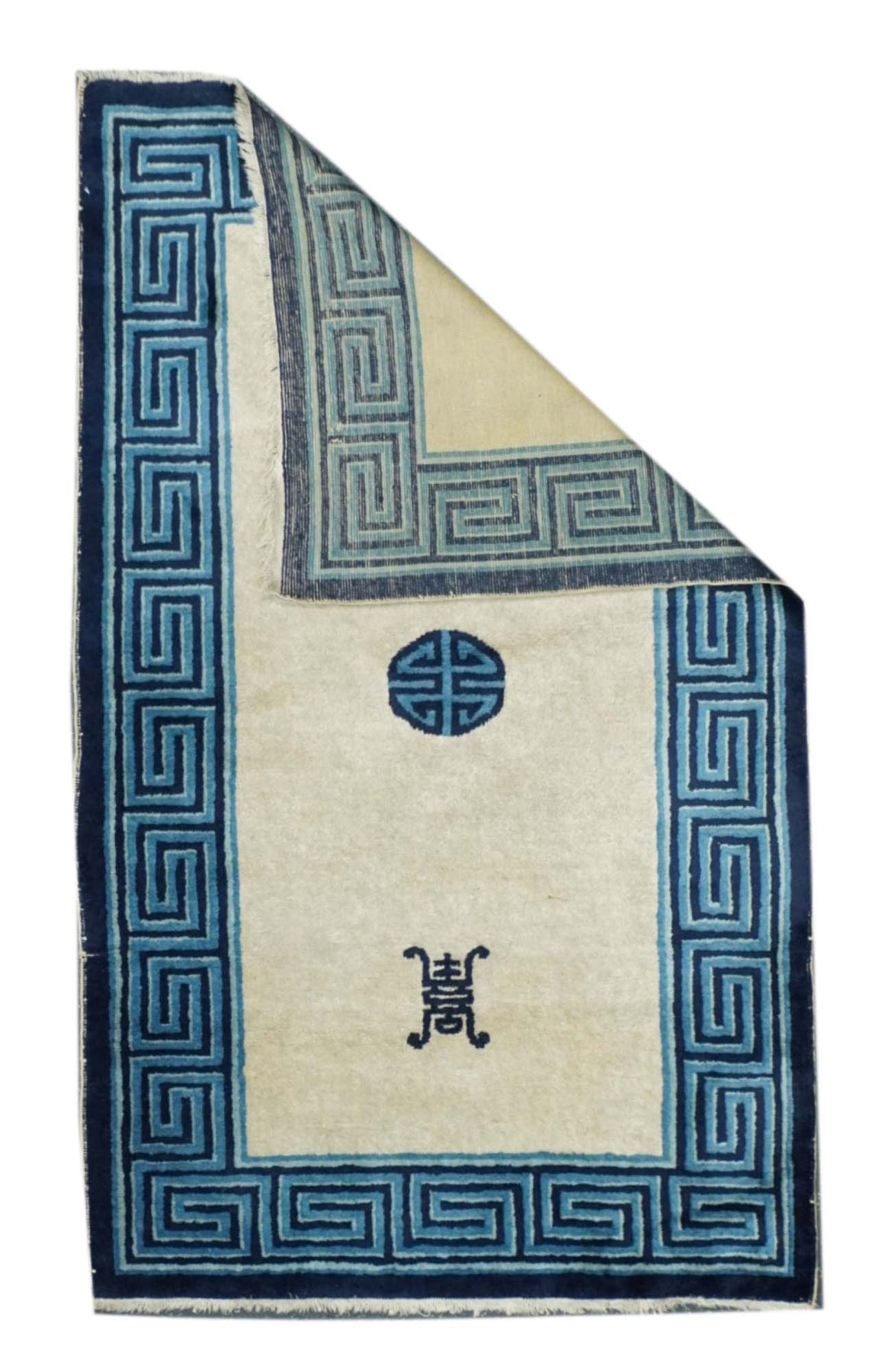 The Chinese carpets from the 19th century onward, in traditional patterns, often blue-and-white, in room sizes, scatters, and runners. A few pictorials. Moderate to medium weaves, cotton foundations. Medallions primarily.