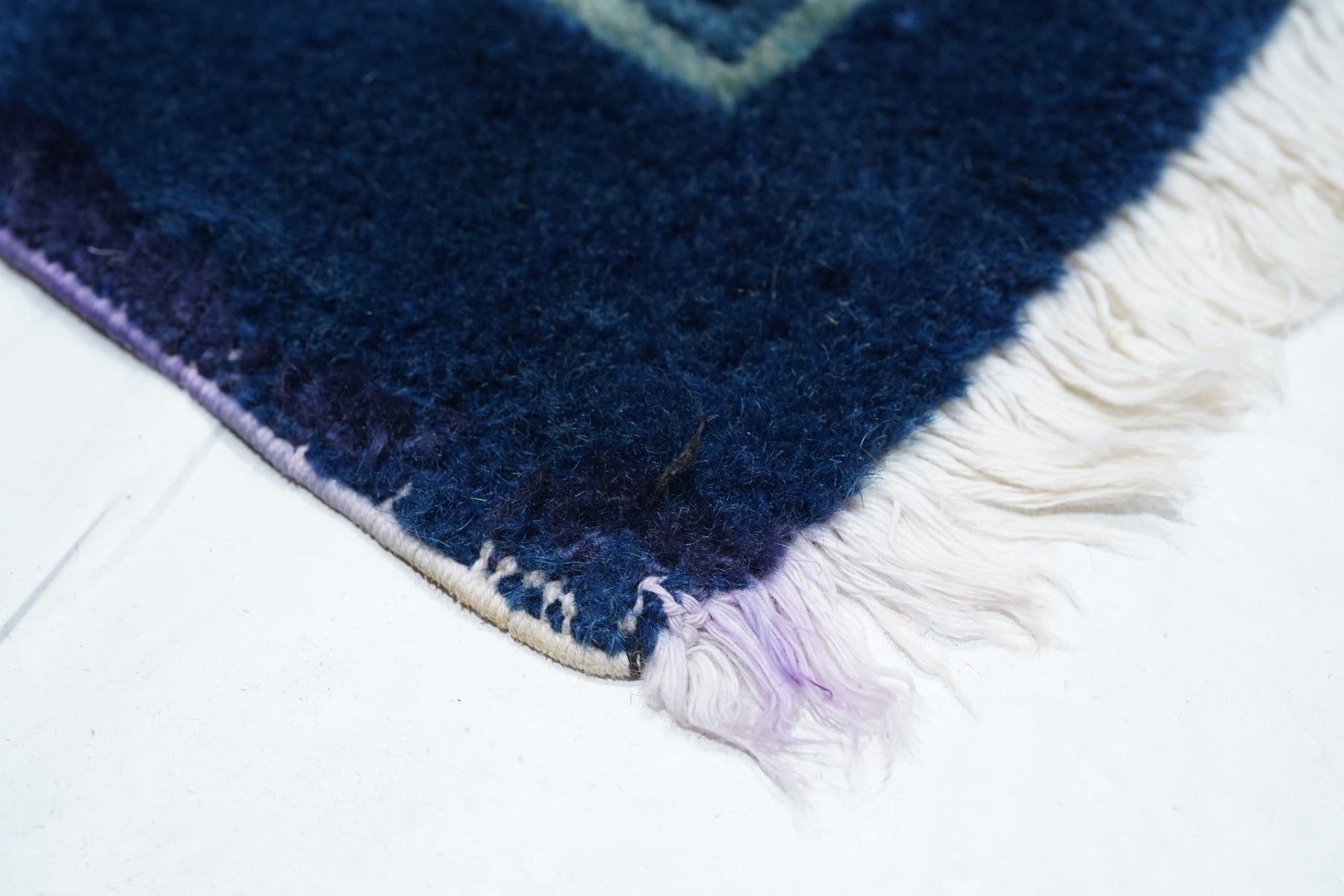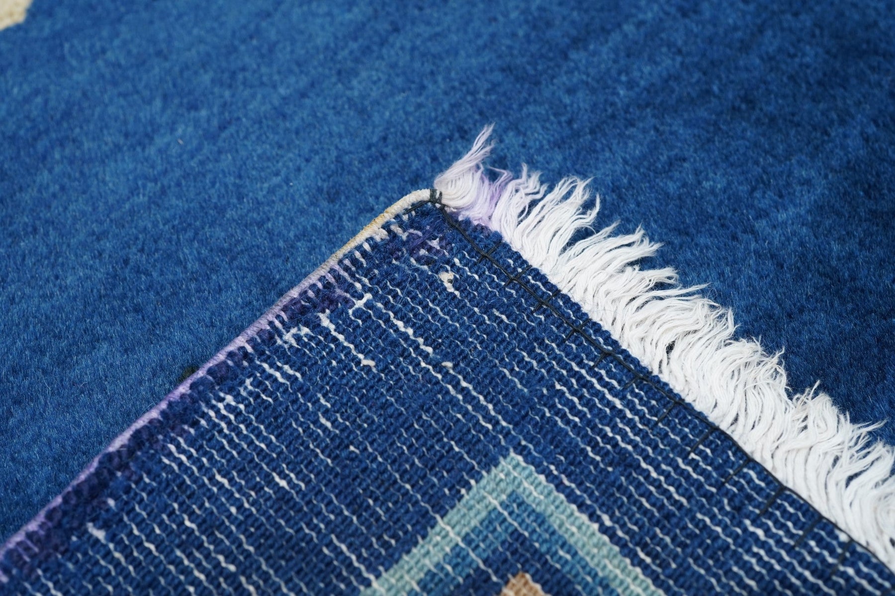 The sapphire blue field shows a round, open medallion with floral stems arranged around a micro-landscape. Short floral sprays float in the field. Triangular open corners echo the medallion. Main buff border with curling tendrils and lotus palmettes. Solid dark blue outer border. Moderate/medium weave. Thick pile. Good condition.