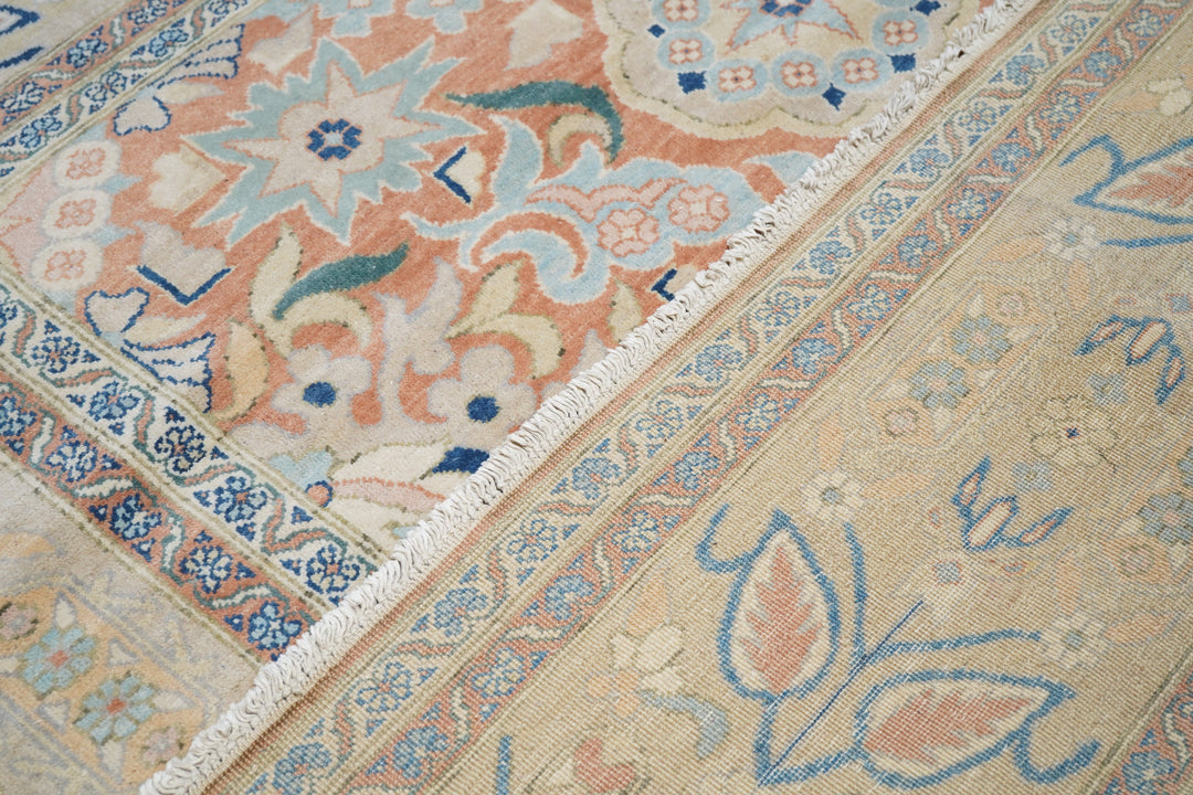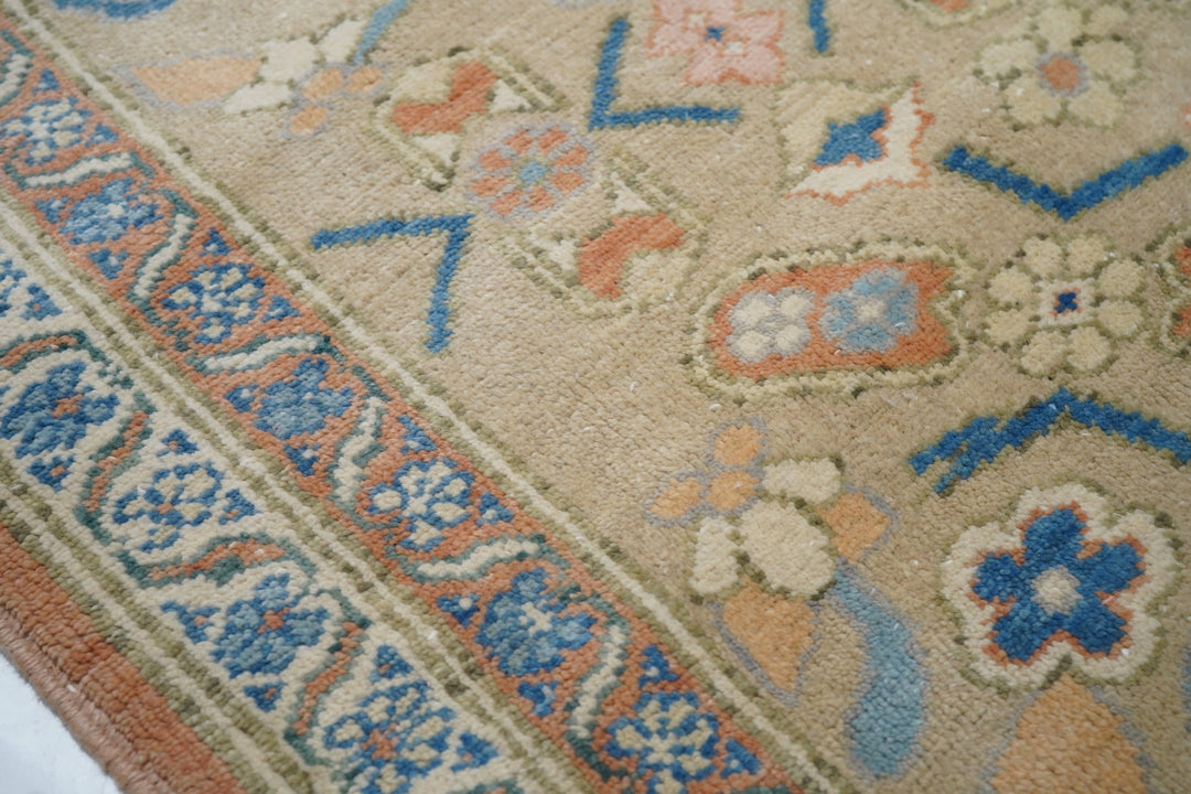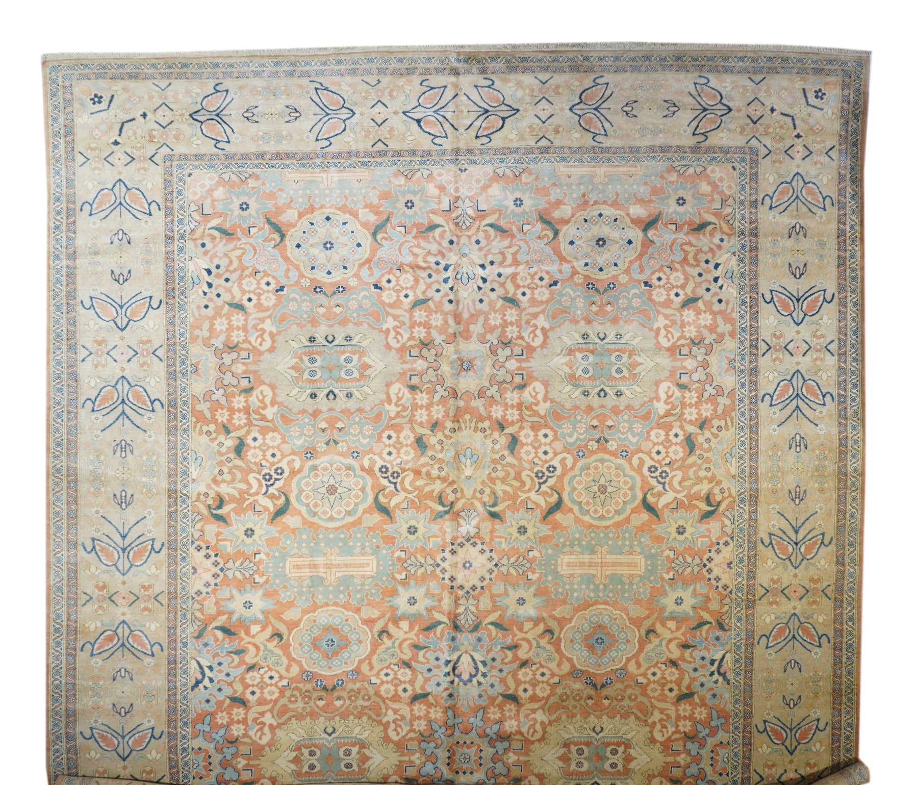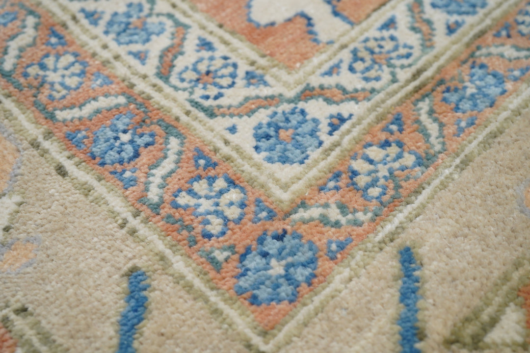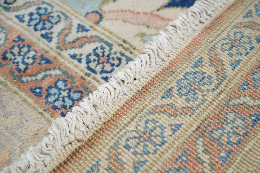Modern carpet production in Egypt began in the 1960's, in light tones, predominantly light rust, sand, straw, pale blue, pale green, with touches in deeper blue. Moderate/coarse weave. Medium length wool pile. New condition.