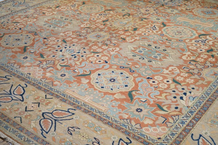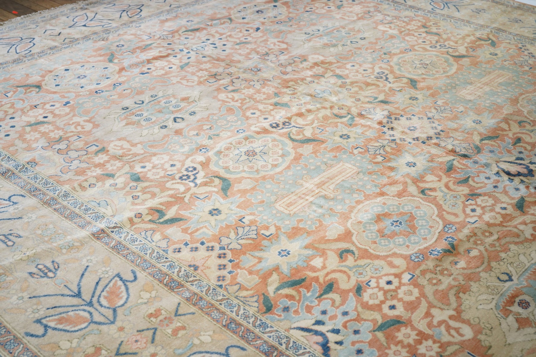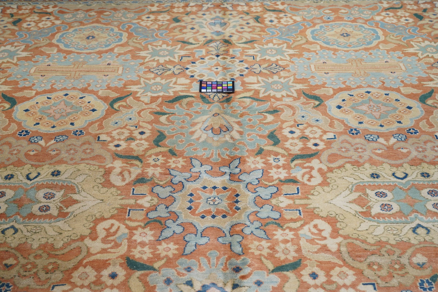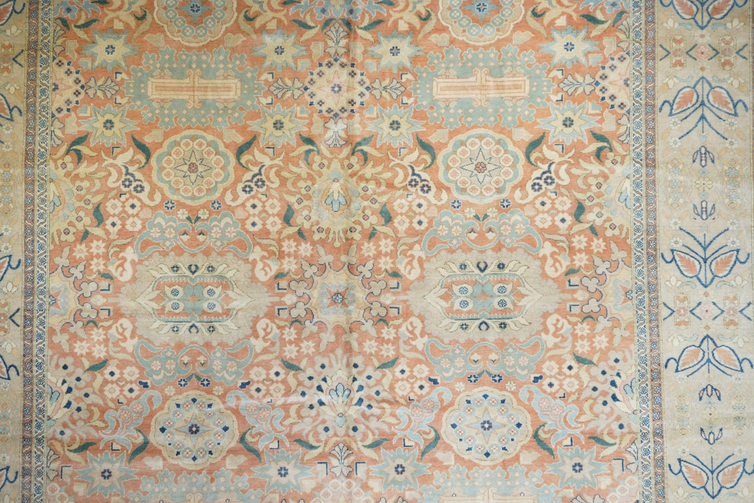 Modern carpet production in Egypt began in the 1960's, in light tones, predominantly light rust, sand, straw, pale blue, pale green, with touches in deeper blue. Moderate/coarse weave. Medium length wool pile. New condition.