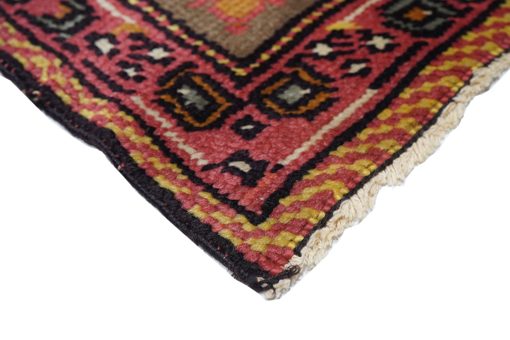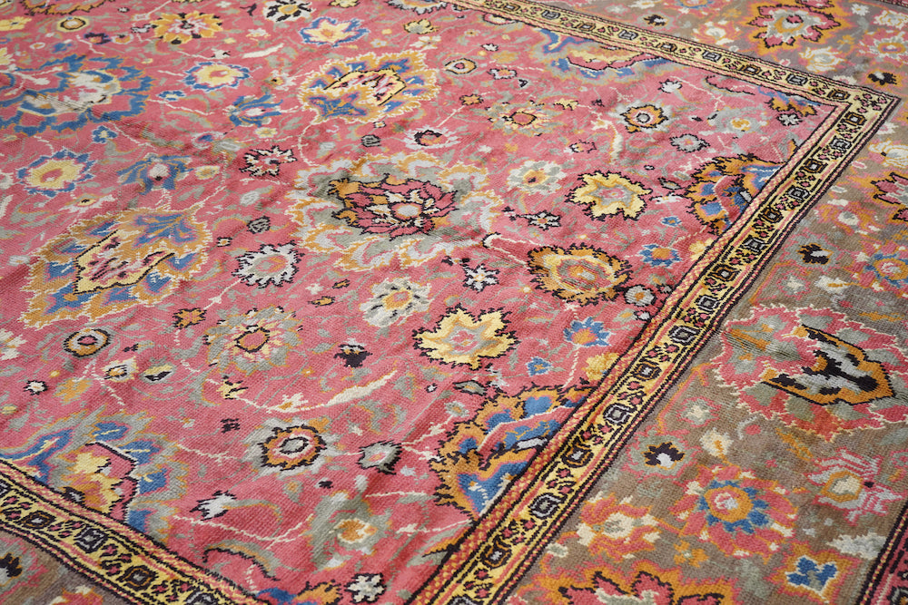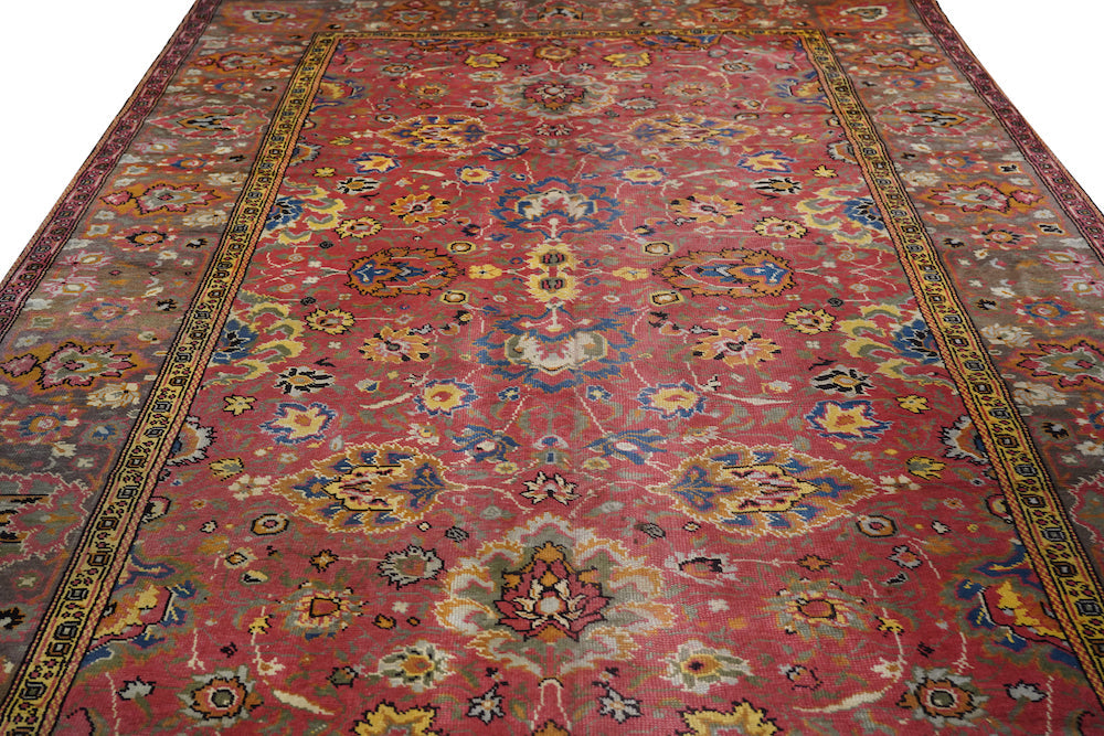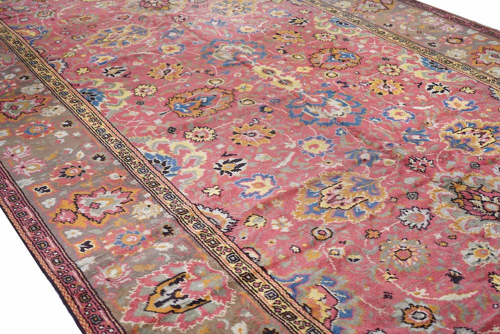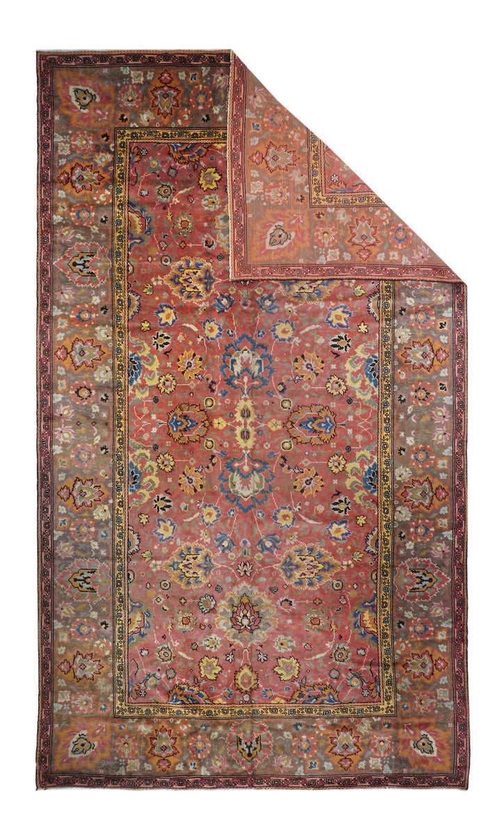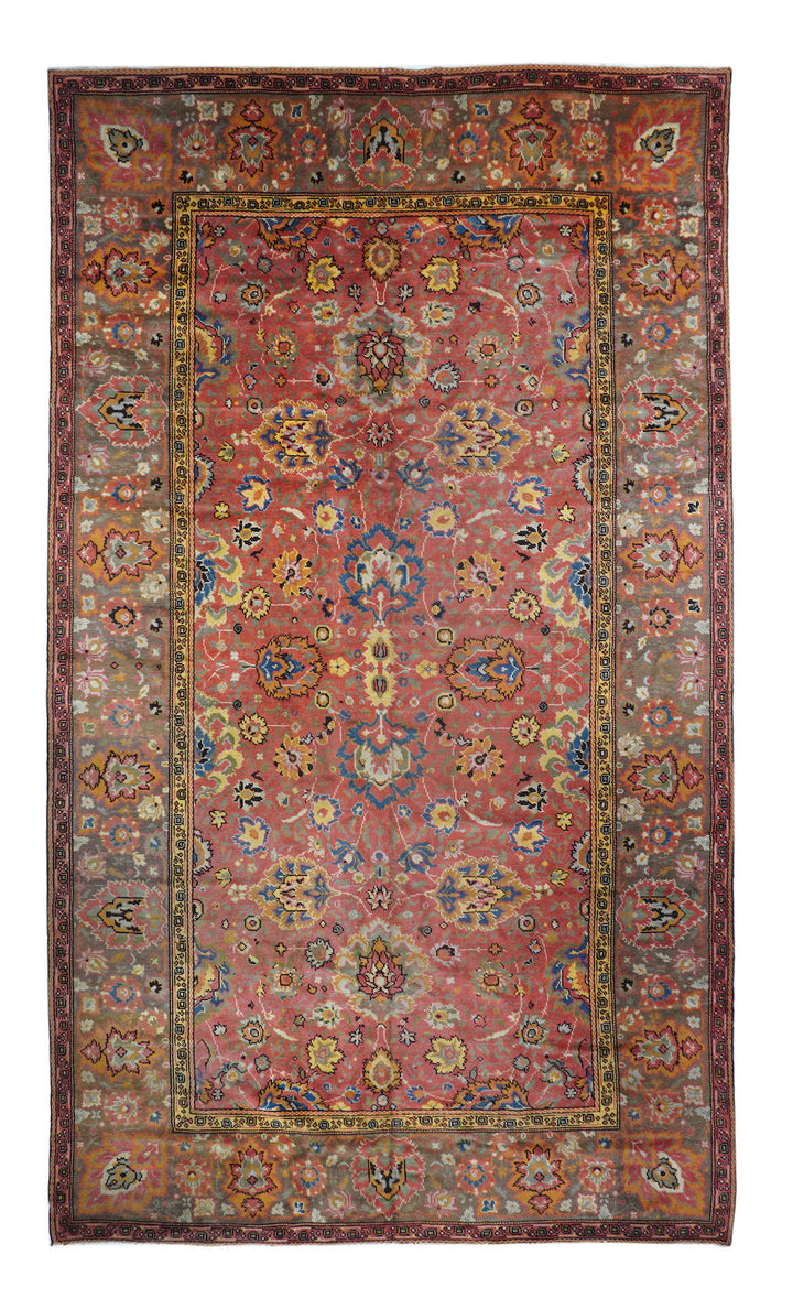 The rust-rose-salmon field shows a close rendition of the classic “In-and-out” palmette 17th century pattern around a four palmette central cross in green, black, straw yellow and light red. Light olive green main border with reversing palmettes. Diagonal palmettes in the corners. Sometimes called the “Shah ‘Abbas” design although most period carpets were woven in India. Cotton foundation and well-woven. Urban origin. Good condition.