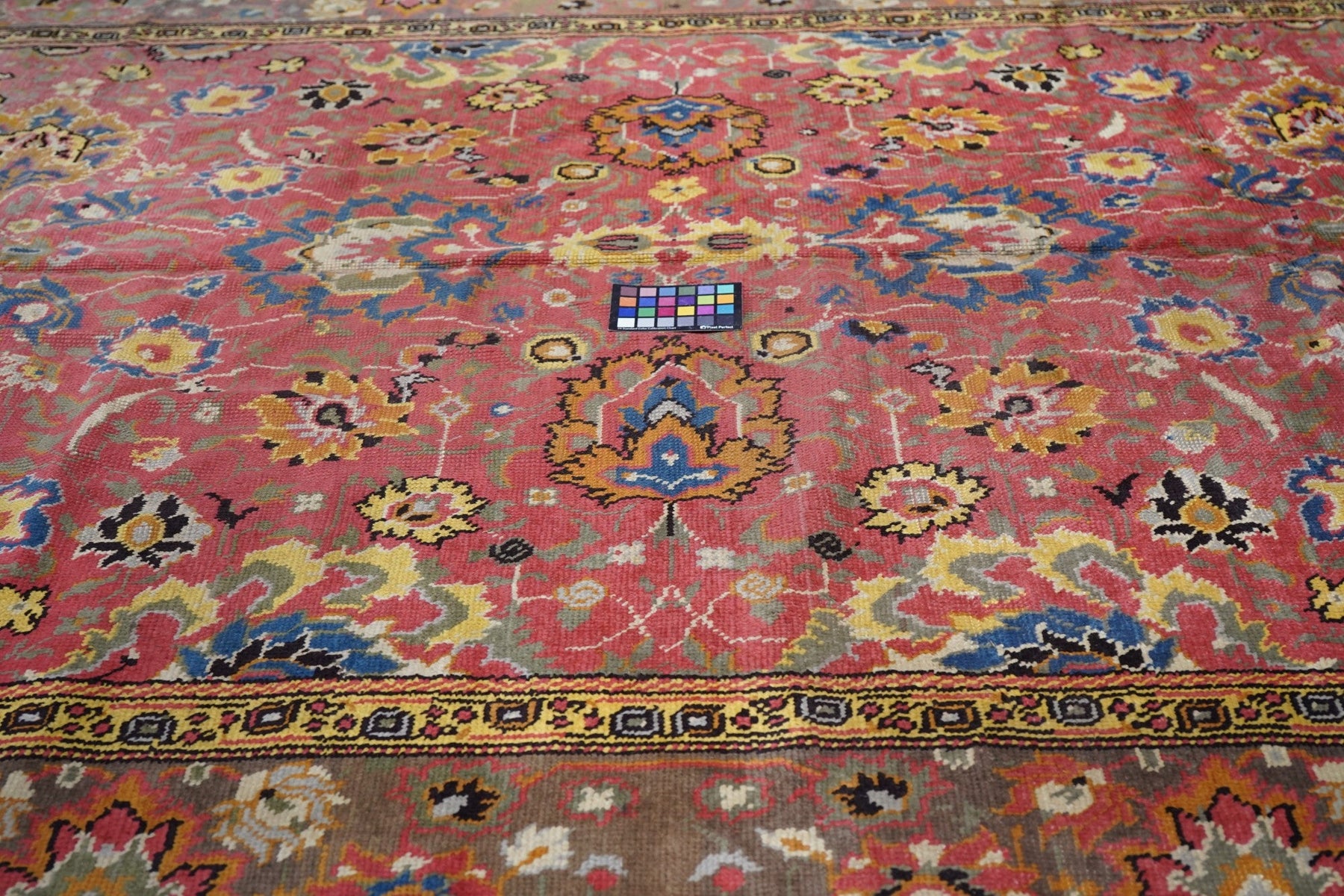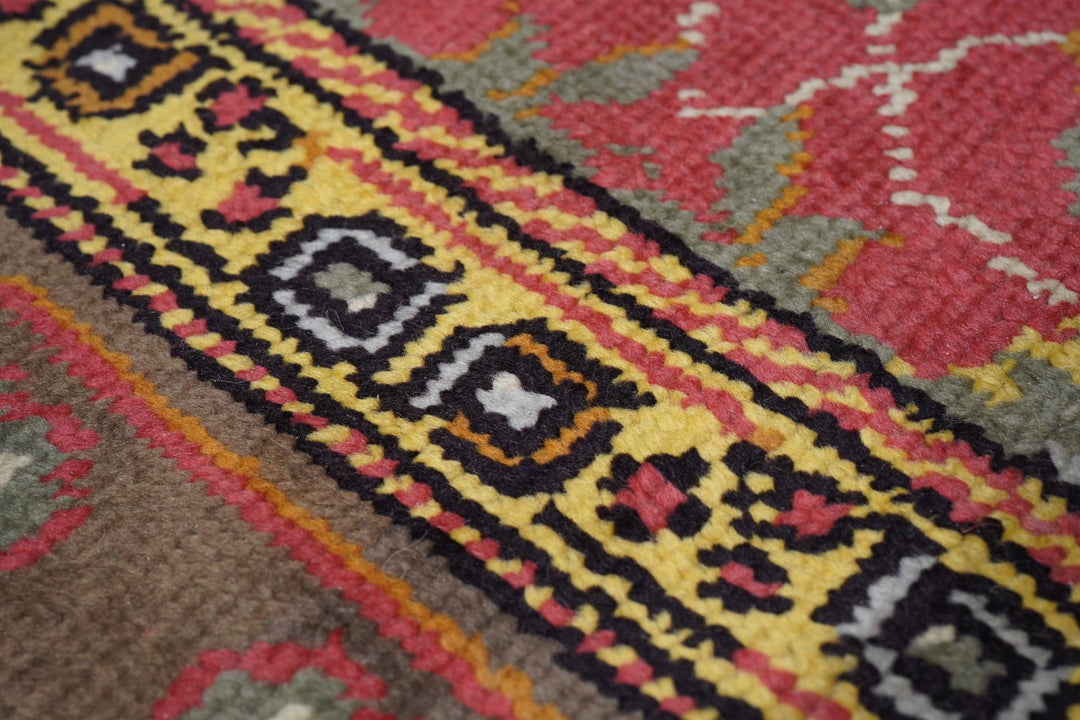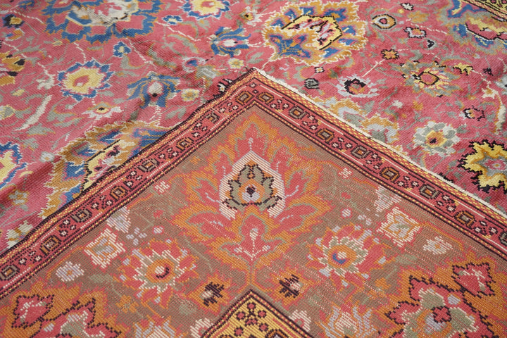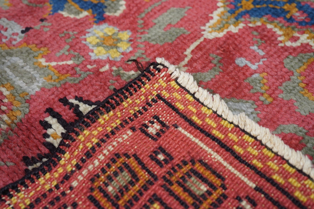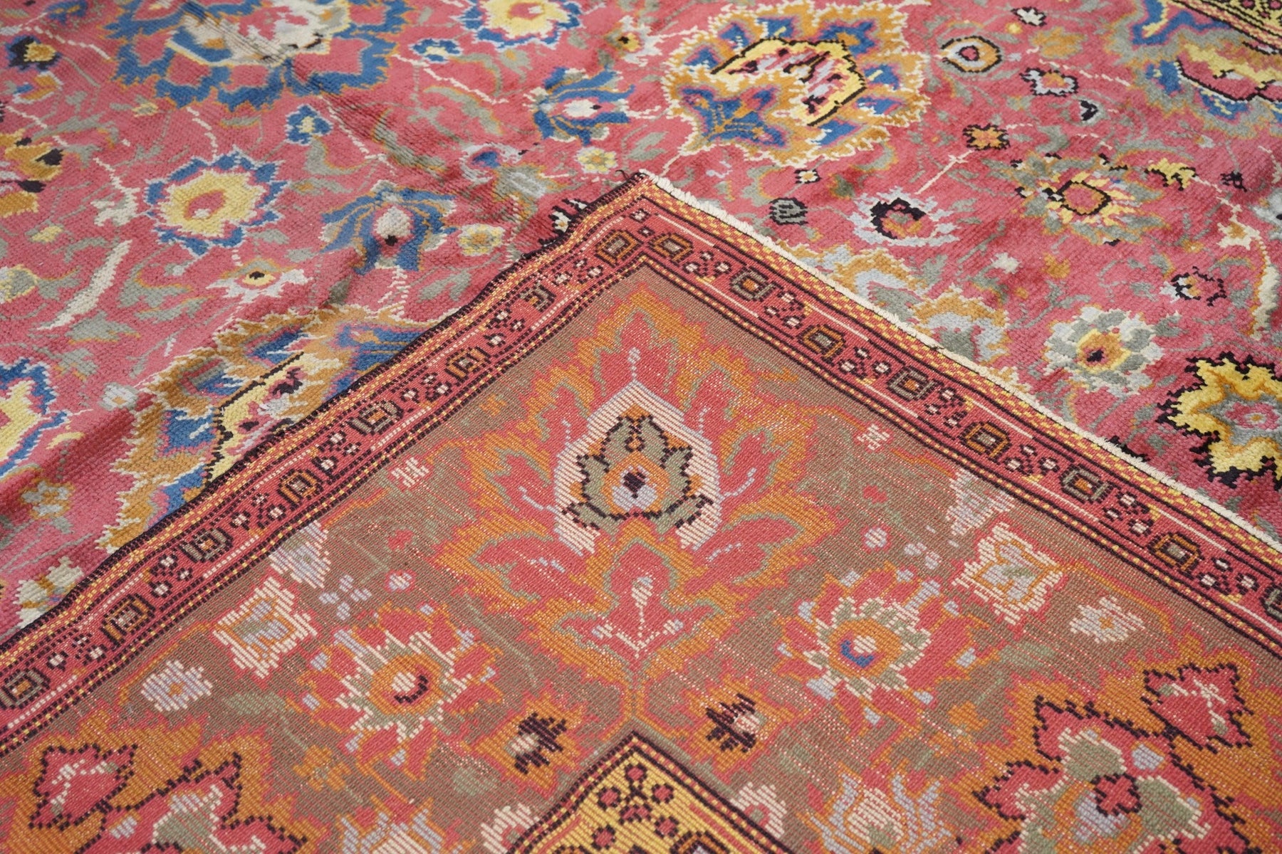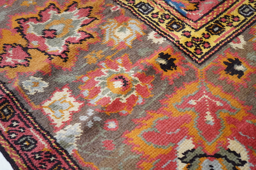 The rust-rose-salmon field shows a close rendition of the classic “In-and-out” palmette 17th century pattern around a four palmette central cross in green, black, straw yellow and light red. Light olive green main border with reversing palmettes. Diagonal palmettes in the corners. Sometimes called the “Shah ‘Abbas” design although most period carpets were woven in India. Cotton foundation and well-woven. Urban origin. Good condition.