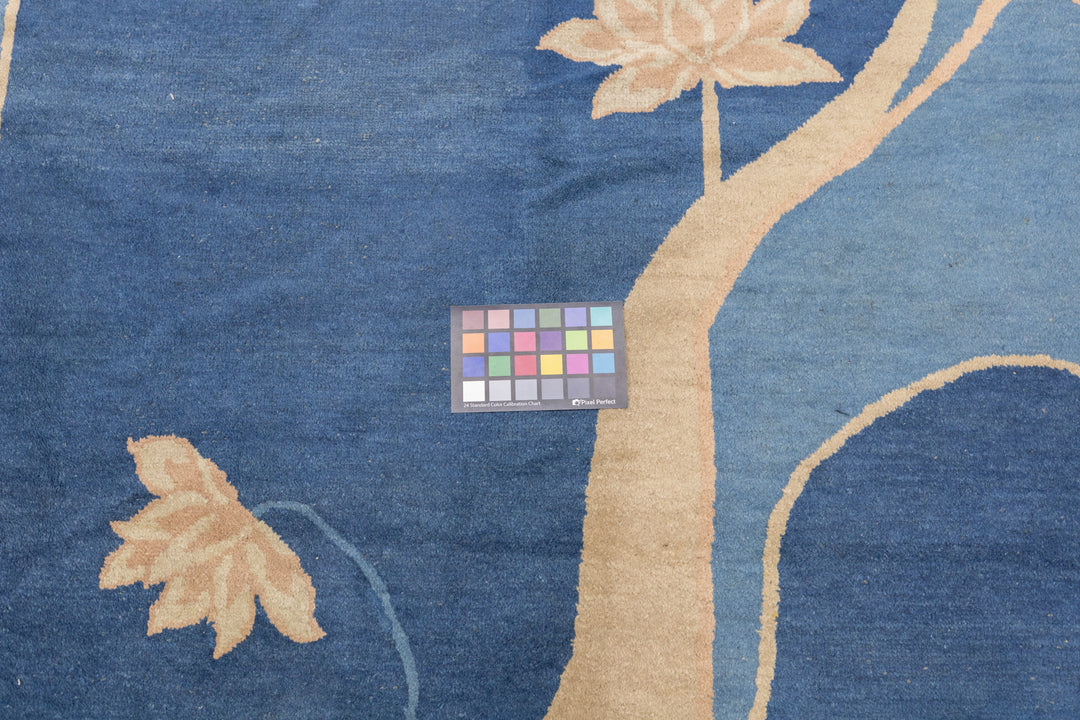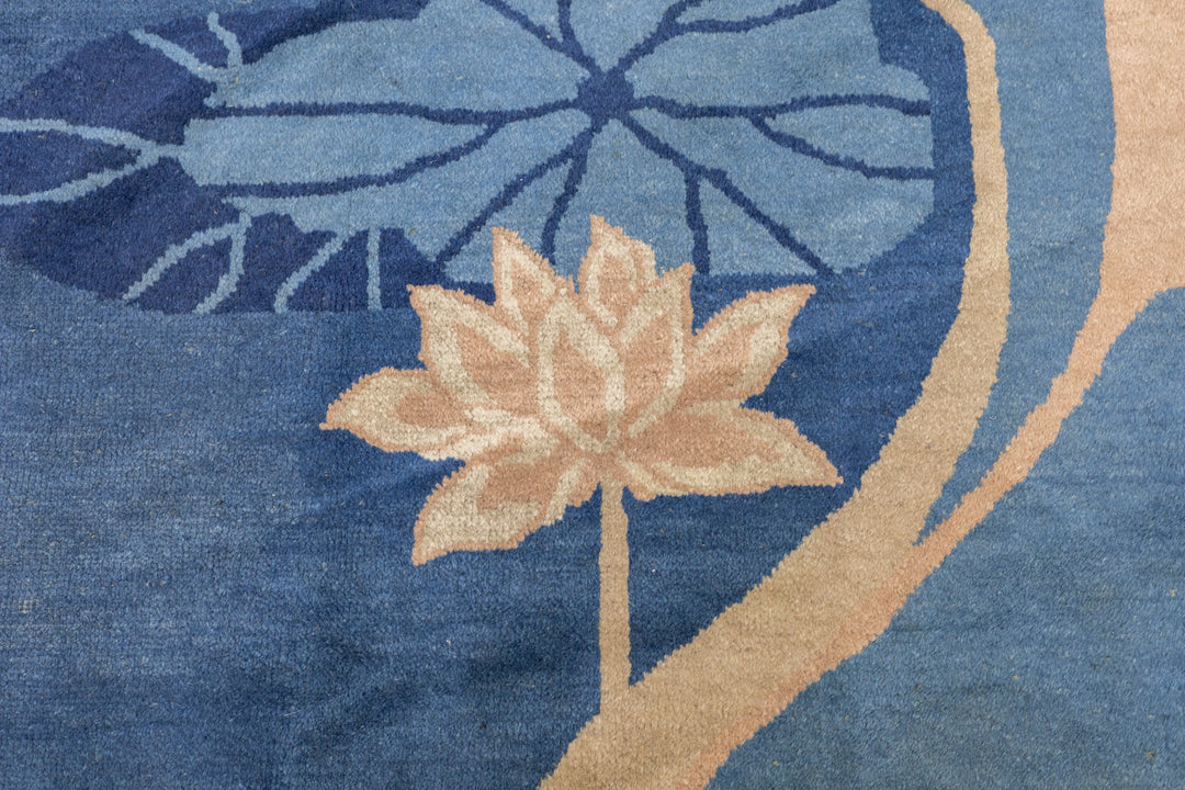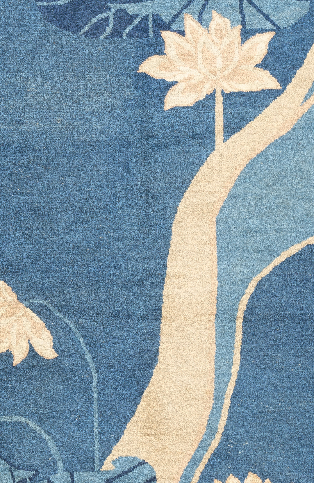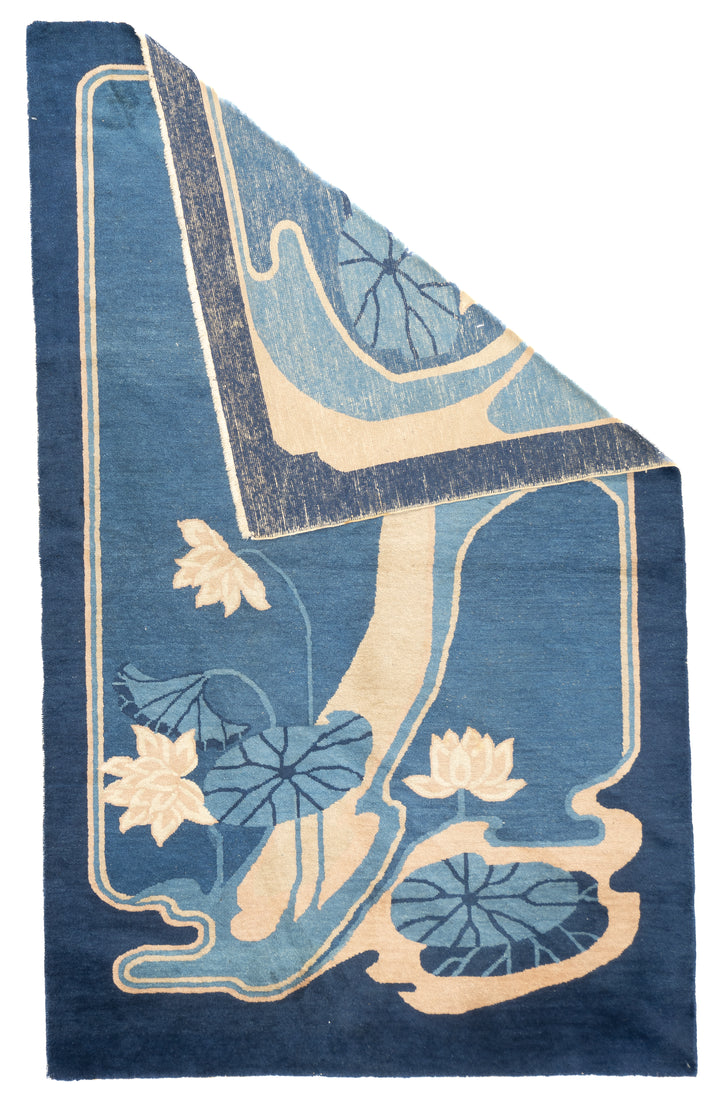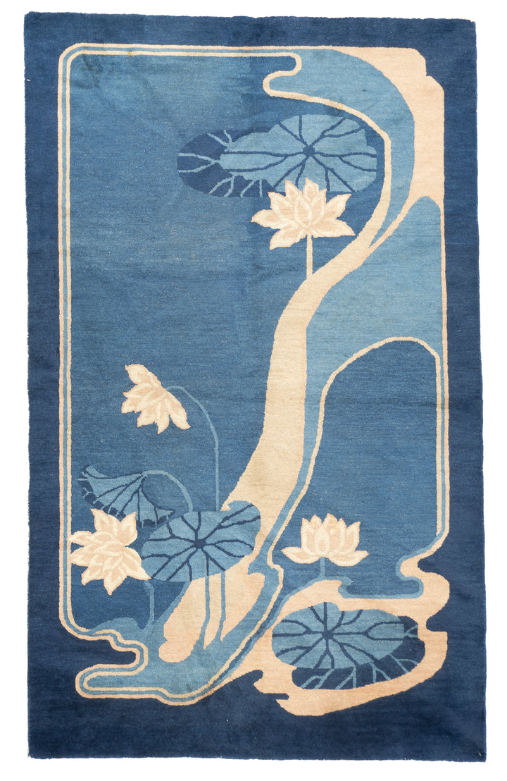 The Chinese carpets from the 19th century onward, in traditional patterns, often blue-and-white, in room sizes, scatters, and runners. A few pictorials. Moderate to medium weaves, cotton foundations. Medallions primarily.