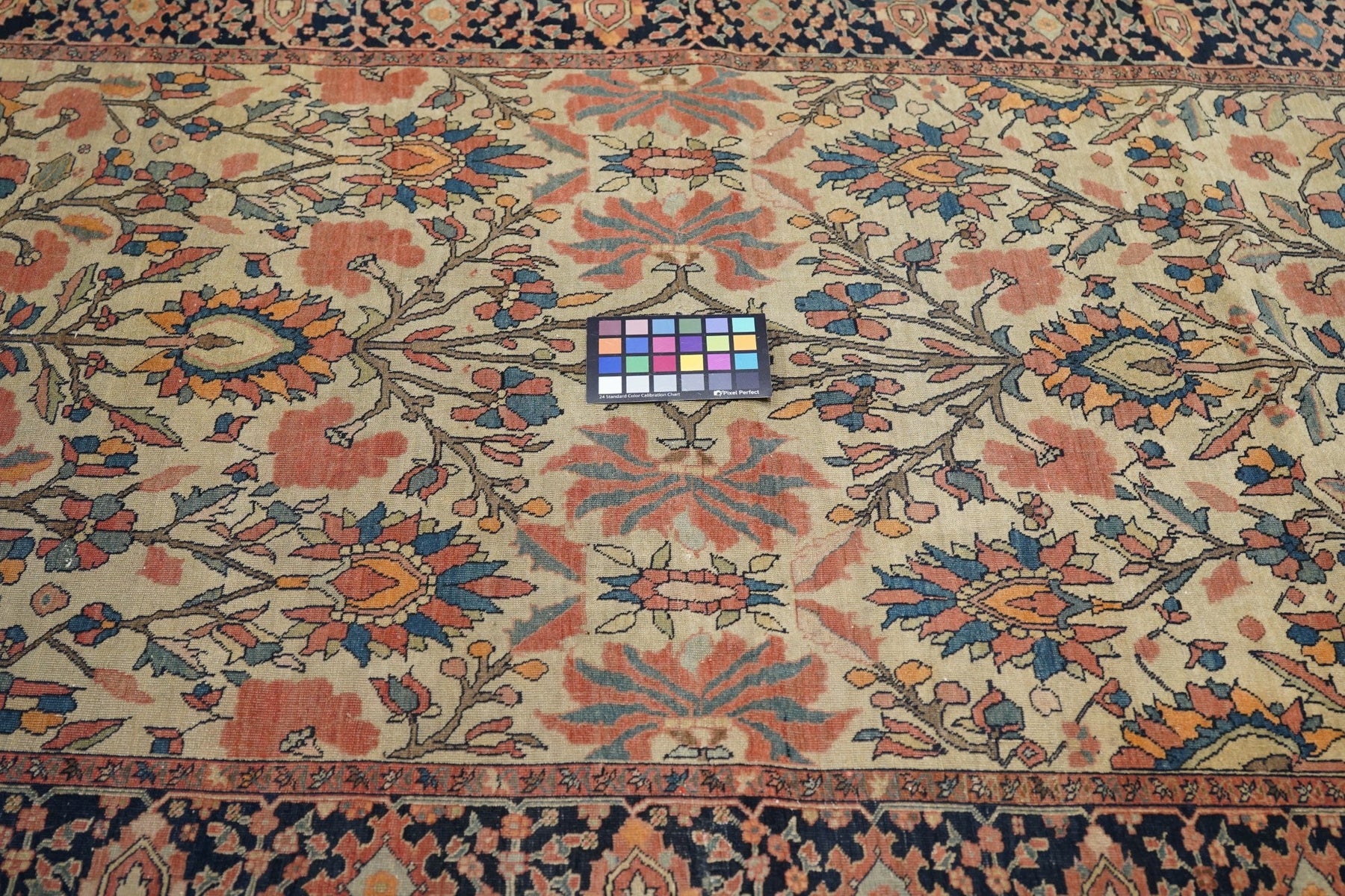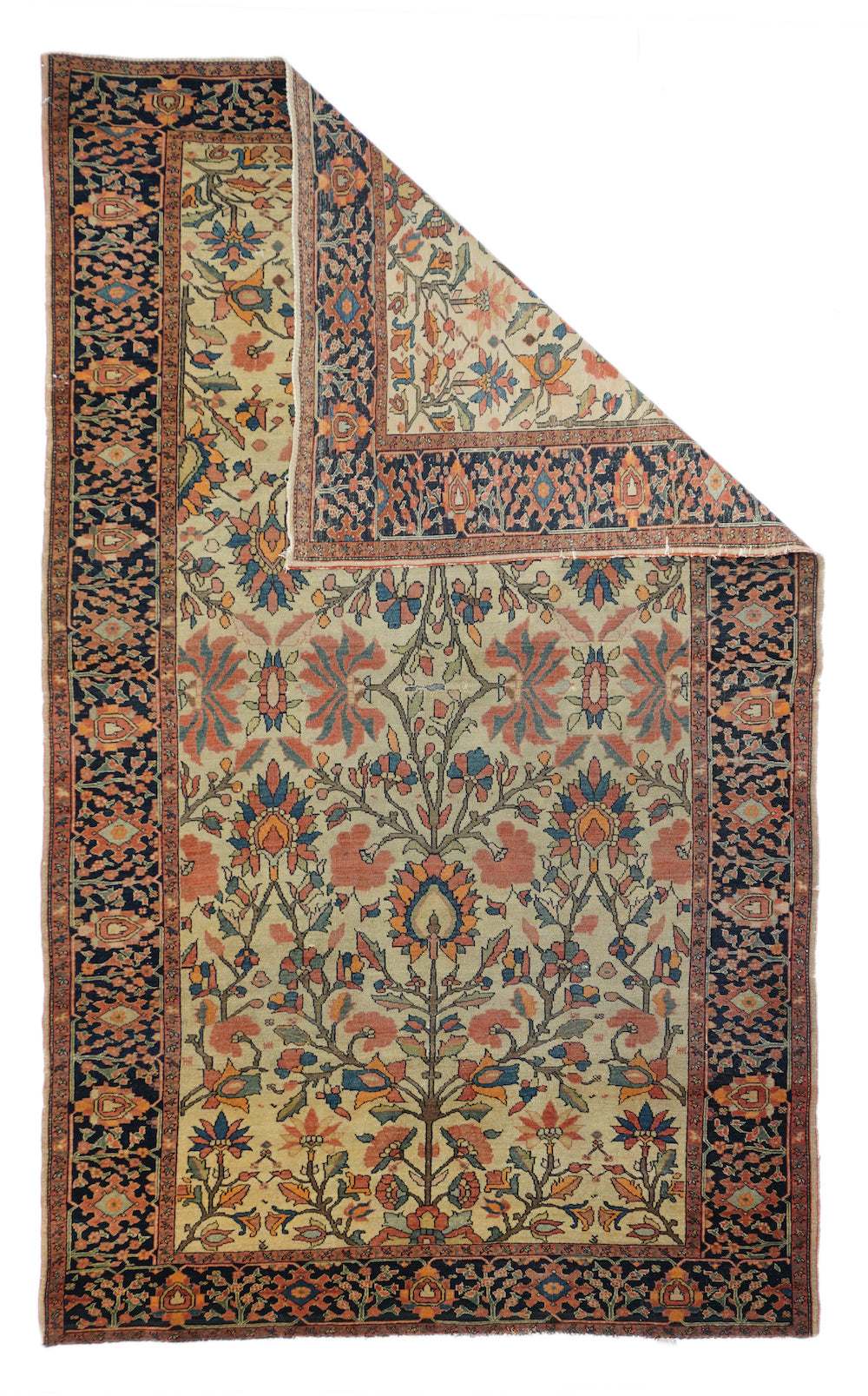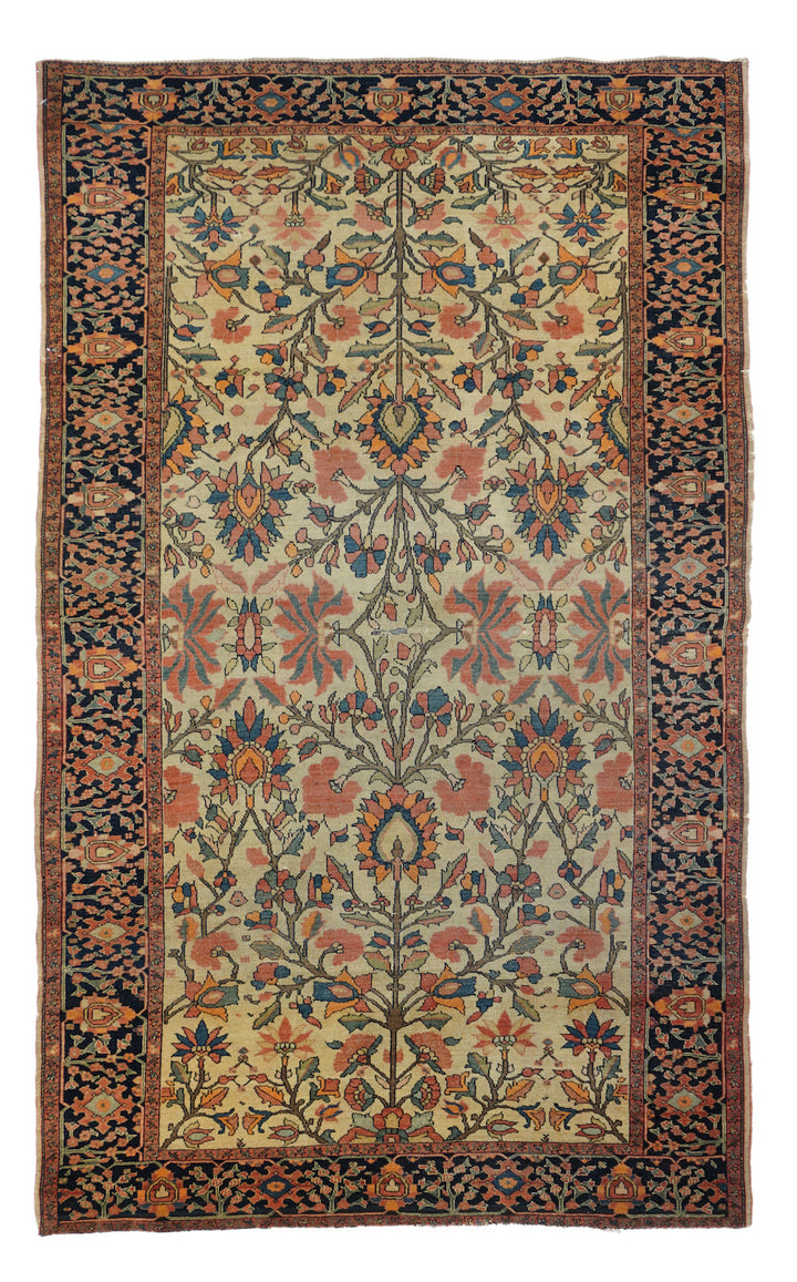 The scatter and room size pieces made in the Arak/Sultanabad area, between 1880 and 1910, with firm and leathery well-woven textures, and strong in red, navy and ecru tones, usually in medallion formats. A transition group between the earlier 19th century Farahans and the post-WWI Sarouks. Drawing is between curvilinear and angular.