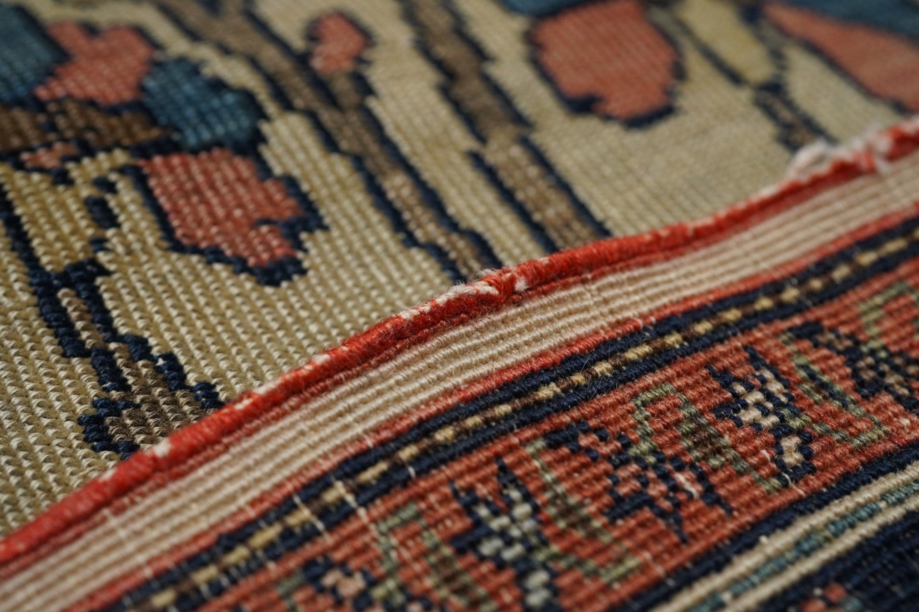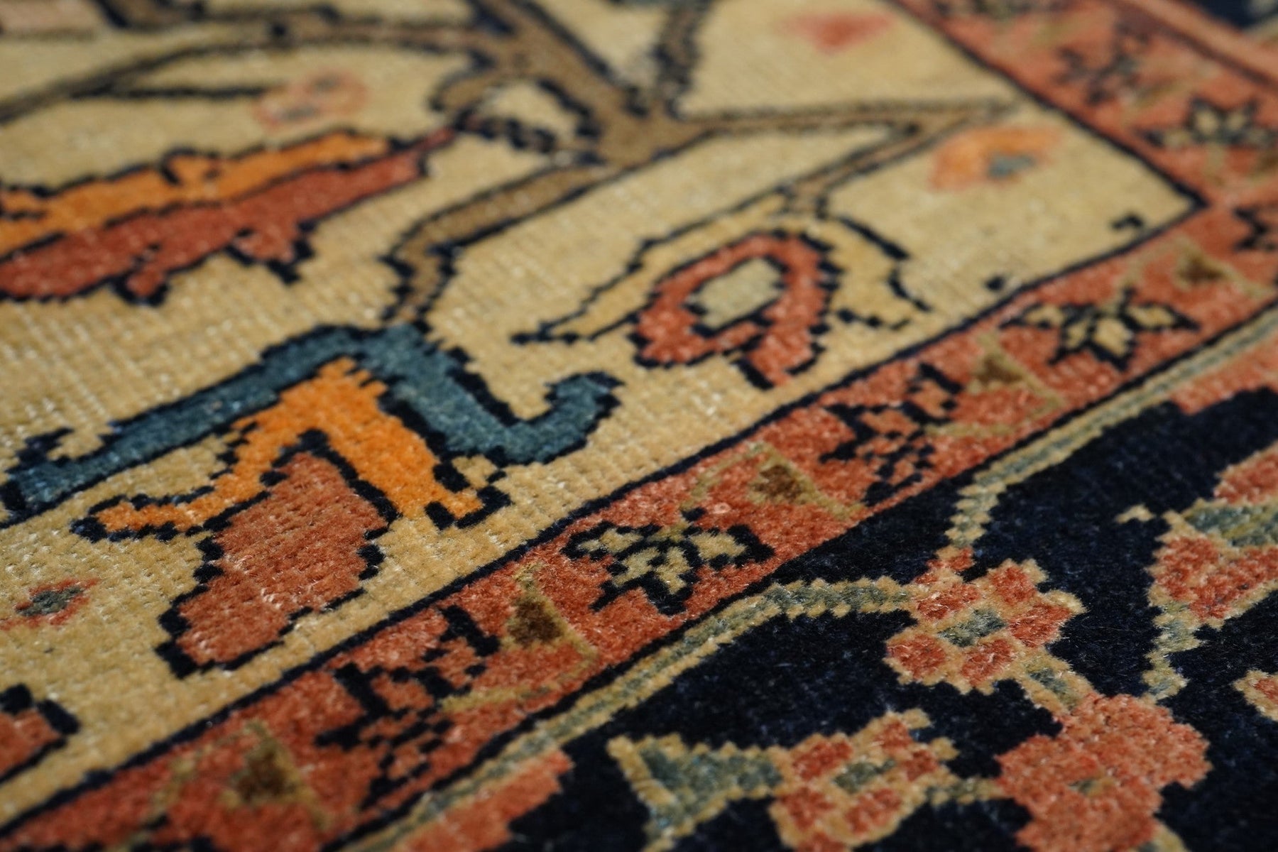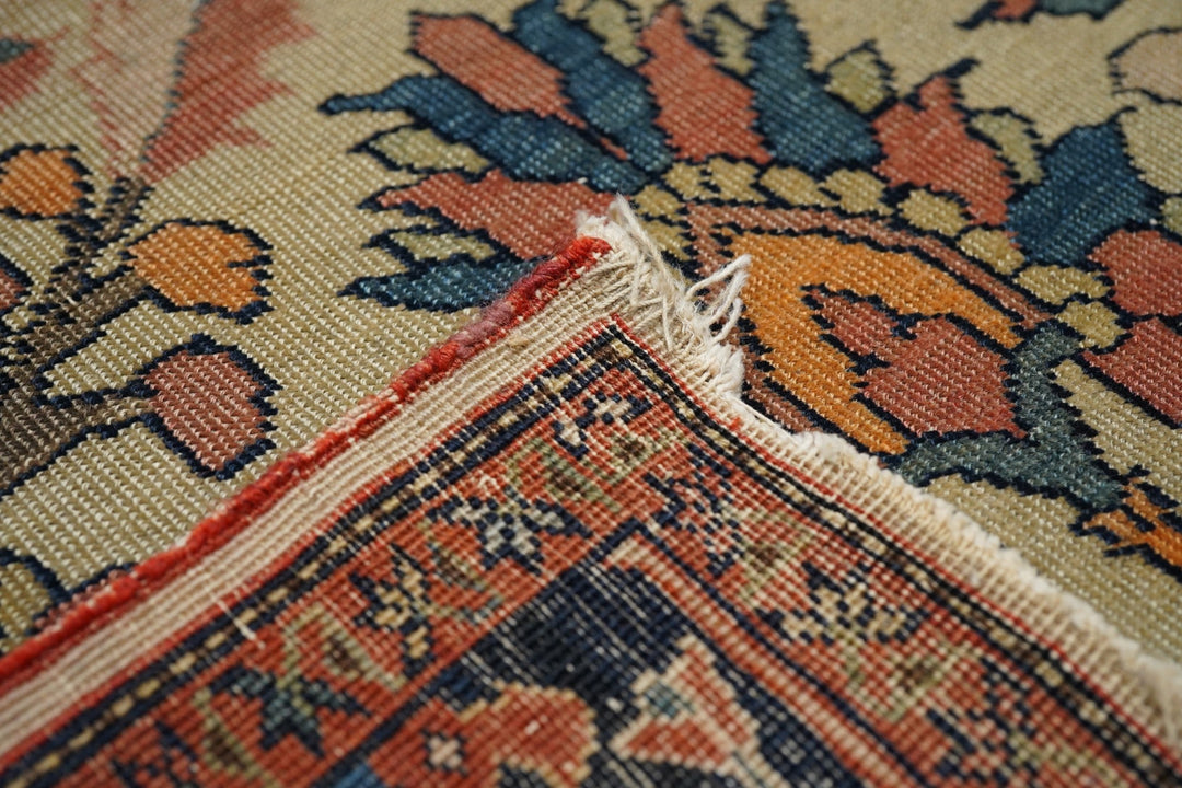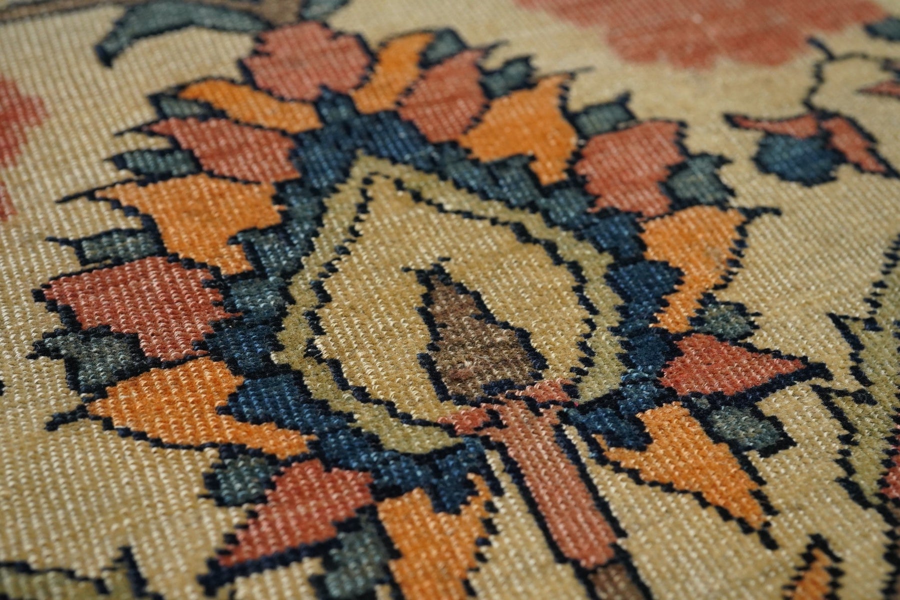 The scatter and room size pieces made in the Arak/Sultanabad area, between 1880 and 1910, with firm and leathery well-woven textures, and strong in red, navy and ecru tones, usually in medallion formats. A transition group between the earlier 19th century Farahans and the post-WWI Sarouks. Drawing is between curvilinear and angular.