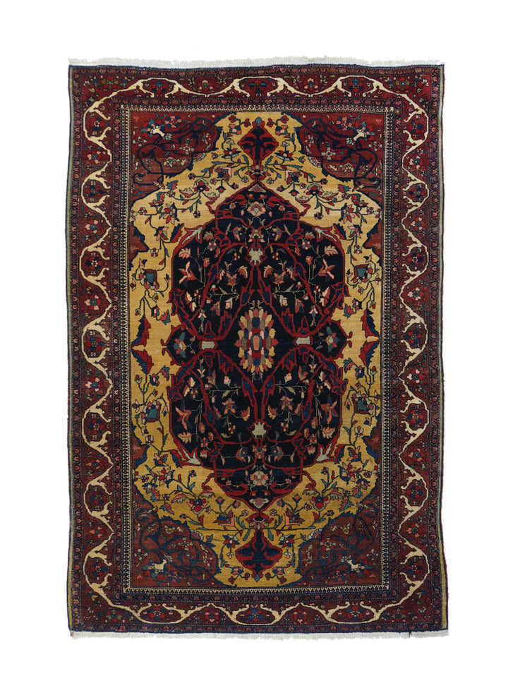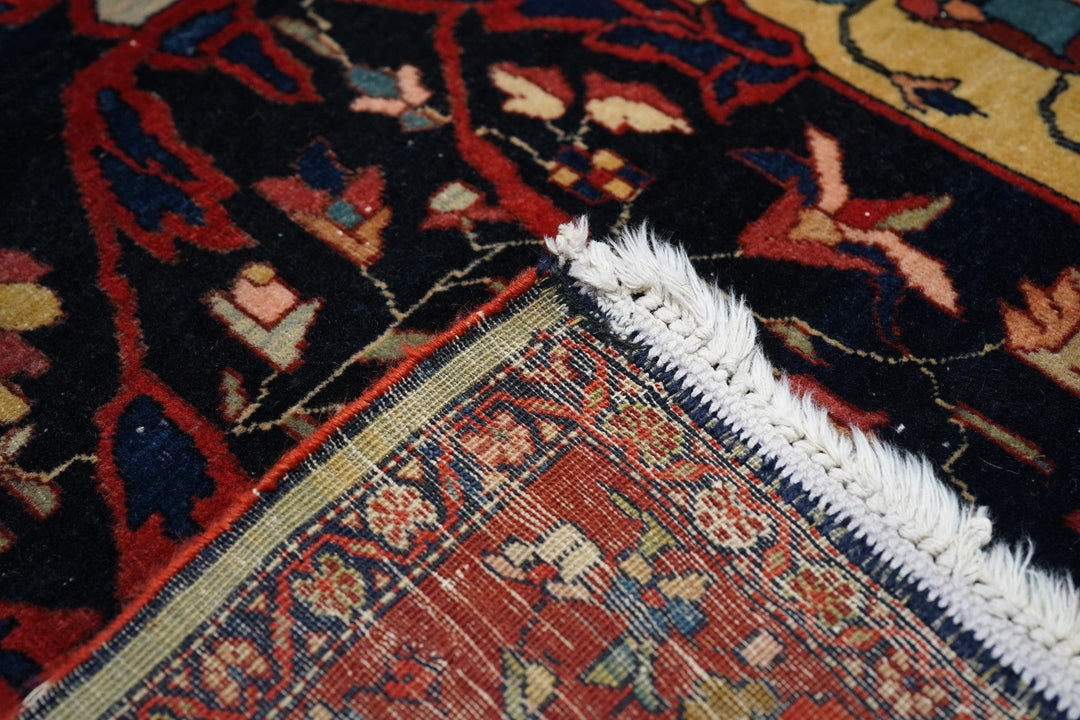 This very attractive west Persian village scatter is particularly unusual for several reasons: the goldenrod field is extremely recherch Ž for this weaving type. The red main border displays a forked arabesque meander with rational corner resolutions. Also unusual. More classic is the large cartouche-shaped navy medallion, with a petal ellipse centre, and red escutcheon pendants. Leathery texture and short pile. A step above the usual Farahan Sarouks. C. 1900. Good condition, but slight end reduction.