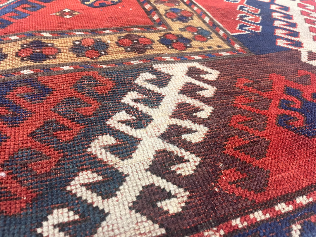 SW Caucasus/Armenia. Boldly patterned, strongly colored, totally geometric, all wool, coarse to moderate weave, medium to long pile, scatter format pieces, in medallion, allover and prayer (directional) layouts, with numerous identified source villages: Karachof, Bordshaly, Sewan, Shulaver and Lori Pambak.  Natural dyes, decorative to highly collectible. Often dated. Moderate to very expensive.