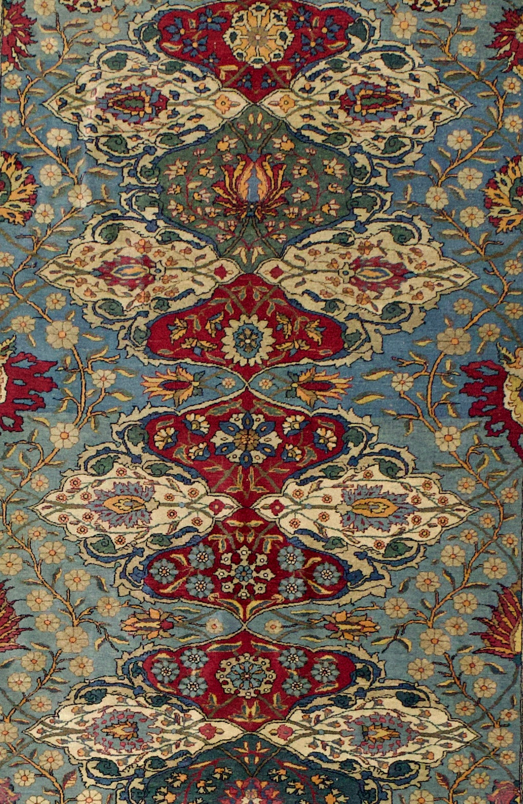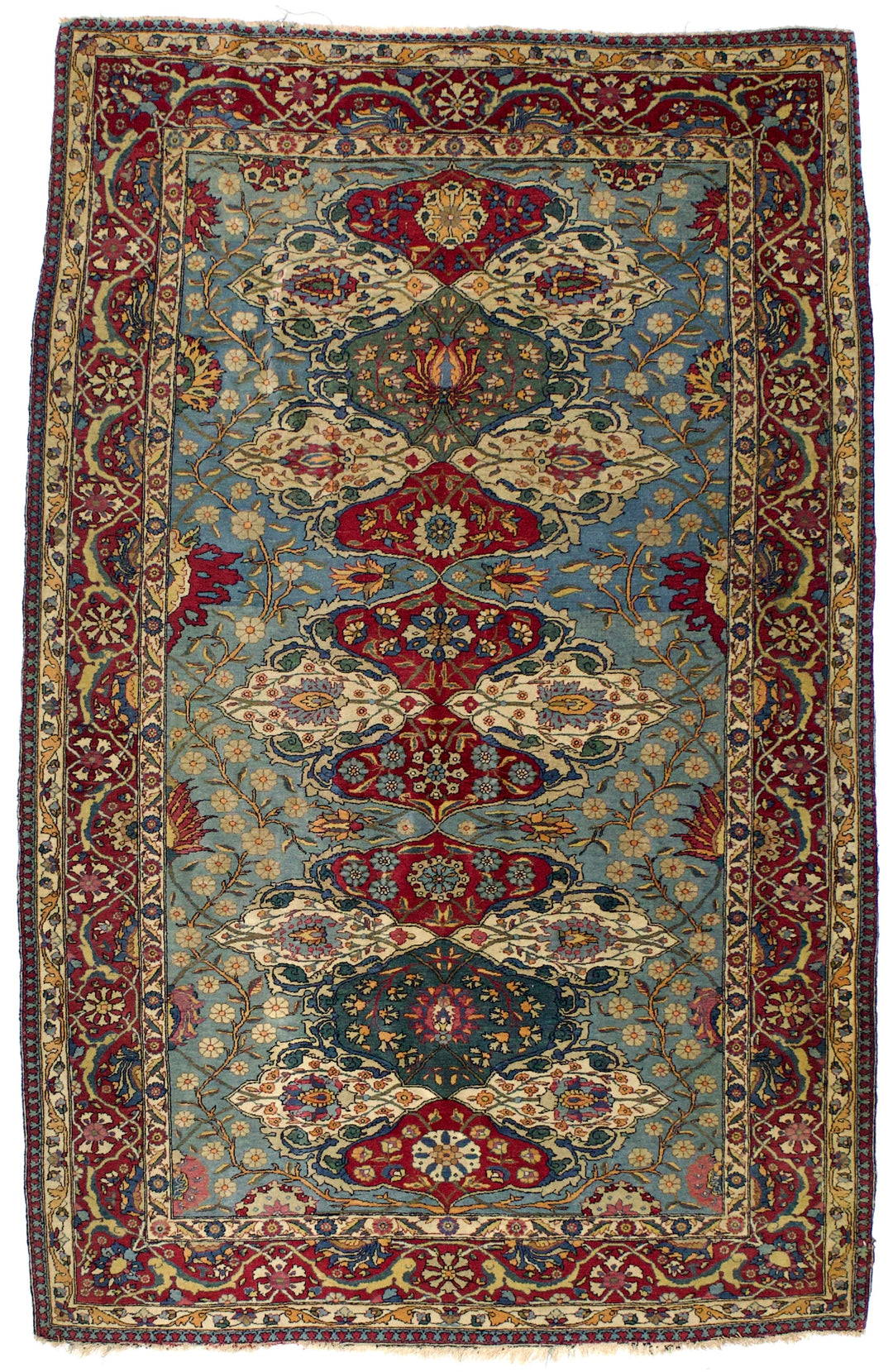 The interwar, finely woven curvilinear scatters and room sizes woven in the Persian capital city. Medallion, allover and directional/niche layouts. Extensive palettes and high quality wool, on cotton. Balanced drawing and perfect, though not stiff, execution. Originally woven for the Persian upper-class market. Expensive.