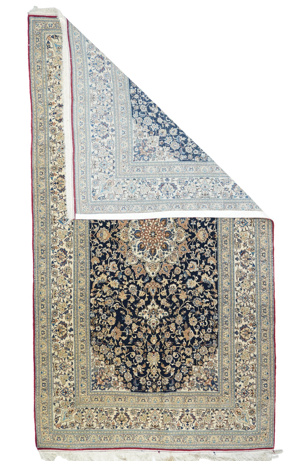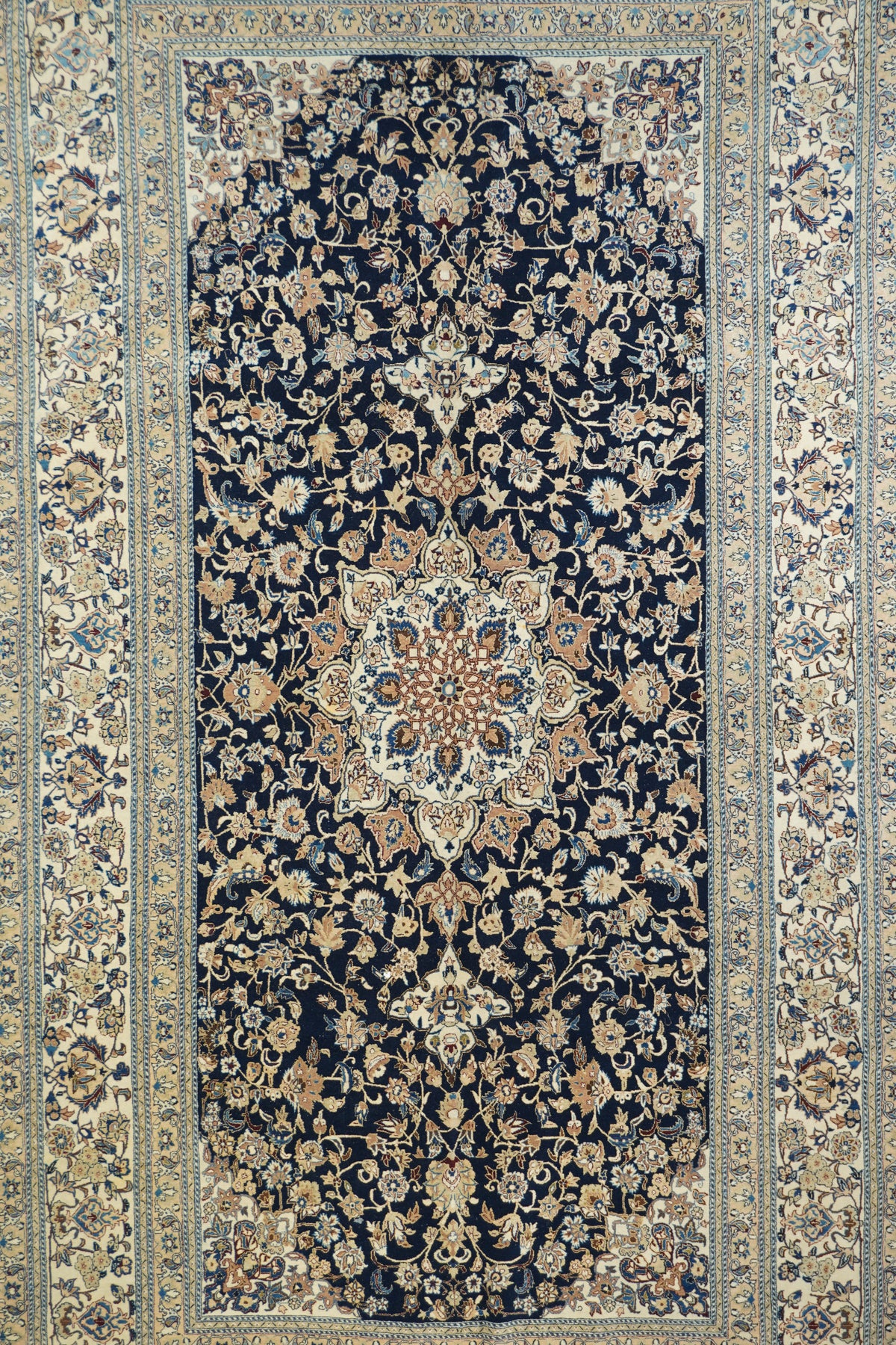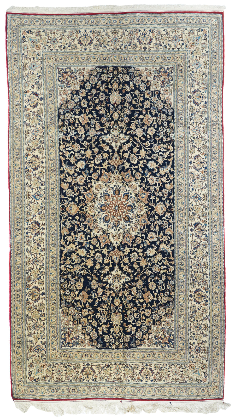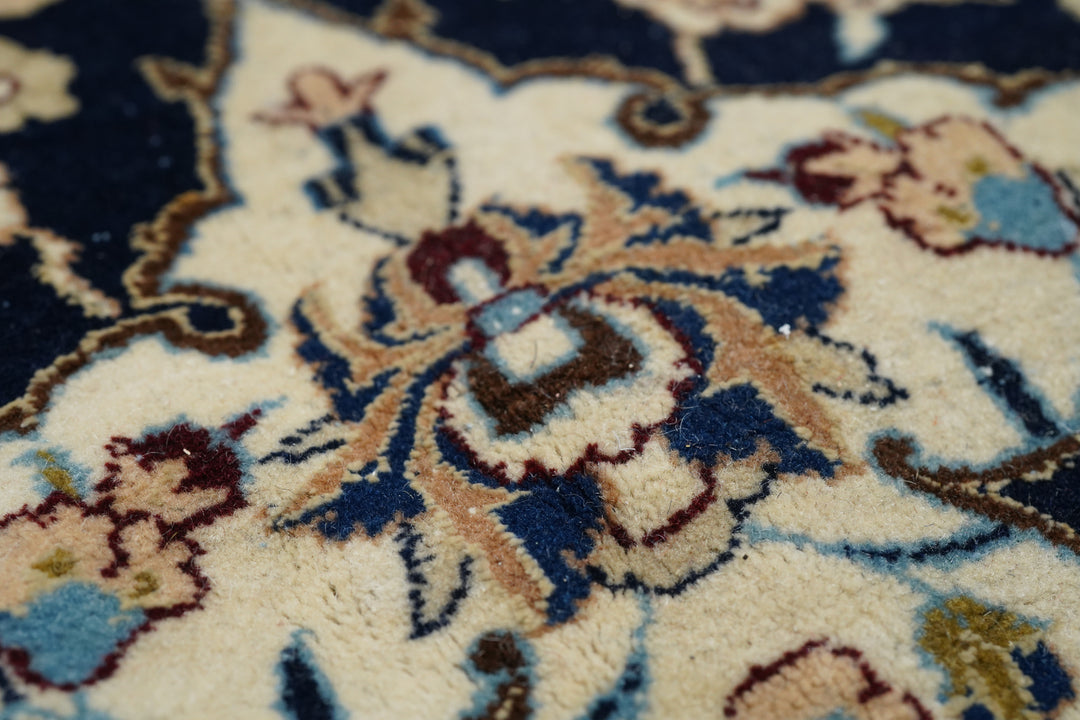 Almost a long rug, this finely knotted central Persian city rug, shows a 16-point round medallion with a central ecru disc, on the navy field with a close small palmette and leaf arabesque pattern, and ivory corners. Eggshell palmette and triple flower border. Cotton foundation, fine weave of resilient “Kurk” wool. Very good condition.