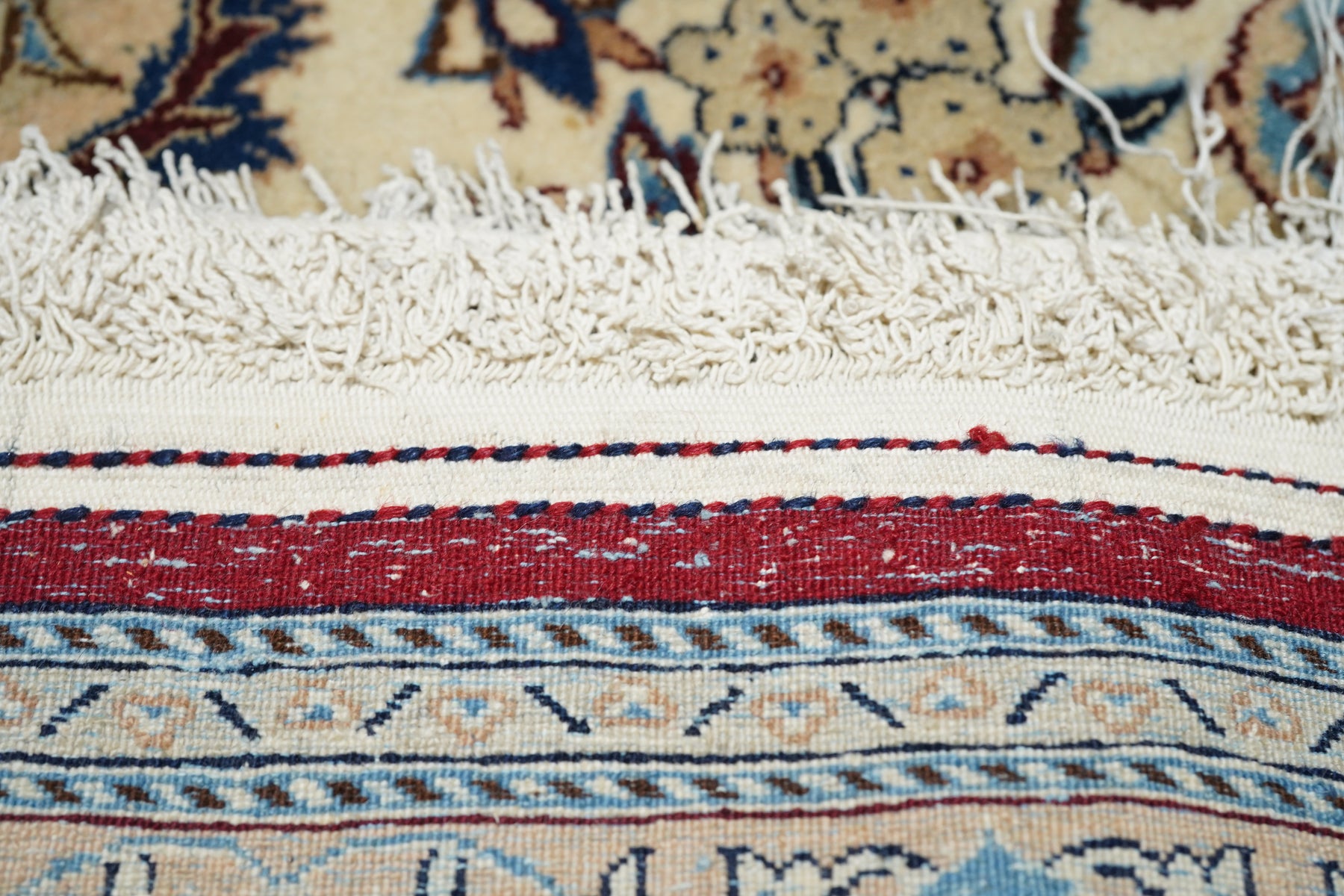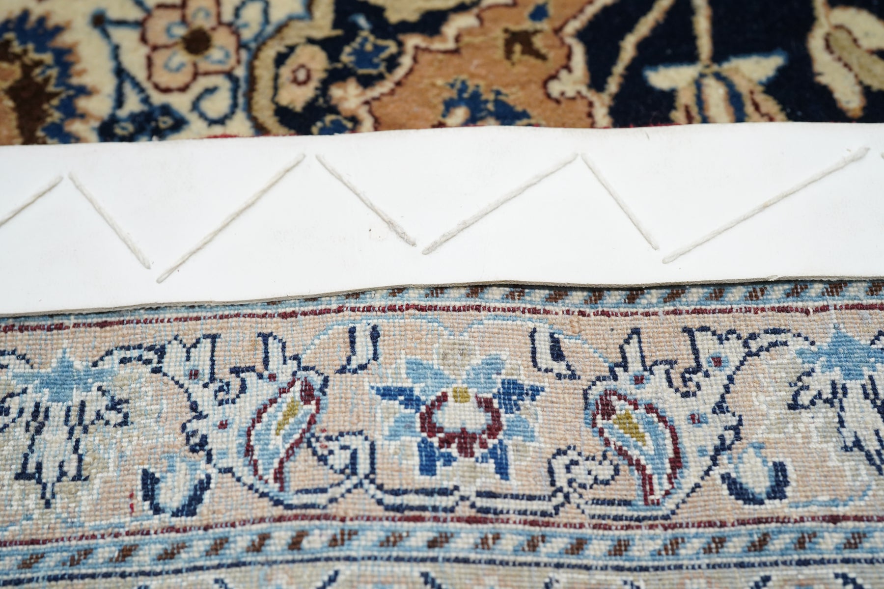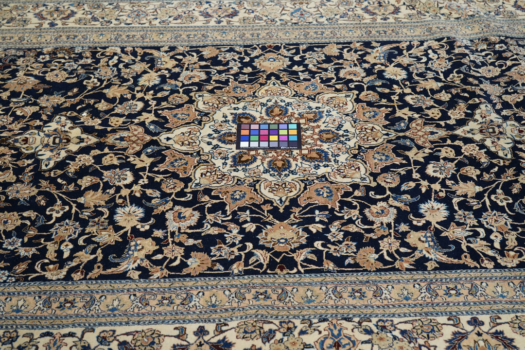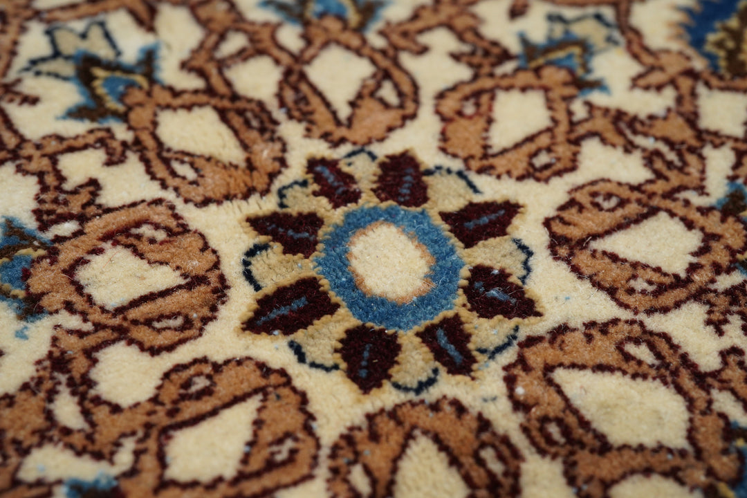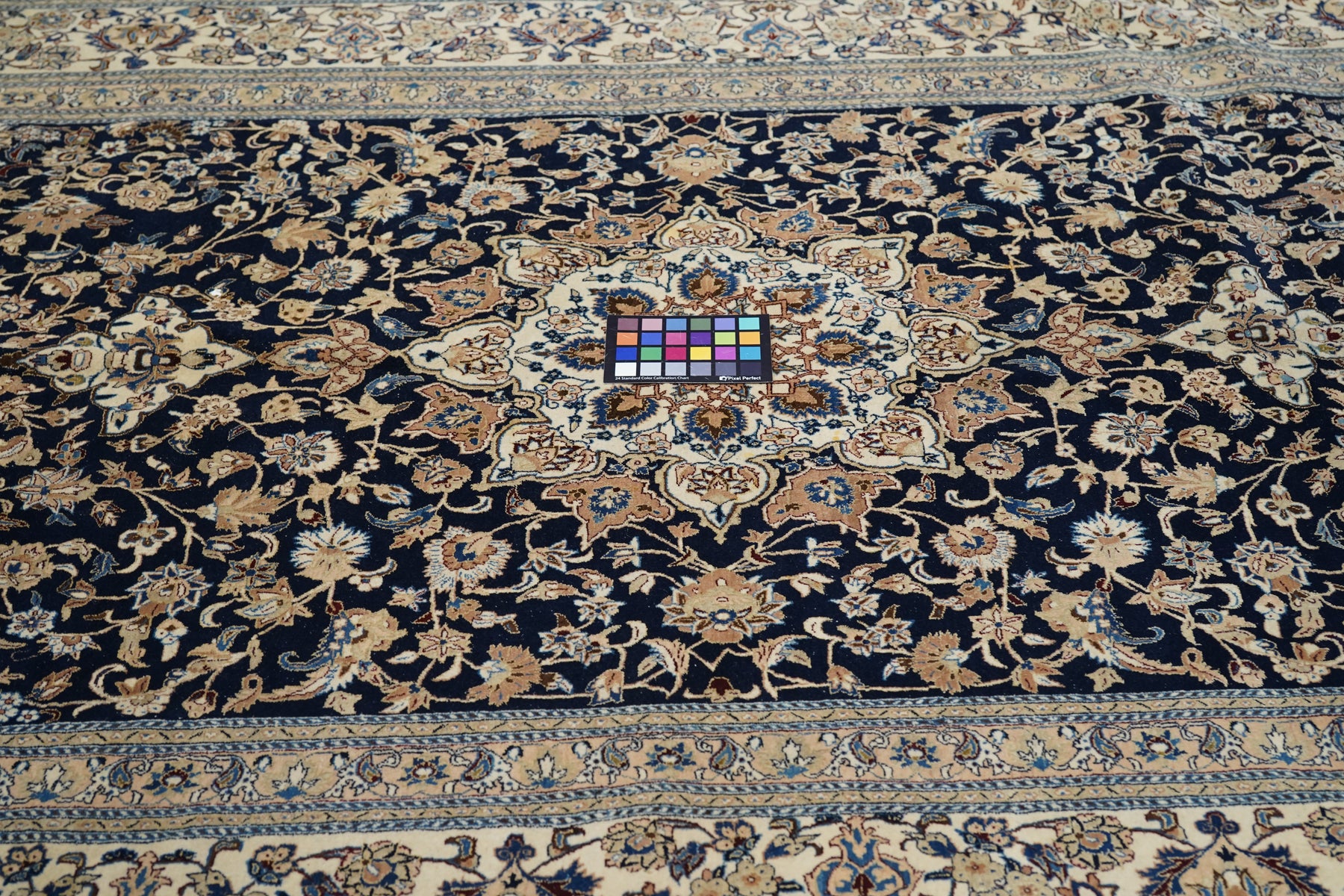 Almost a long rug, this finely knotted central Persian city rug, shows a 16-point round medallion with a central ecru disc, on the navy field with a close small palmette and leaf arabesque pattern, and ivory corners. Eggshell palmette and triple flower border. Cotton foundation, fine weave of resilient “Kurk” wool. Very good condition.