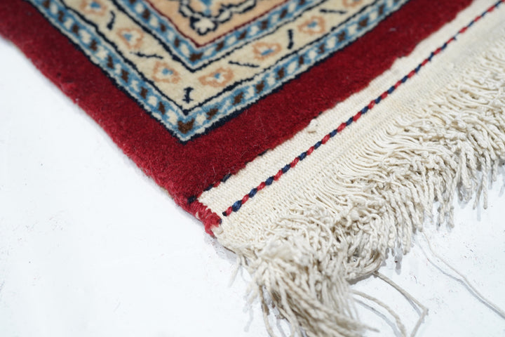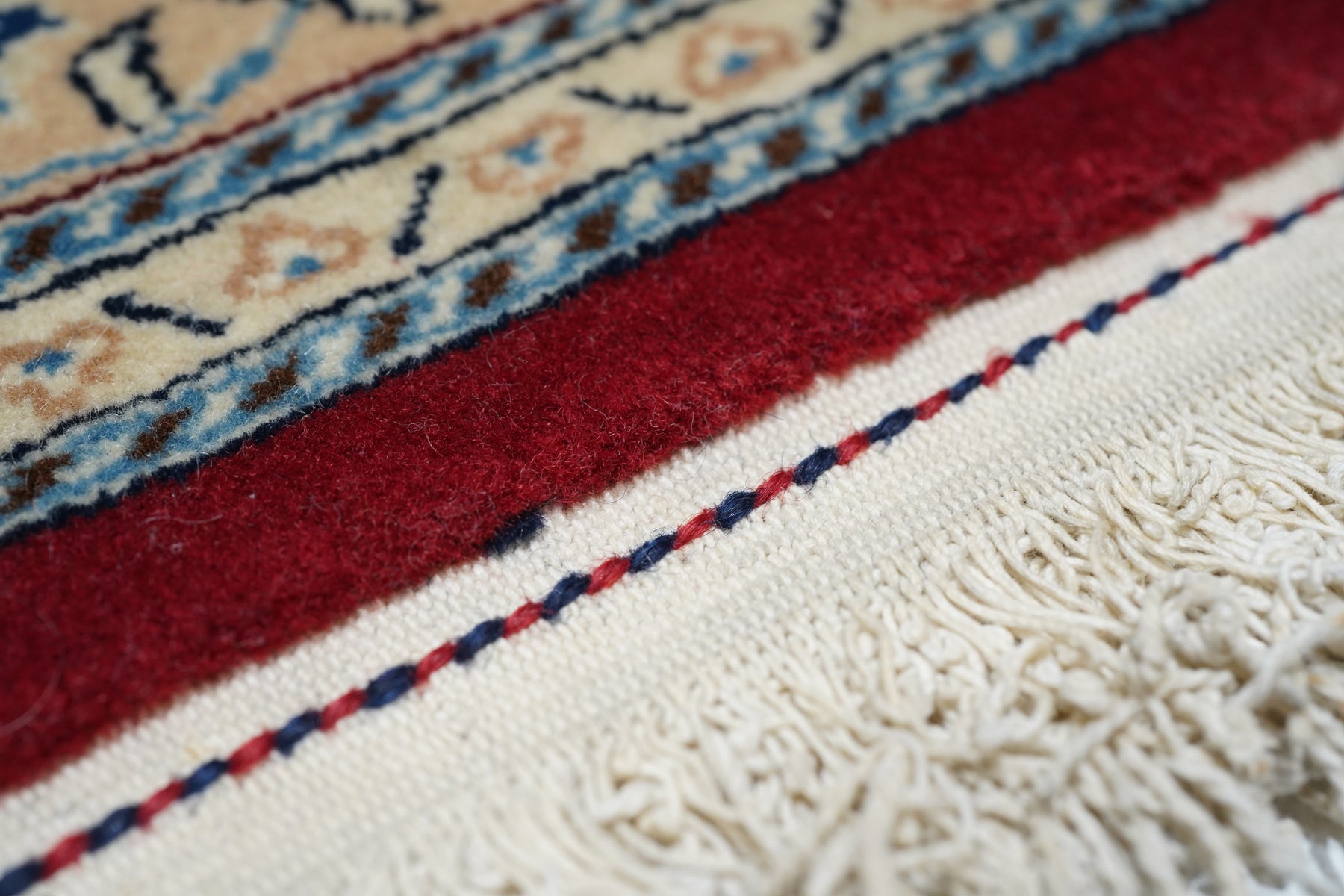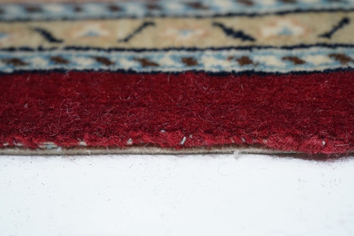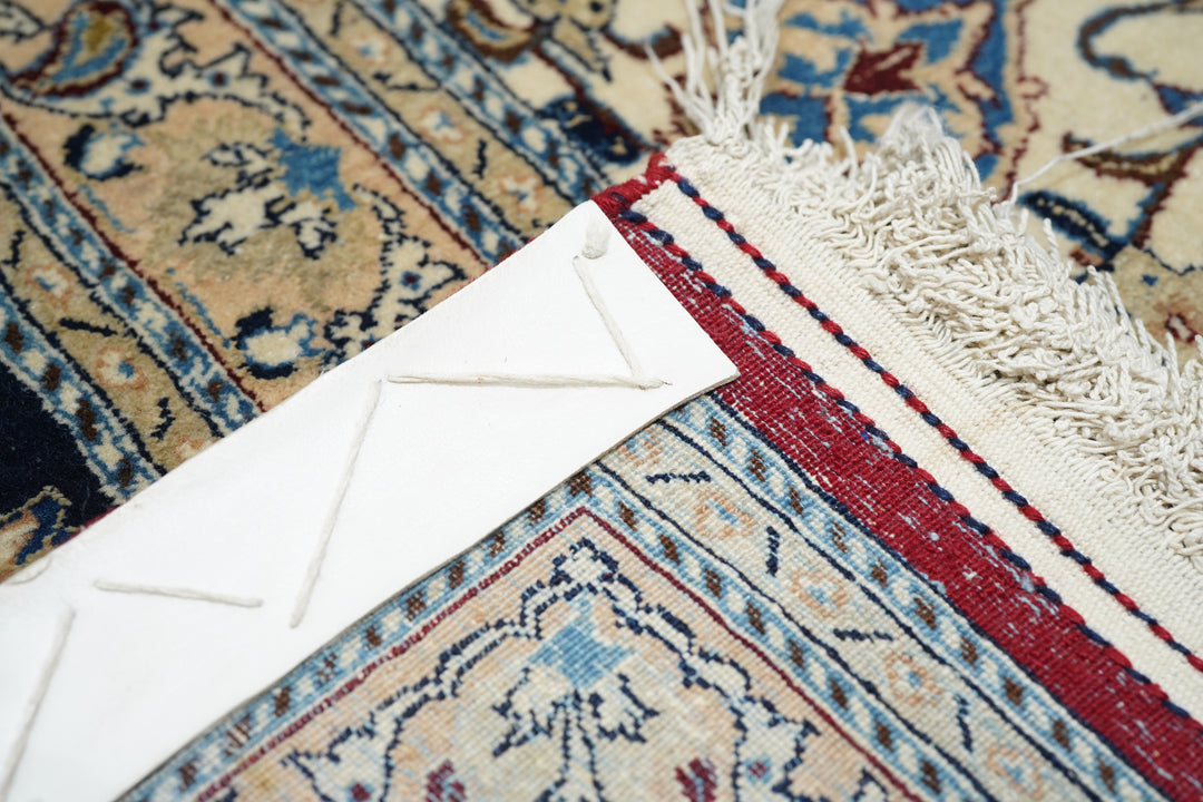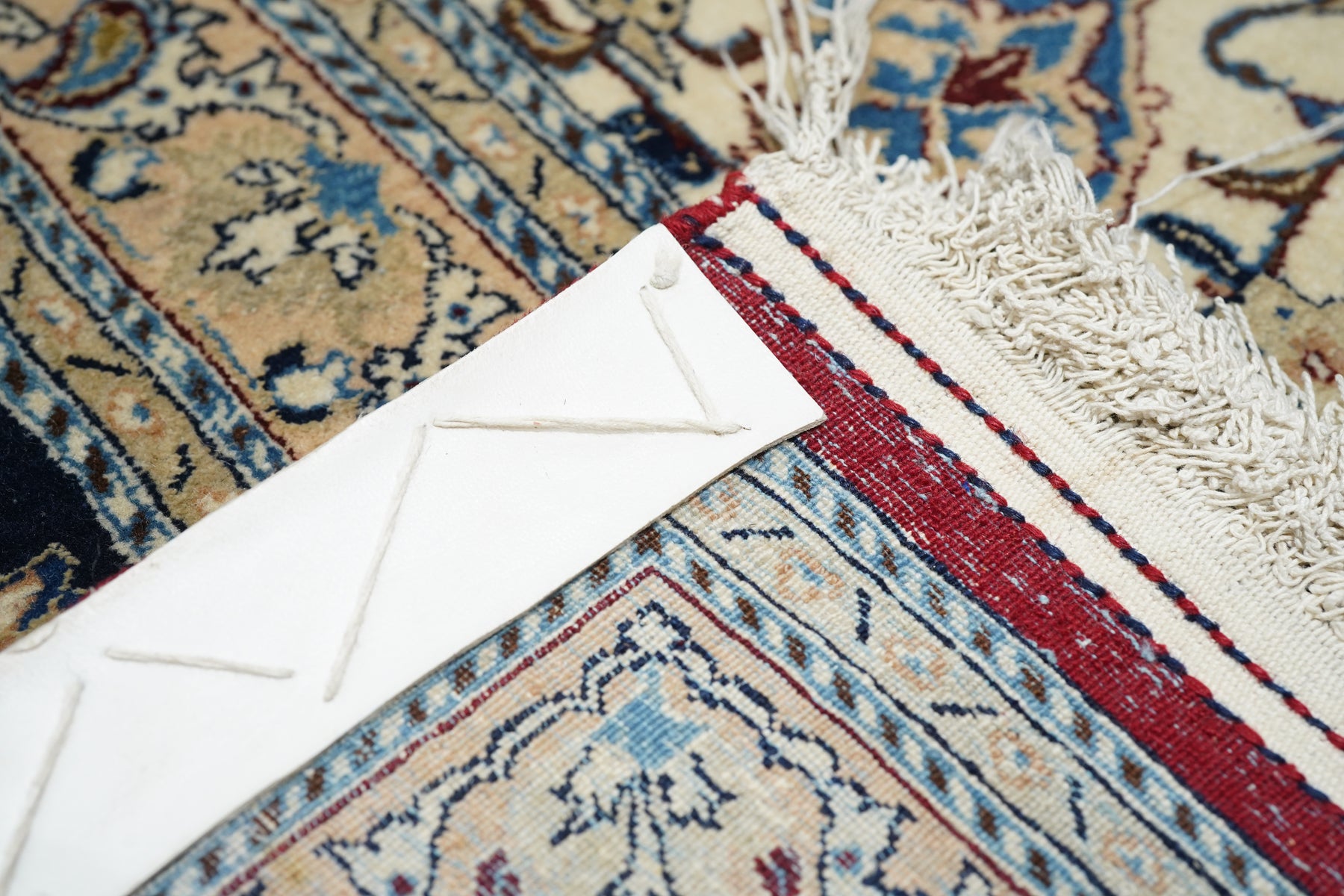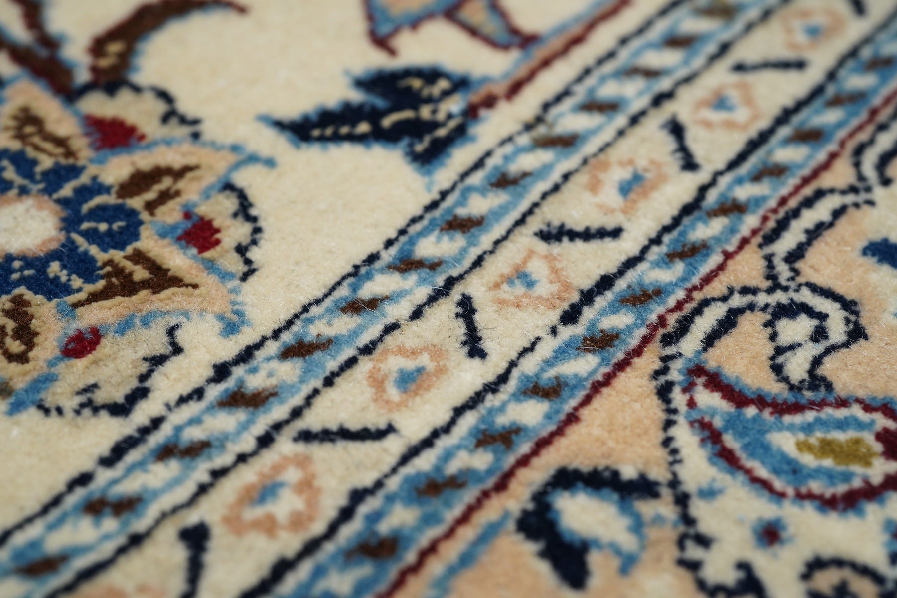 Almost a long rug, this finely knotted central Persian city rug, shows a 16-point round medallion with a central ecru disc, on the navy field with a close small palmette and leaf arabesque pattern, and ivory corners. Eggshell palmette and triple flower border. Cotton foundation, fine weave of resilient “Kurk” wool. Very good condition.