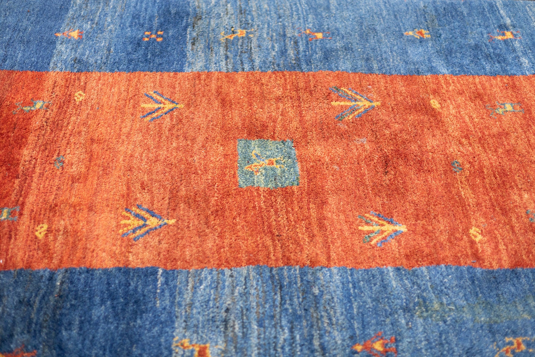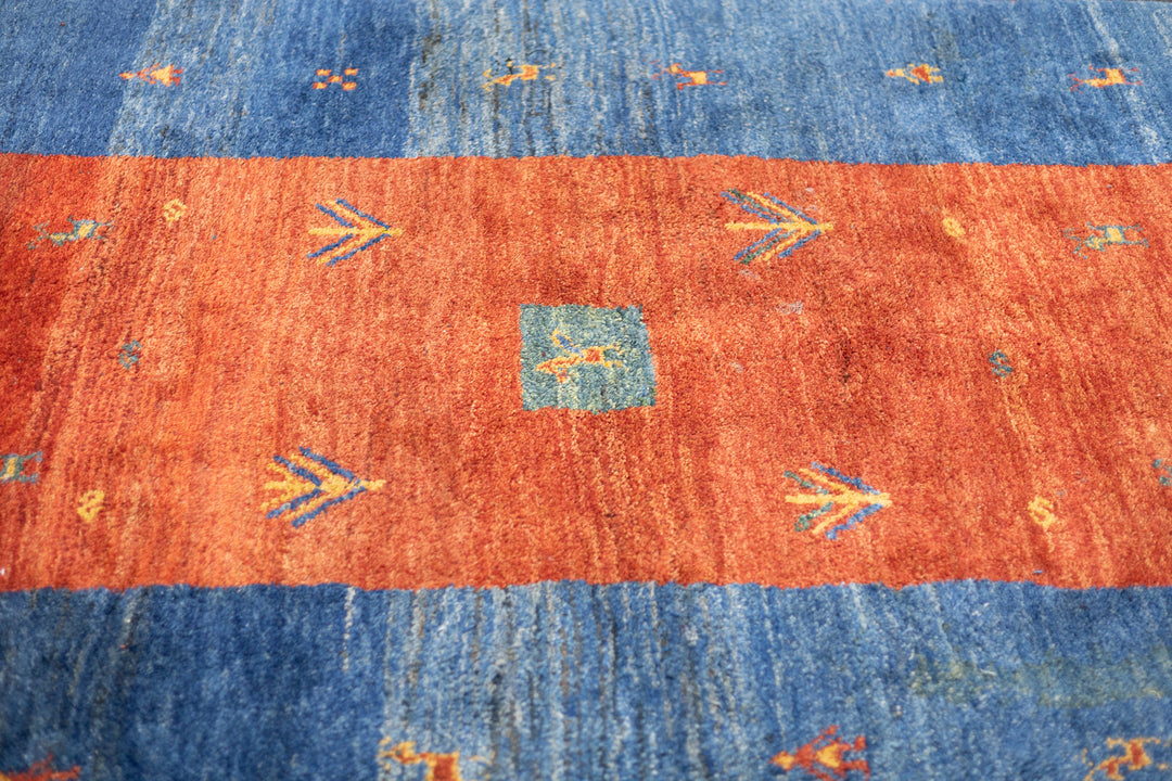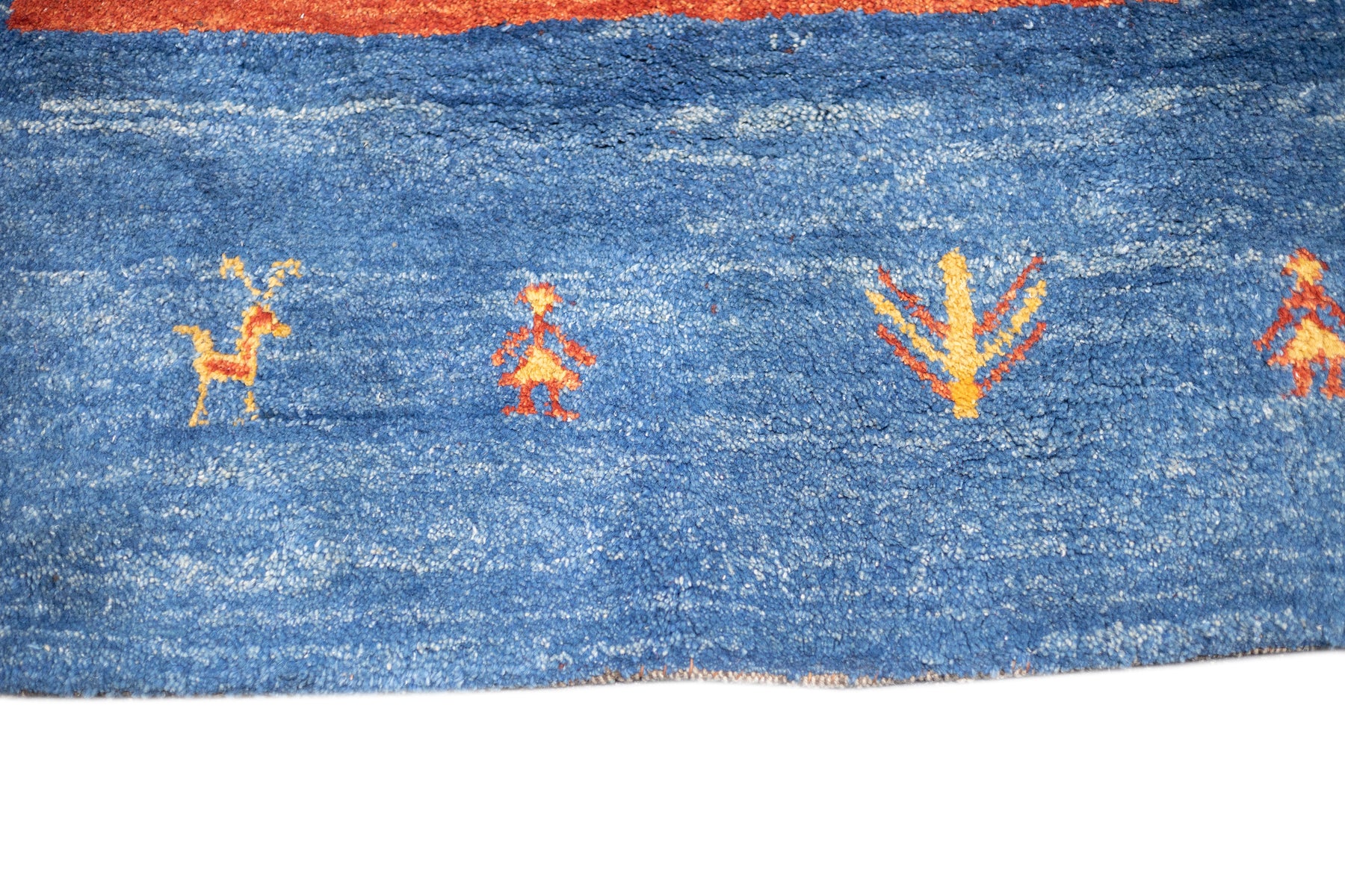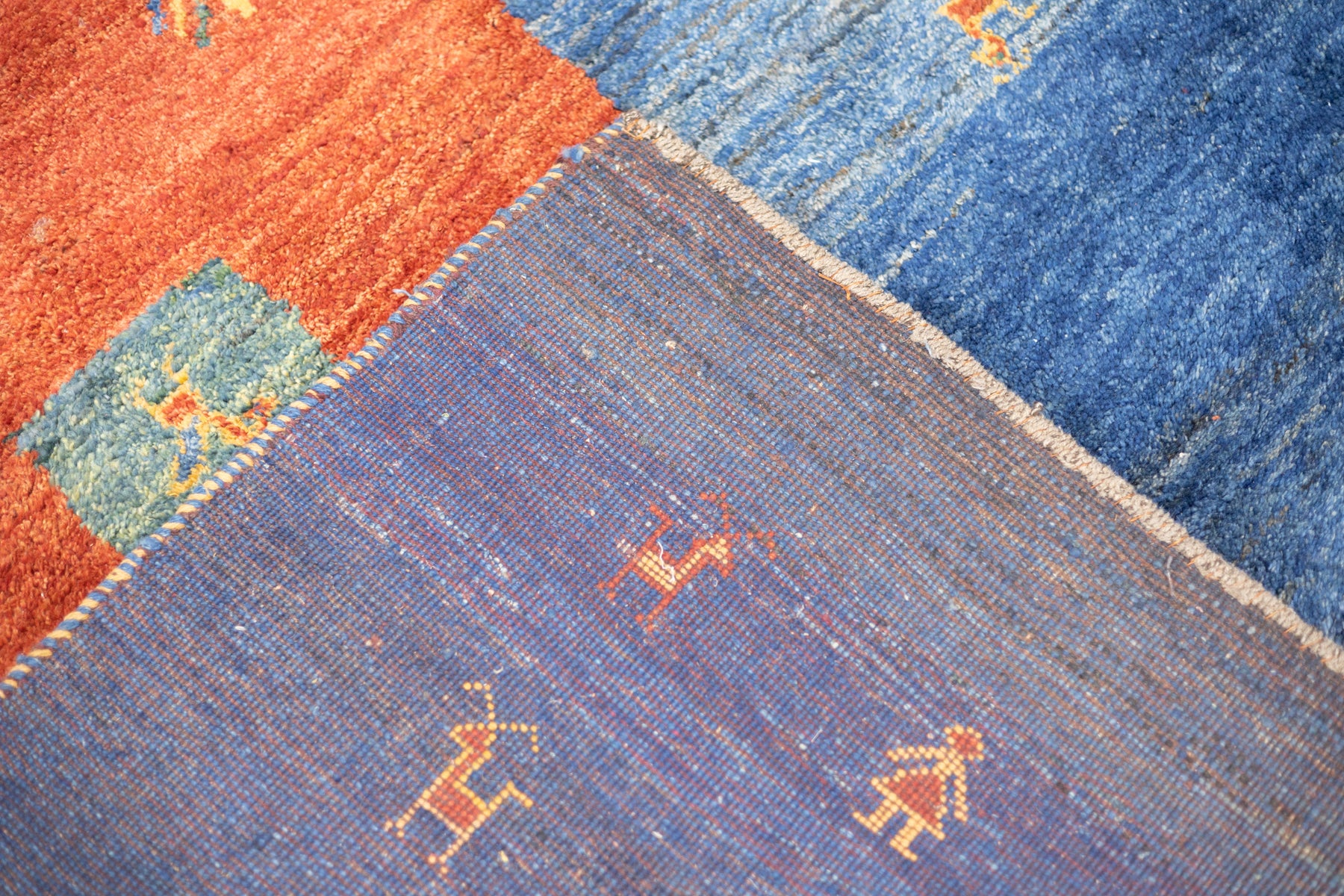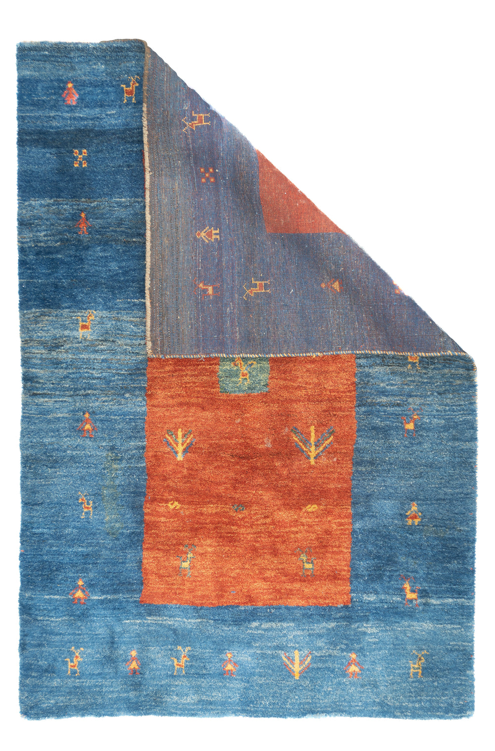 An attractive Qashghai rustic high pile piece with a broad, well-abrashed medium blue border decorated primarily with little animals, surrounding an equally abrashed red field with a scattering of stylised plants. Abrashed central medium blue green square. Moderate tribal weave. Good condition.