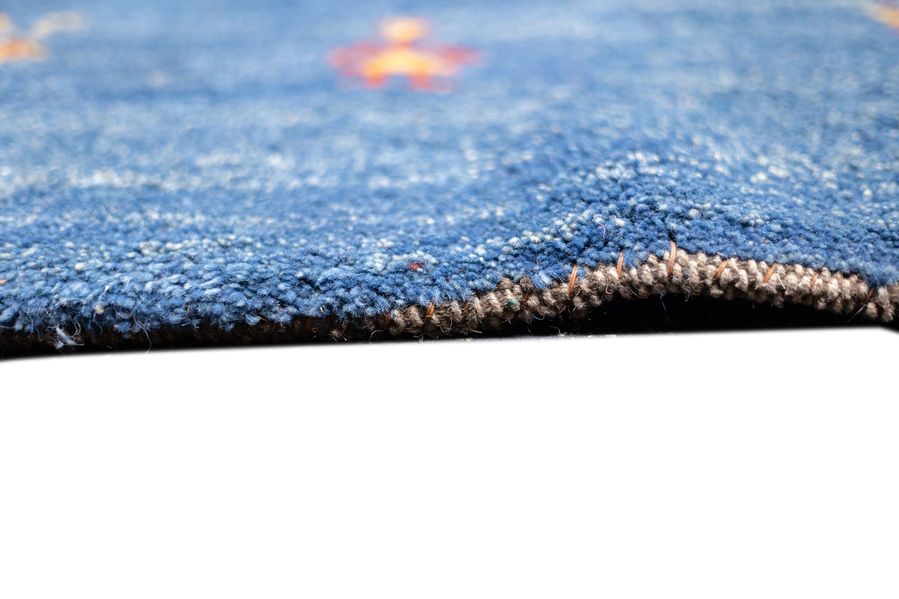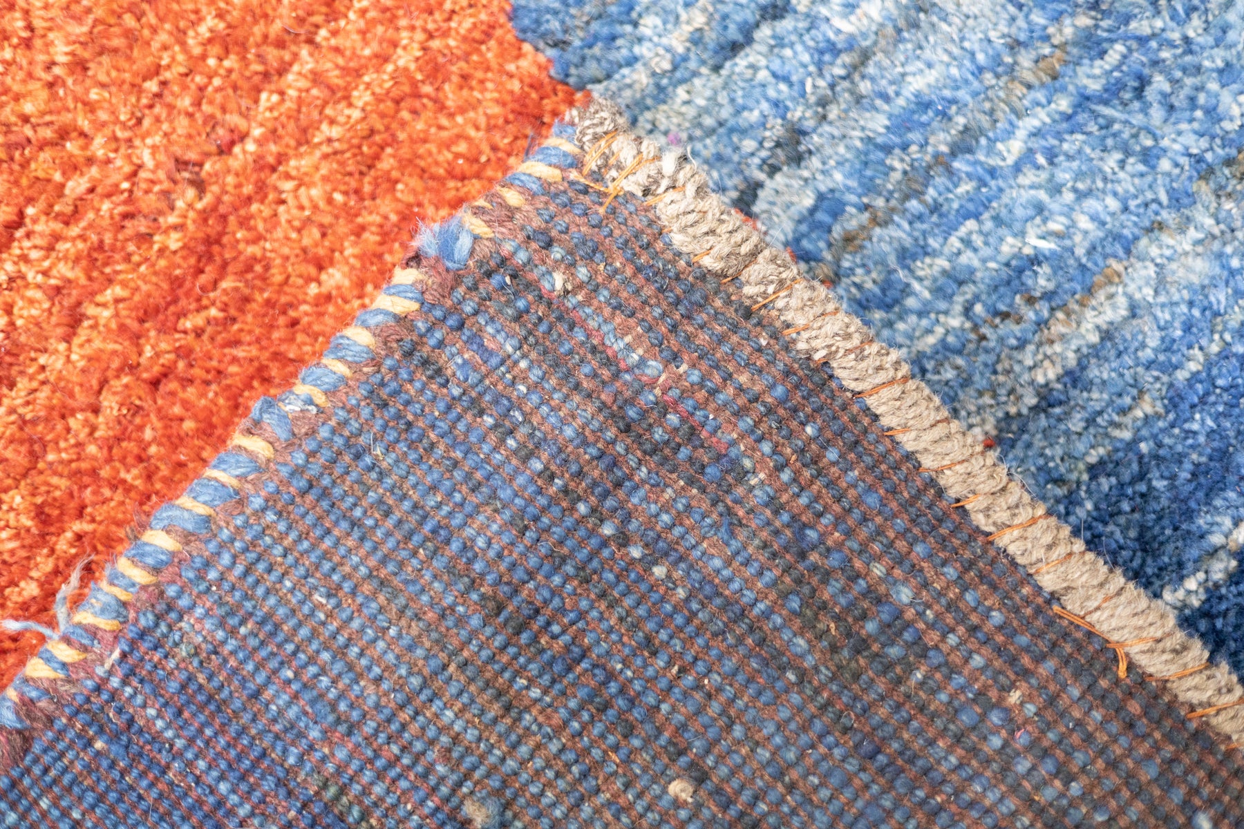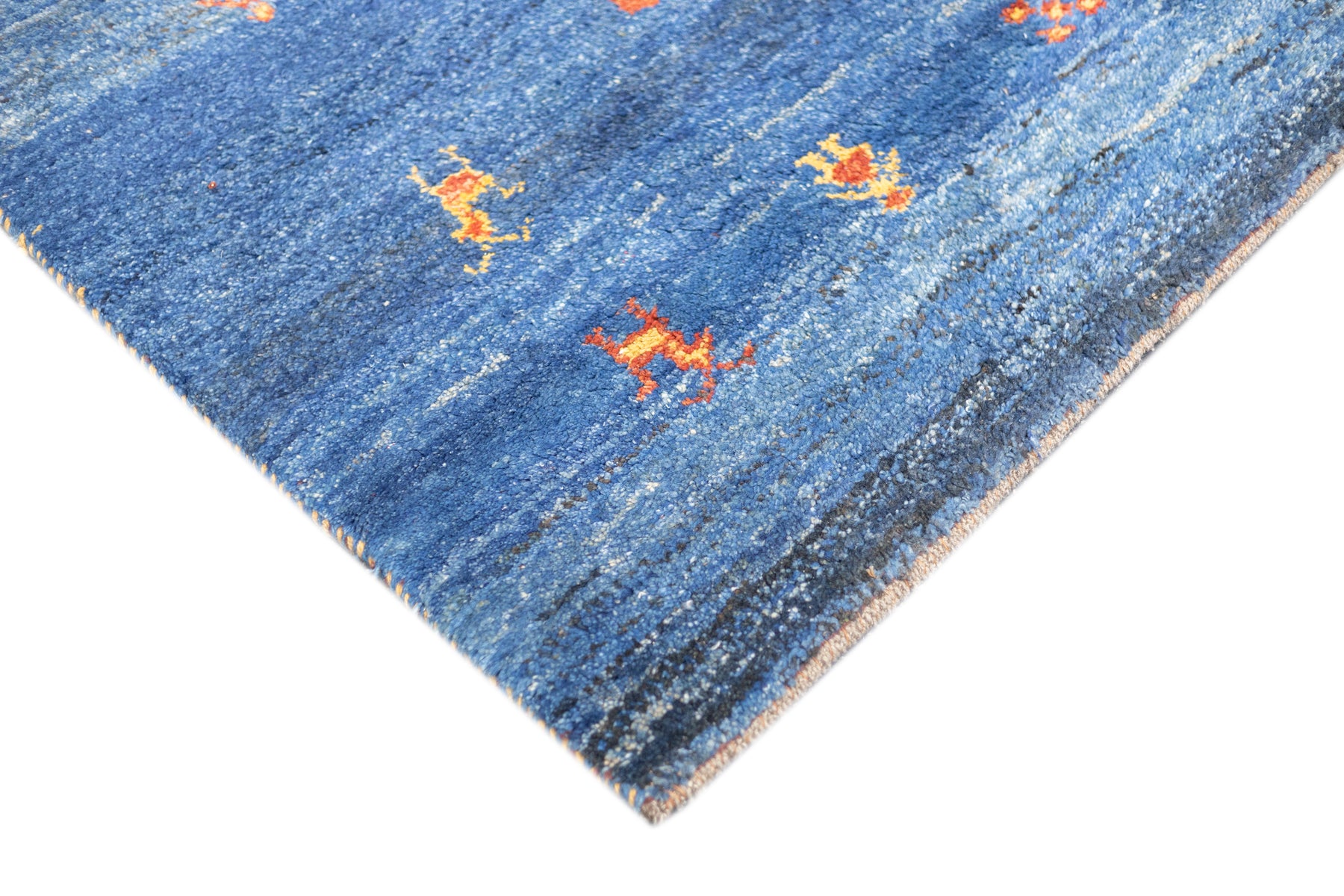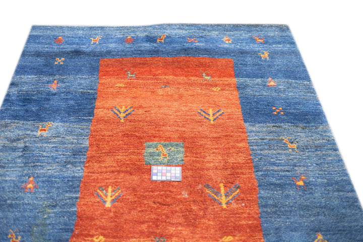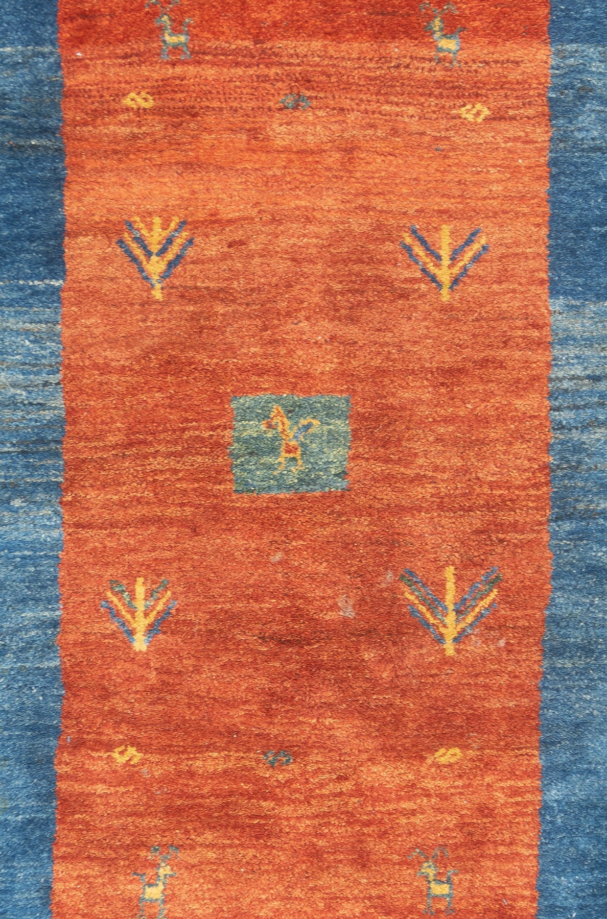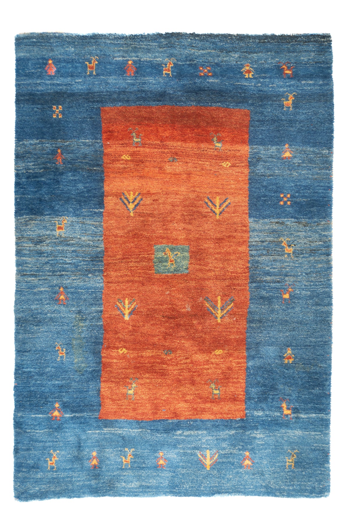 An attractive Qashghai rustic high pile piece with a broad, well-abrashed medium blue border decorated primarily with little animals, surrounding an equally abrashed red field with a scattering of stylised plants. Abrashed central medium blue green square. Moderate tribal weave. Good condition.