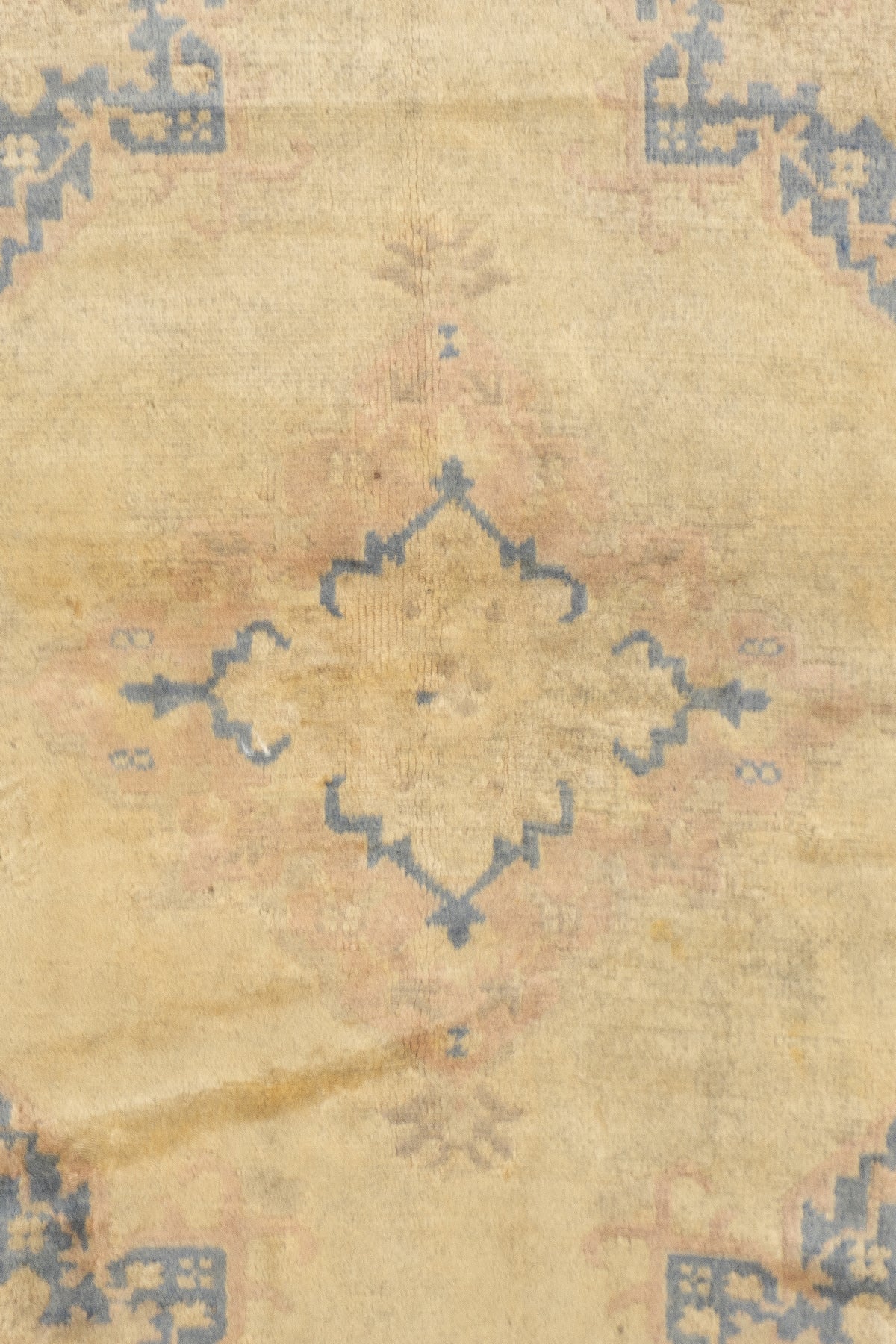 Town in Western Anatolia, weaving mostly room sizes, in coarse to moderate weave, high pile. Antiques are all wool, changing to cotton foundations in the 1920’s. Geometric or Persian-derived patterns, soft or strong palettes; allover or medallion. Informal execution. Carpets change with interior design fashions. Mostly carpets, some very large, also a few runners and scatters. No prayer rugs.