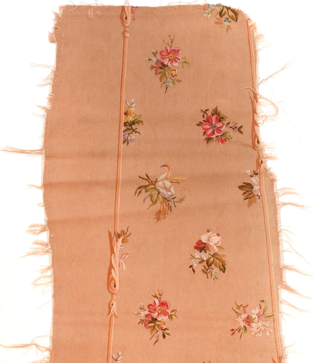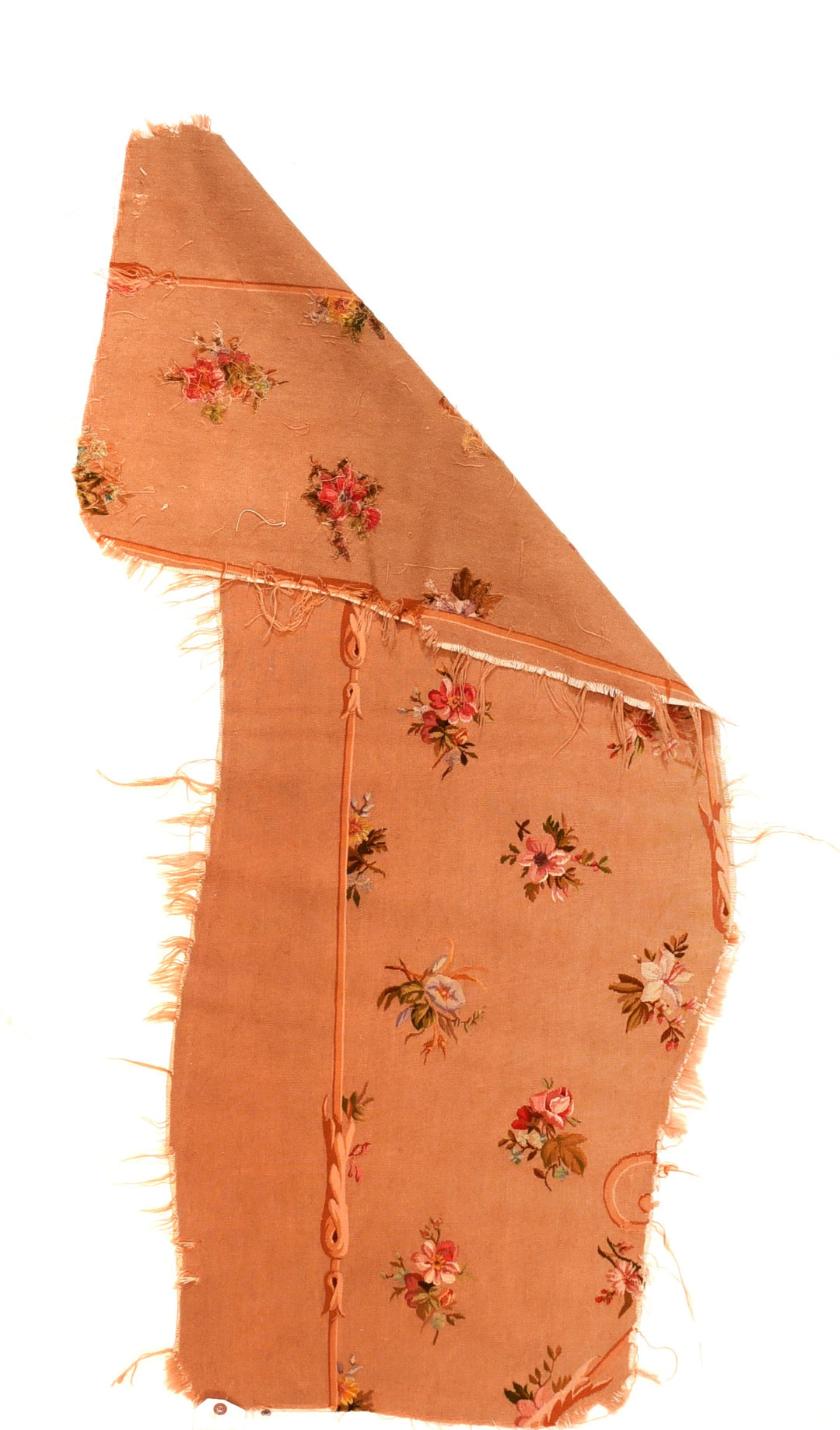 With a buff-beige field displaying rose and other flower bunches, with an adjoining plain section. Probably a covering for a settee. Ecru, green and rust details. Rough along one edge, but generally fairly good condition.
