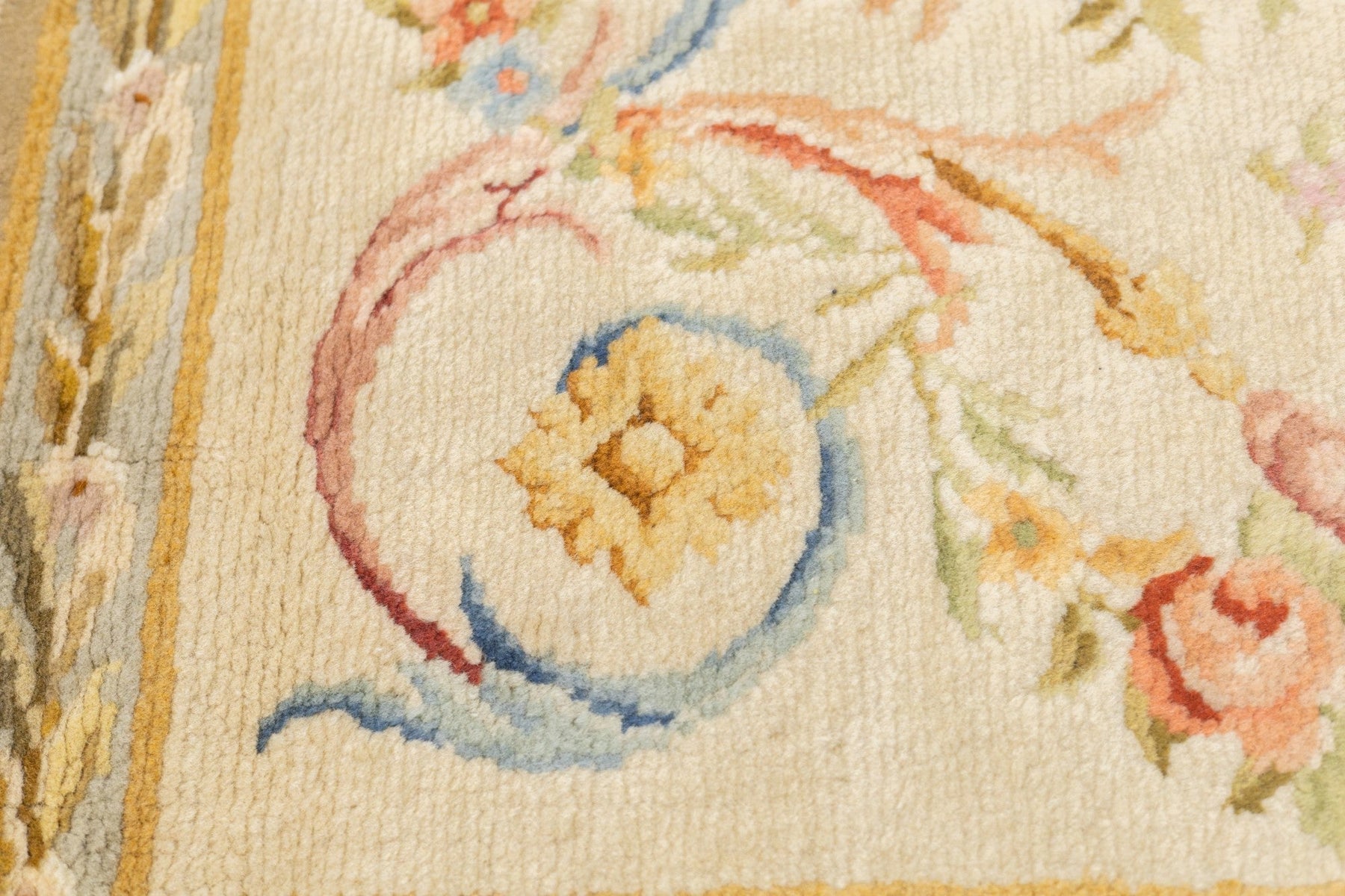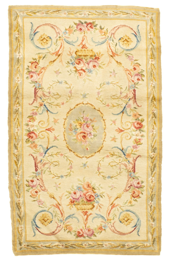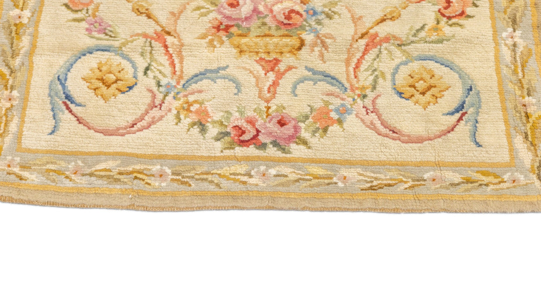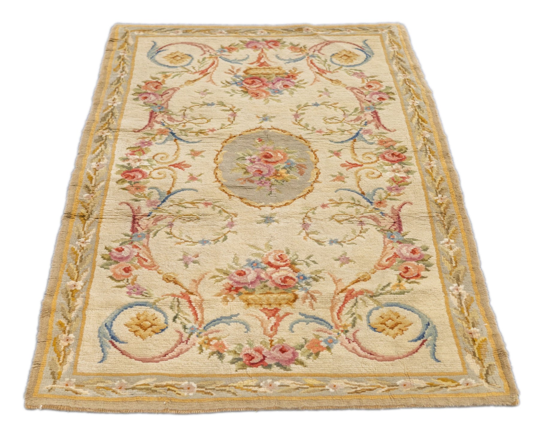 In the Louis XV style, with a straw-ecru field centred by a rose bouquet. Acanthus and rose volutes. Baskets of roses at the field ends. Laurel leaf trail main border. Thick pile, moderate/coarse weave. Good Condition.
