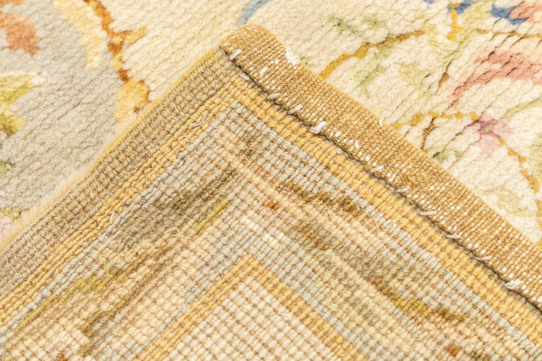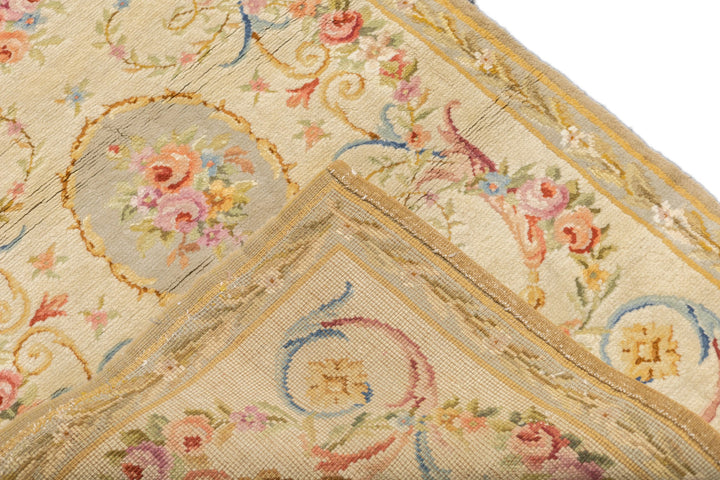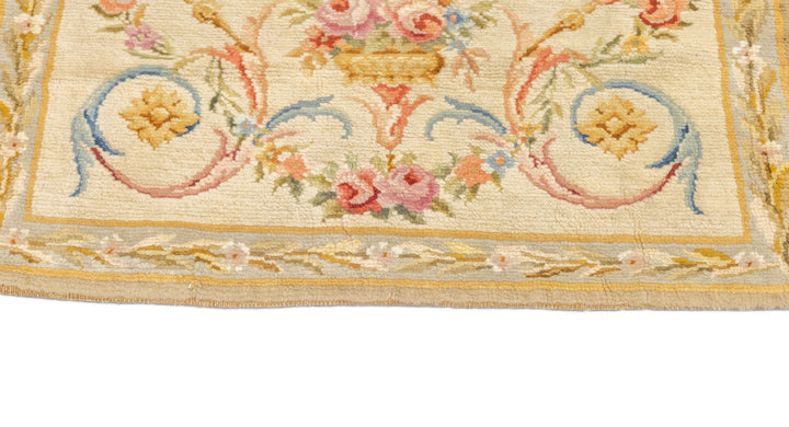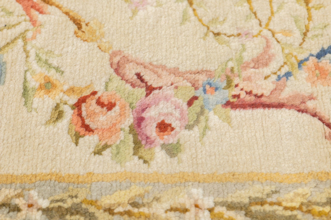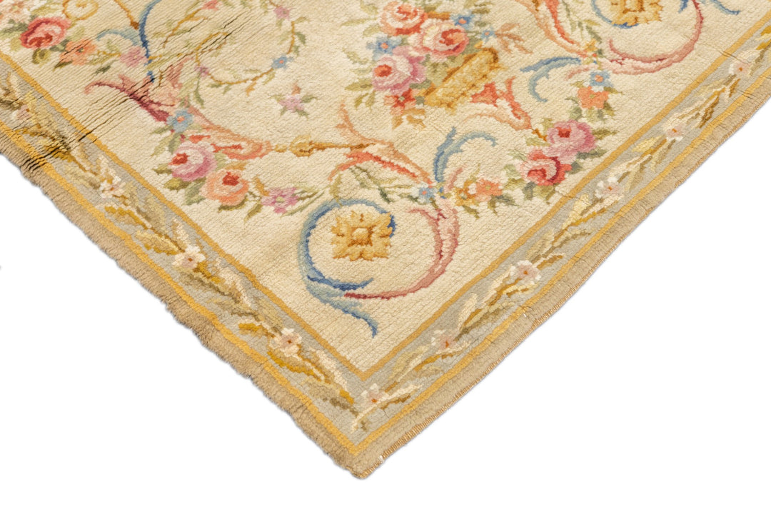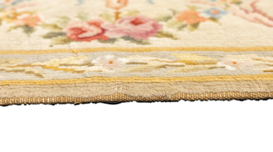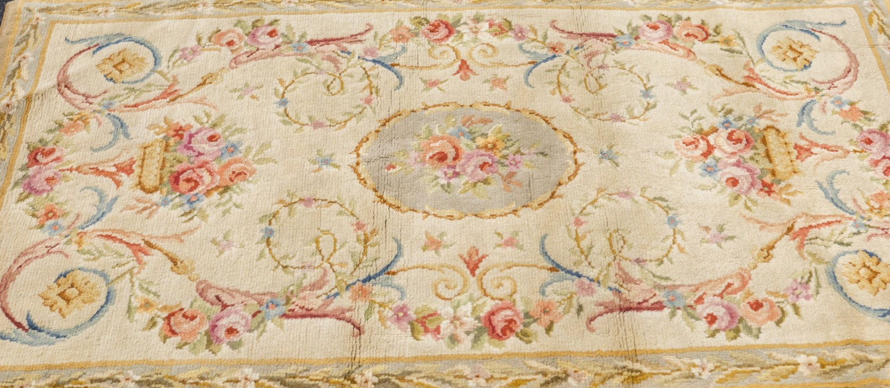 In the Louis XV style, with a straw-ecru field centred by a rose bouquet. Acanthus and rose volutes. Baskets of roses at the field ends. Laurel leaf trail main border. Thick pile, moderate/coarse weave. Good Condition.