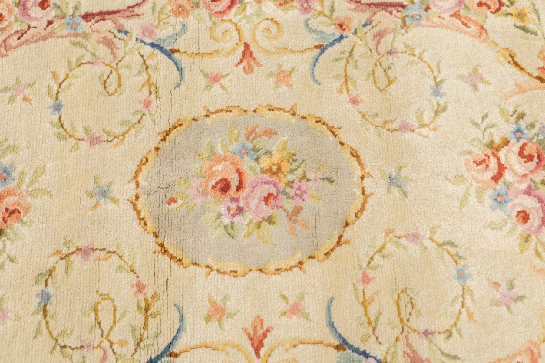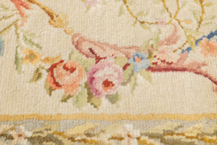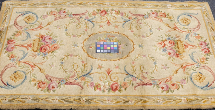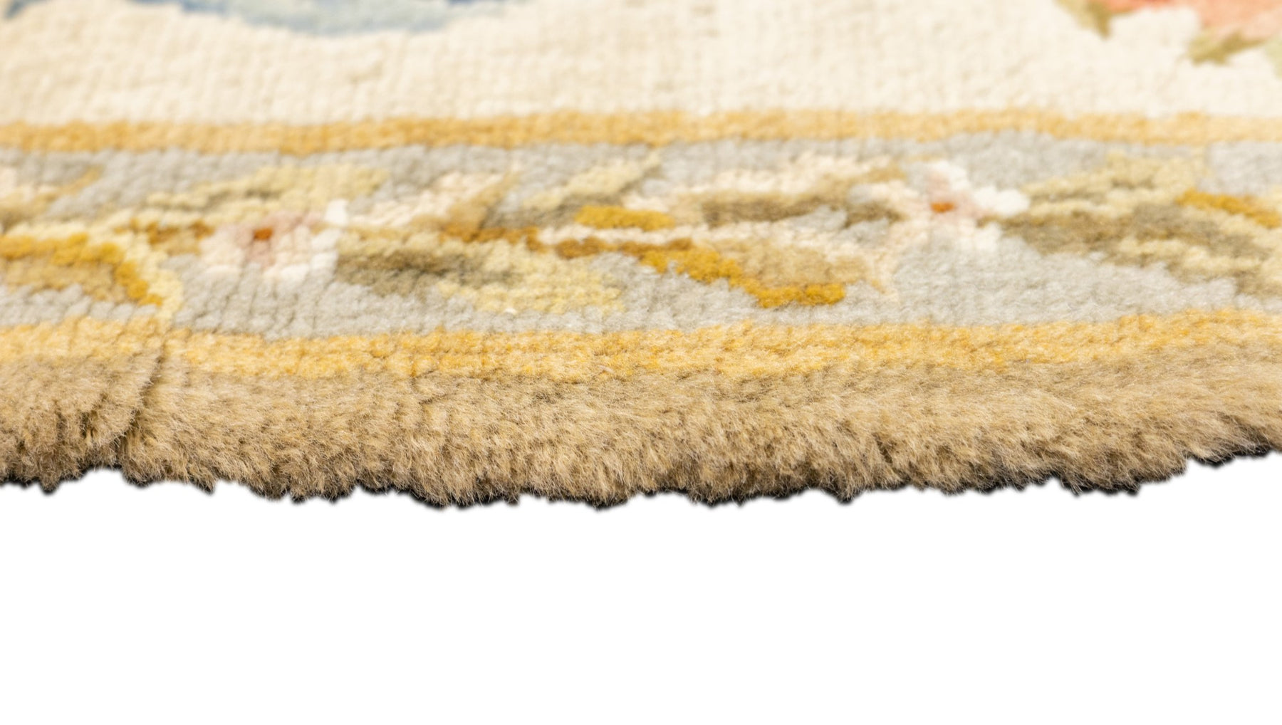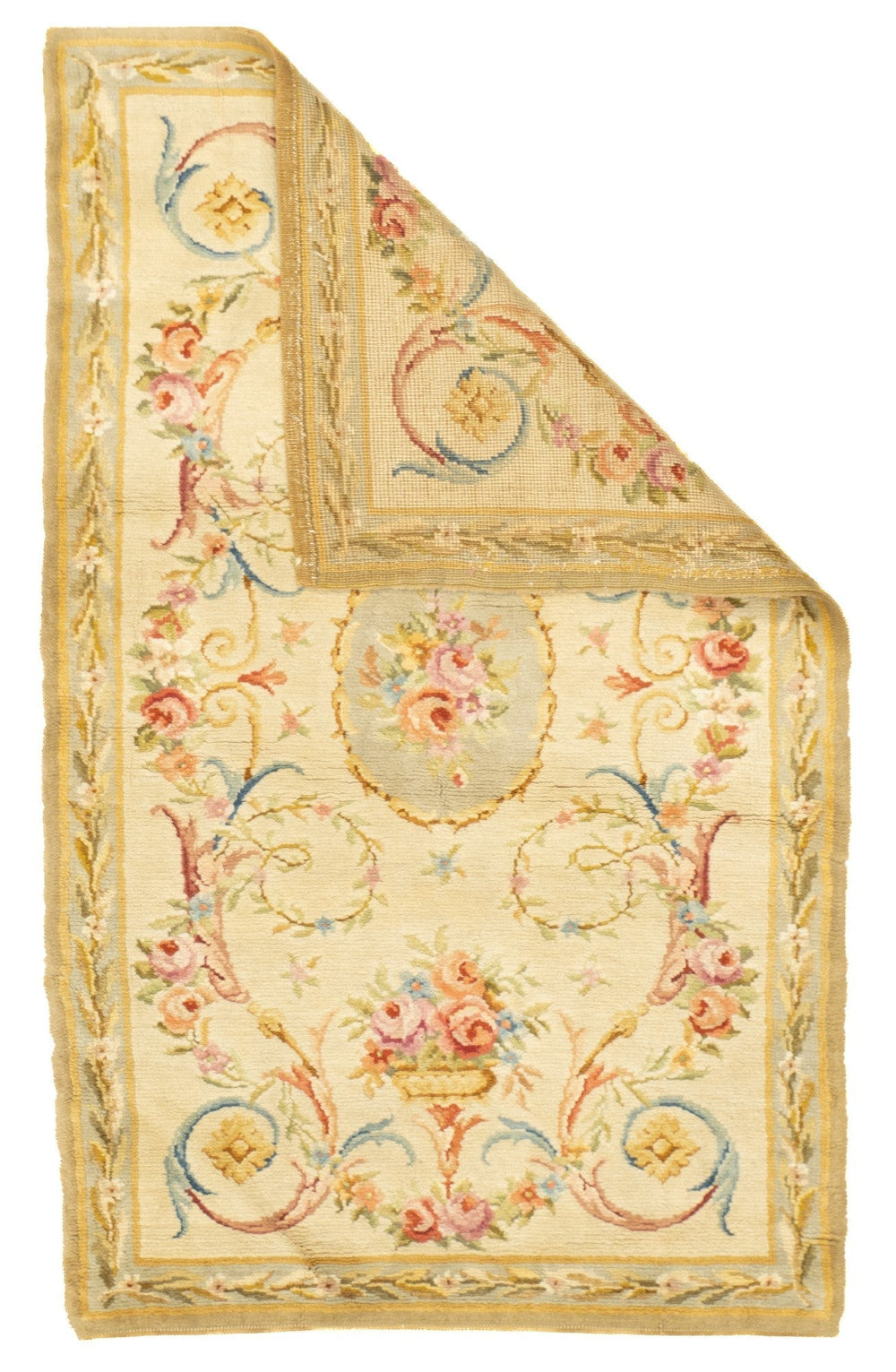 In the Louis XV style, with a straw-ecru field centred by a rose bouquet. Acanthus and rose volutes. Baskets of roses at the field ends. Laurel leaf trail main border. Thick pile, moderate/coarse weave. Good Condition.