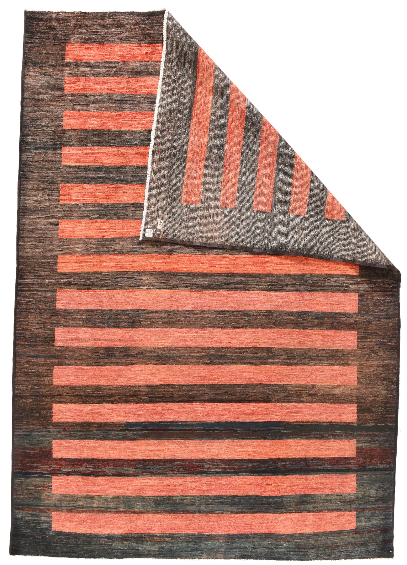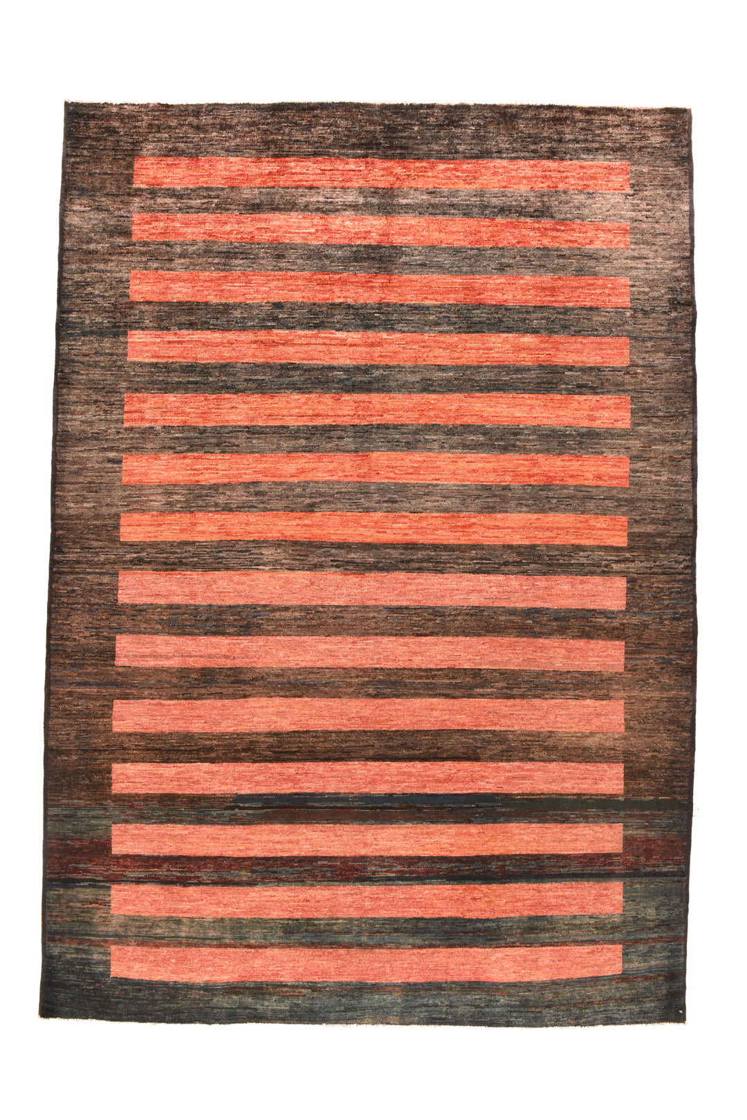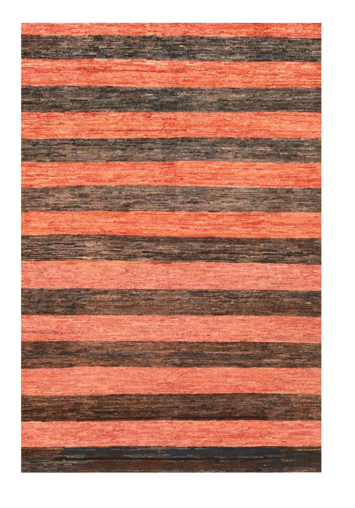 The well-abrashed plain olive border also separates plain stripes of equal width in a salmon-pink tone, forming a kind of washboard grid effect. Who uses washboards these days? Cotton foundation. As new condition.