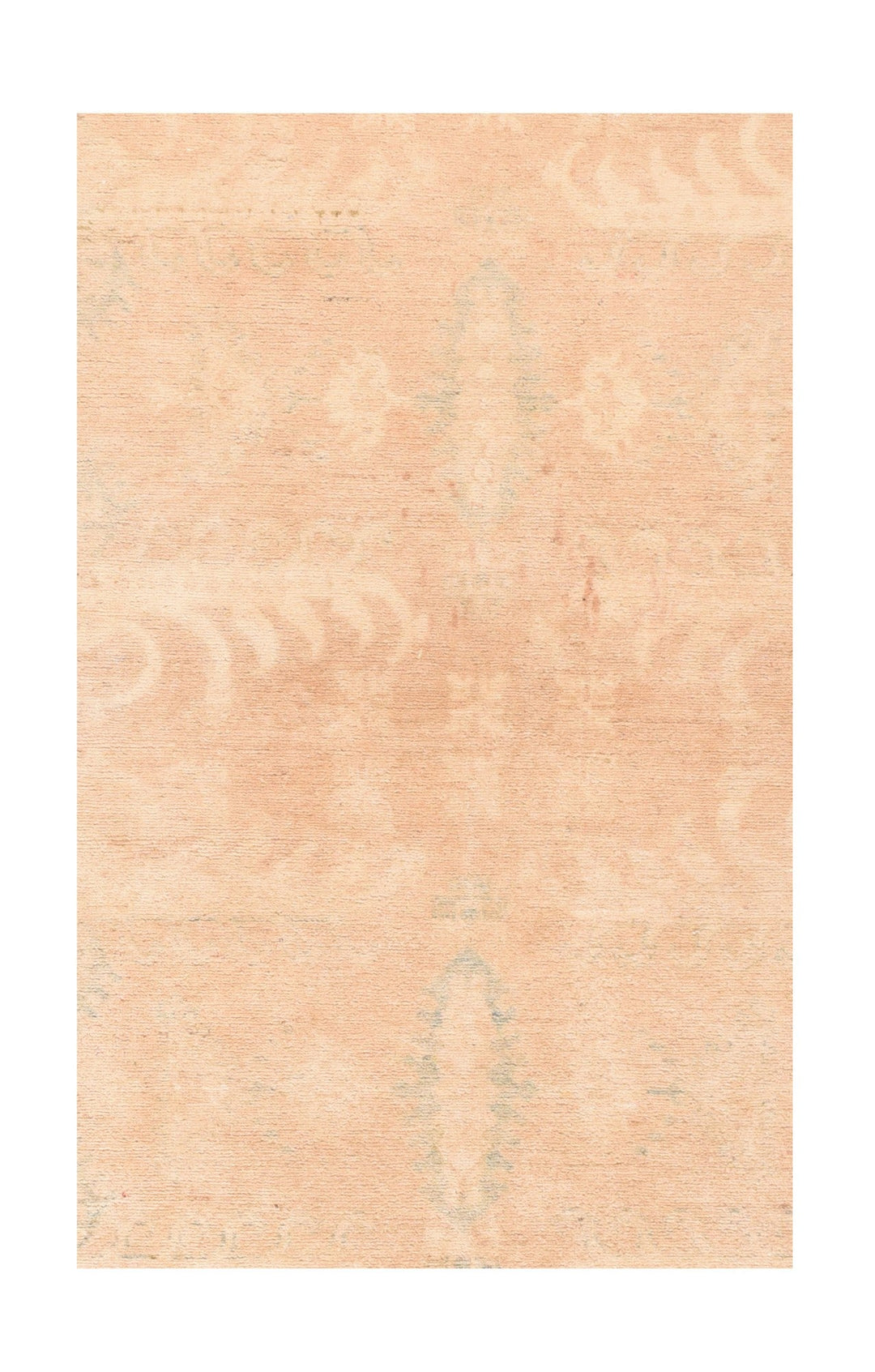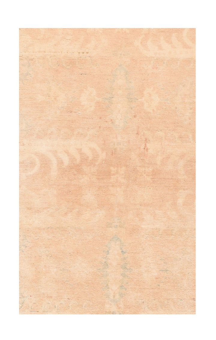 This light tone-on-toe Kellegi (long rug) shows a repeating pattern of eggshell sideways plants with claw foliage, against the beige tone field. Random, Tiny bits of darker brown show up. Cotton foundation, medium weave. As new condition.