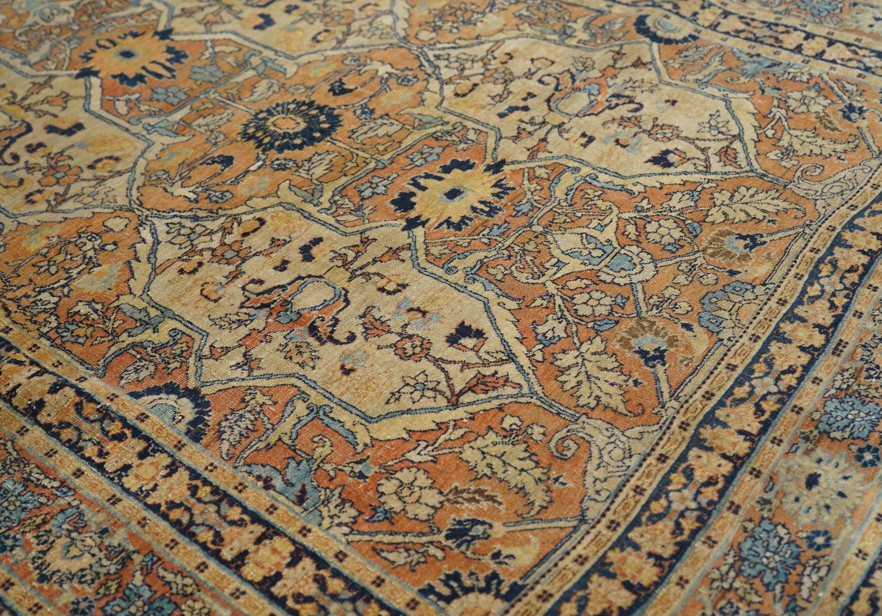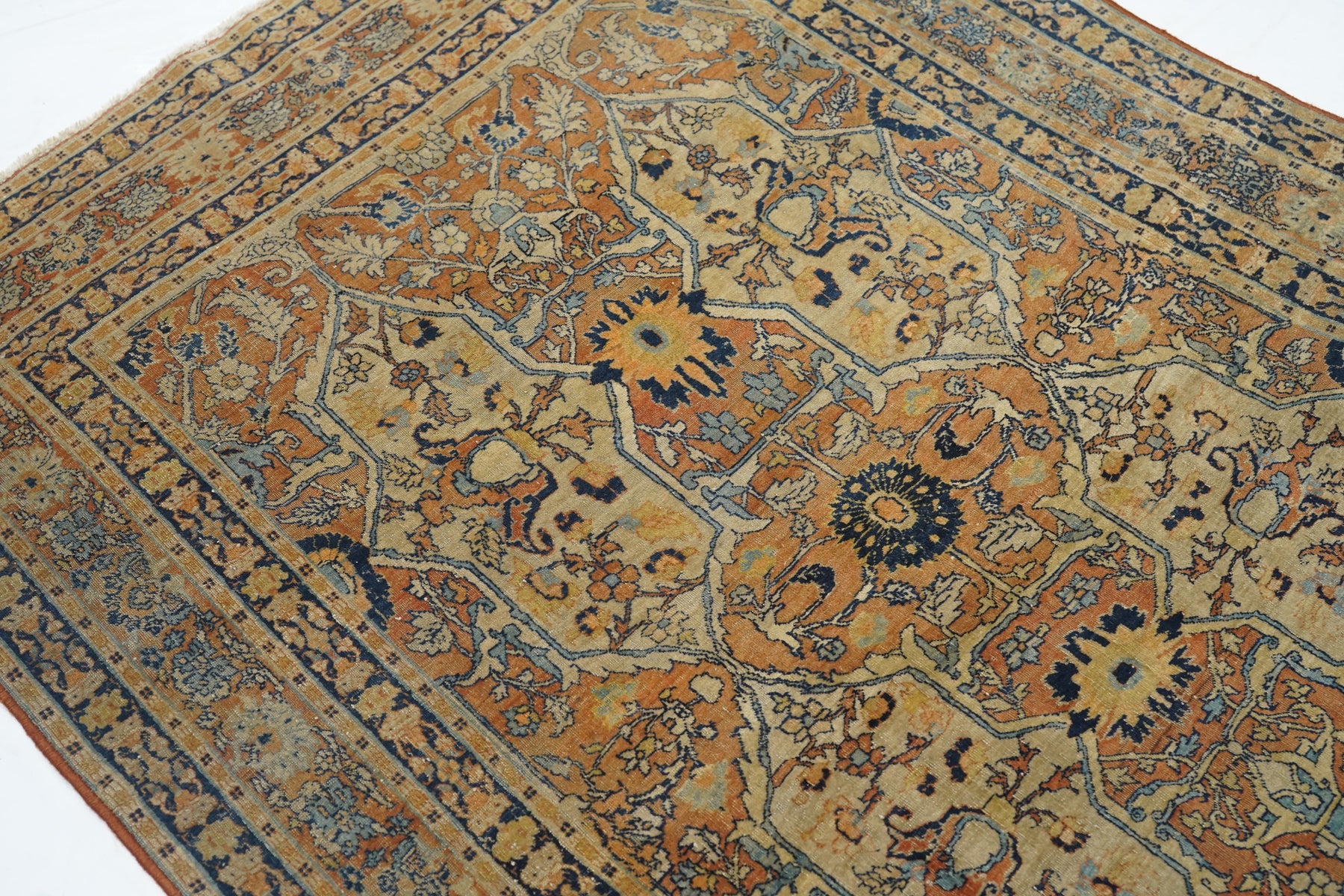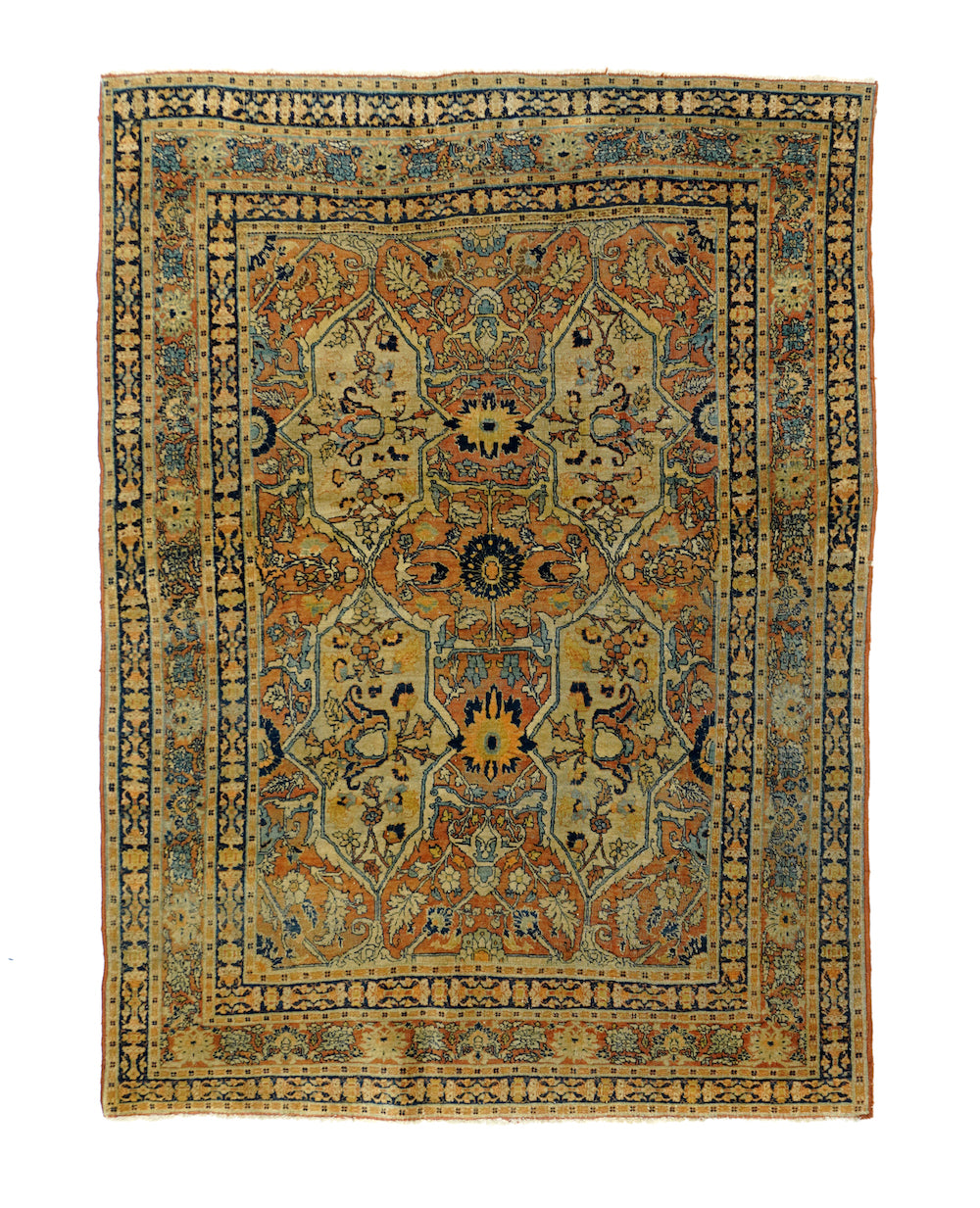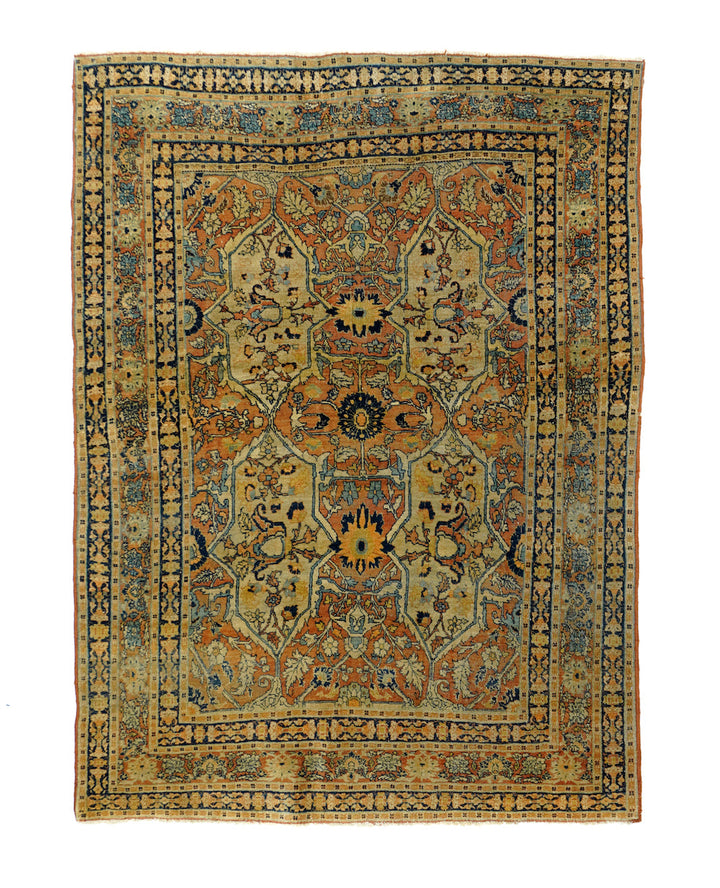 The light rust field displays four upright straw cartouches enclosing "teapot" palmettes and directly end linked. Up the centre is a run of bridging rosettes. Strip style rust main border of palmettes. Crisply, upright, short pile. Navy minor borders and accents overall. Good condition, well woven.