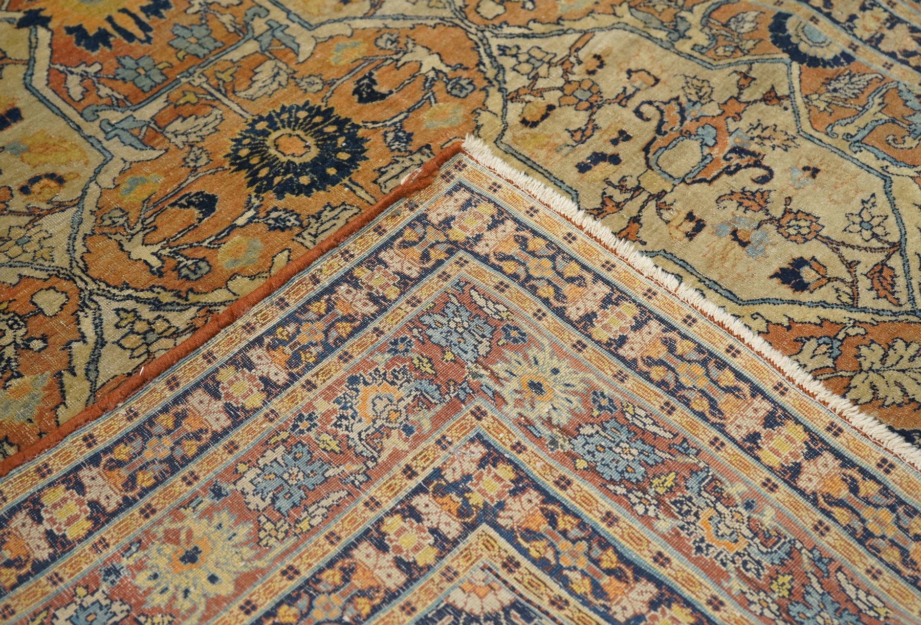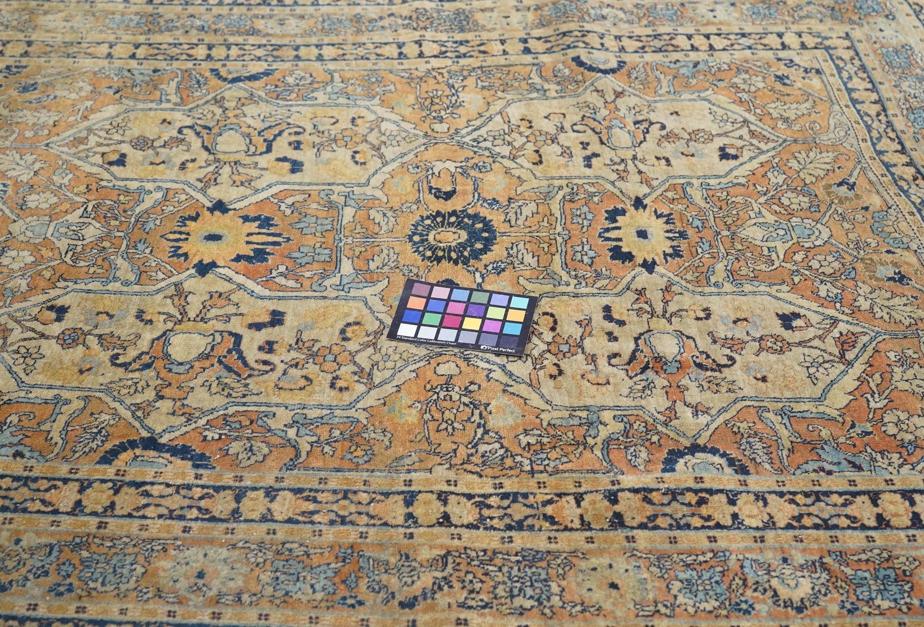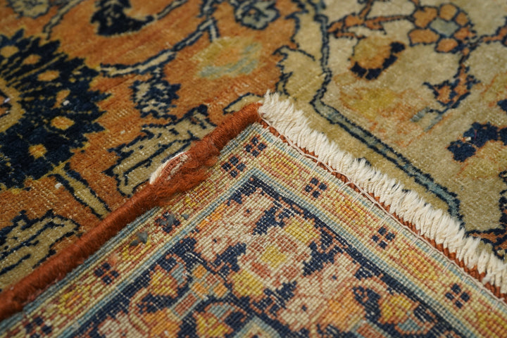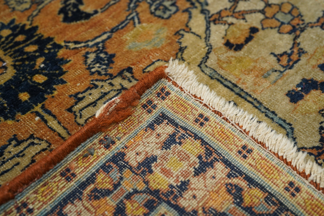 The light rust field displays four upright straw cartouches enclosing "teapot" palmettes and directly end linked. Up the centre is a run of bridging rosettes. Strip style rust main border of palmettes. Crisply, upright, short pile. Navy minor borders and accents overall. Good condition, well woven.