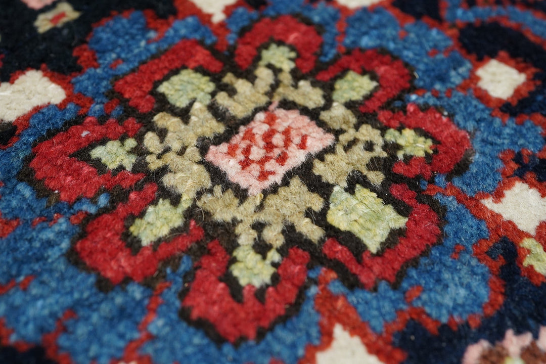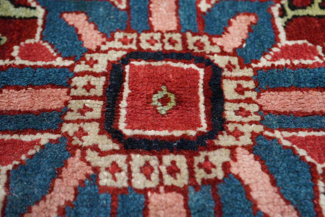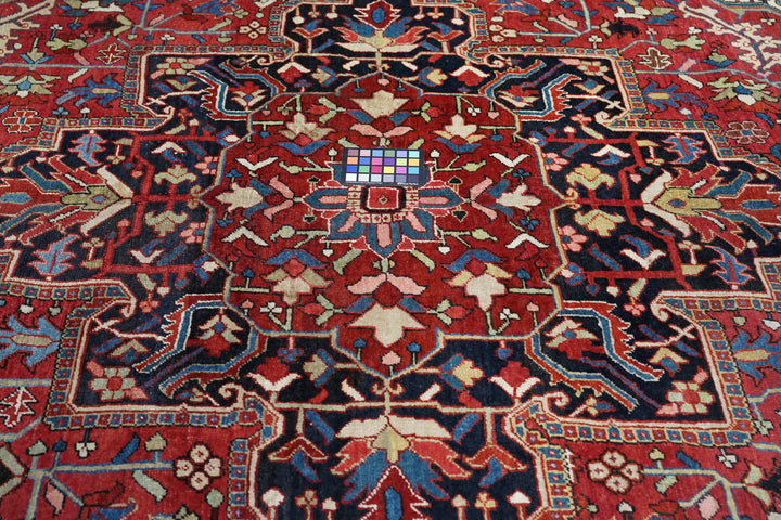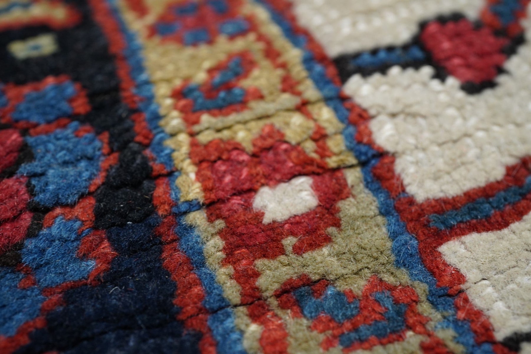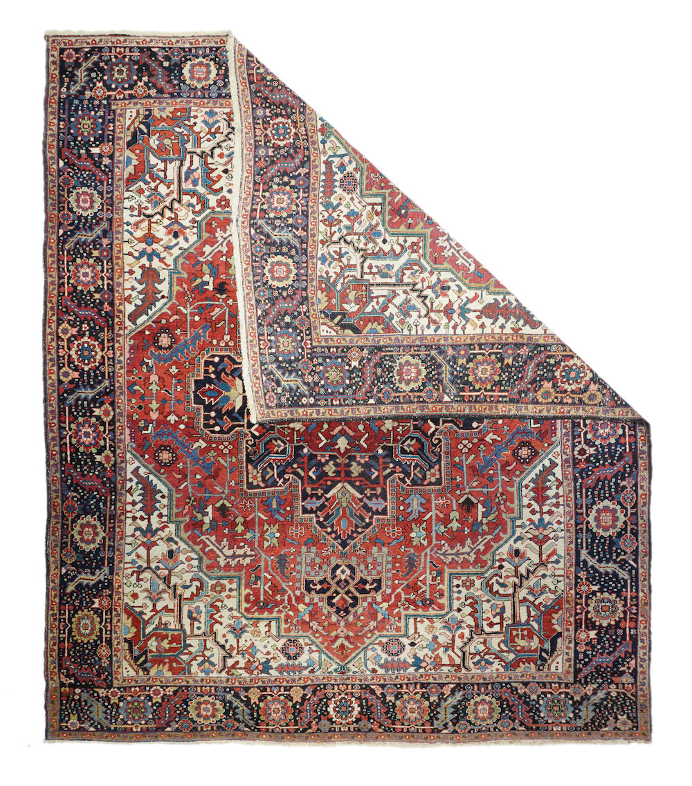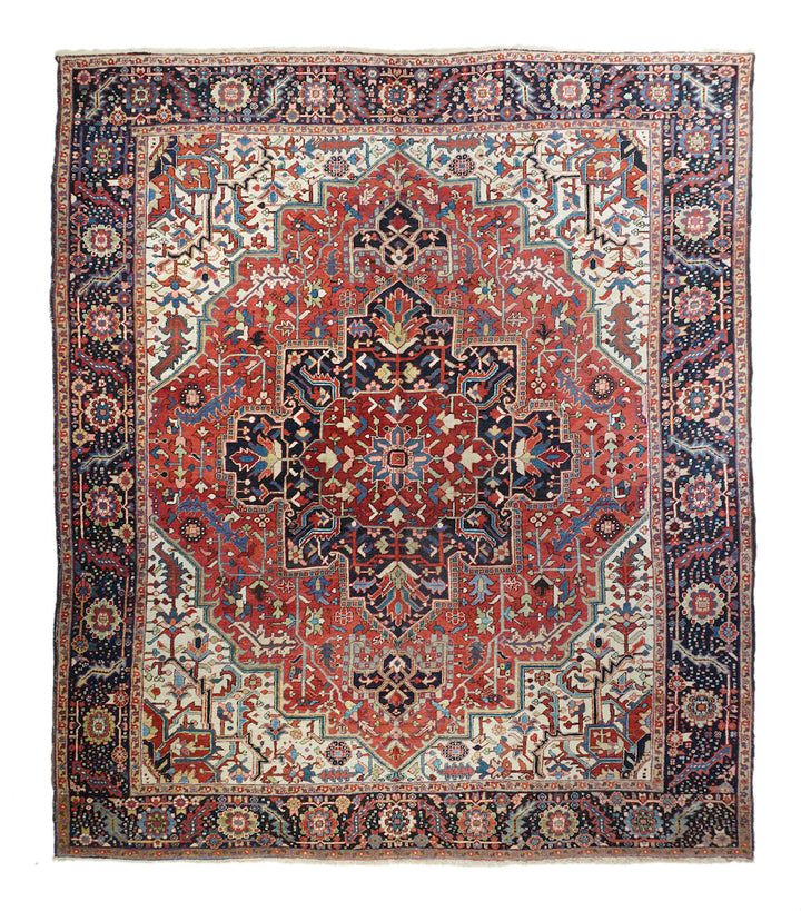 This well-woven, “Serapi” quality room size rustic carpet shows a stepped and angled abrashed red field supporting a pendanted navy stepped and lobed medallion with an inner blood red square floral cartouche. Ecru corners with mobile formal vinery and palmettes. Navy strip border with rosettes, dots and doubly bent leaves. Three reds and a magnificent green. Cotton foundation. Good condition.