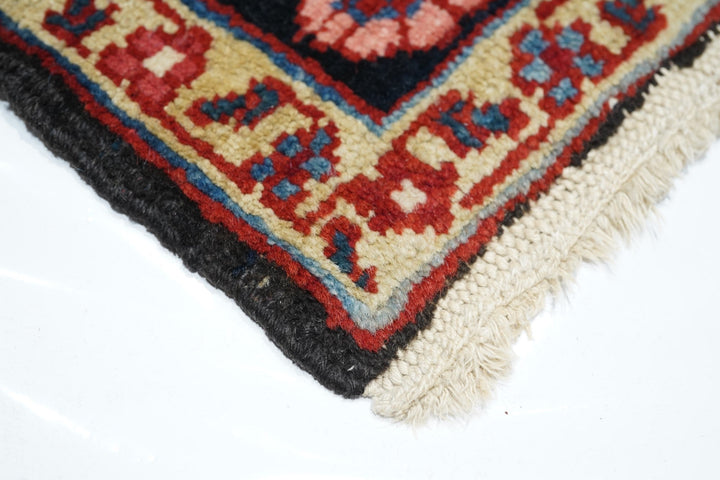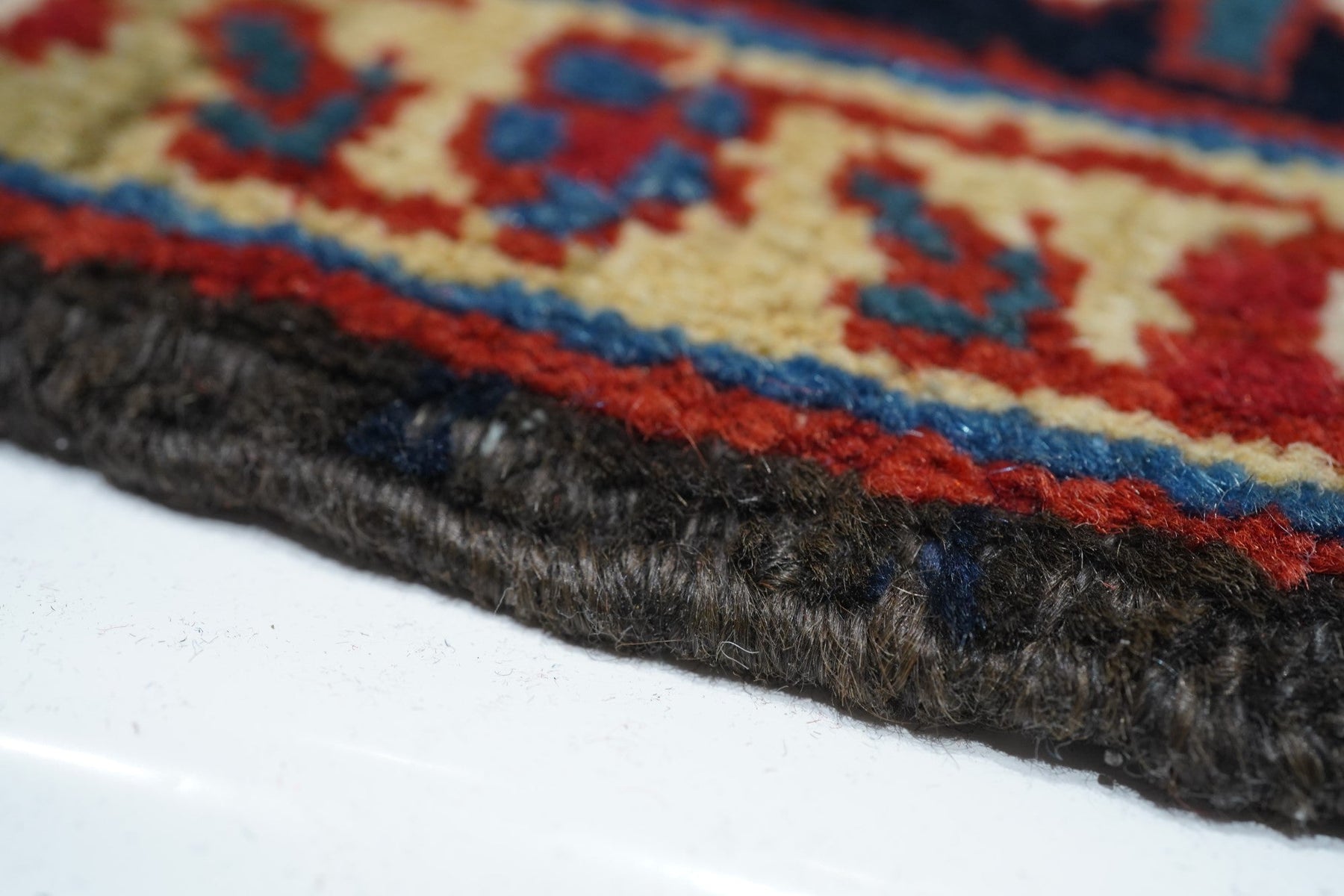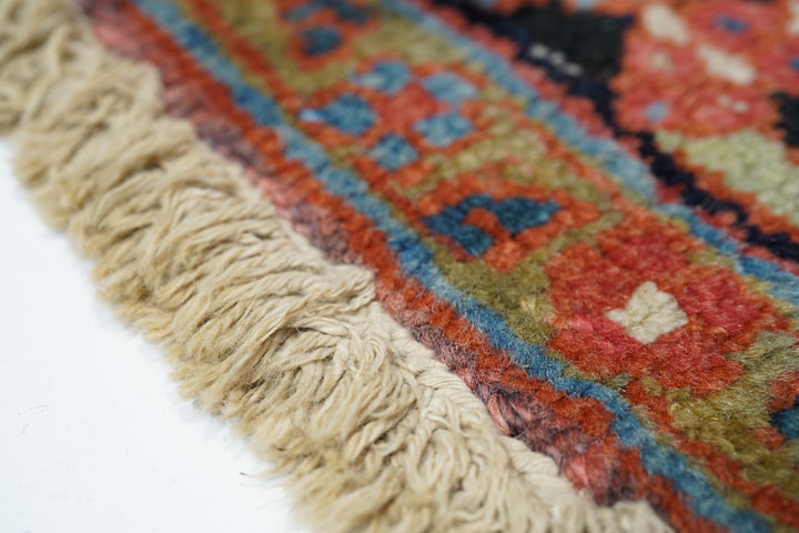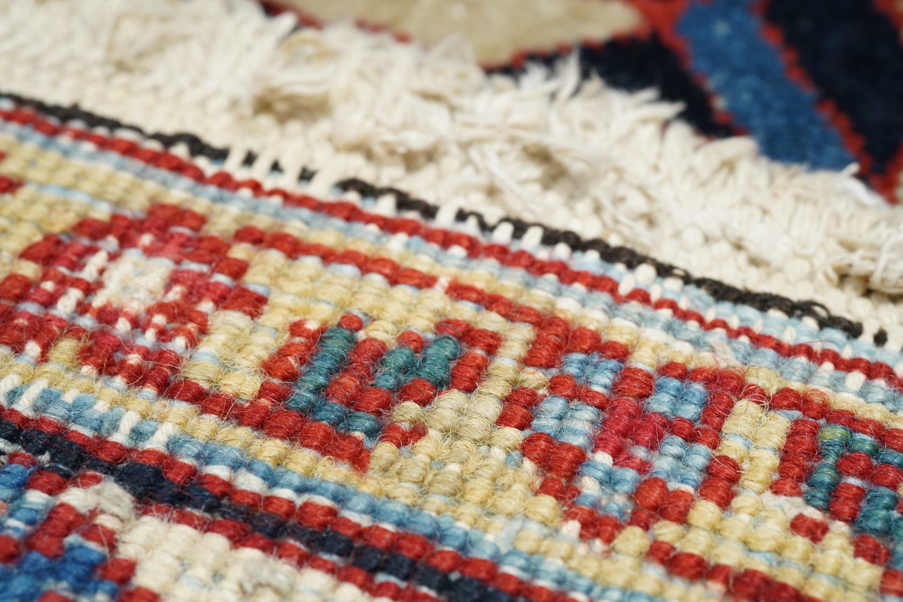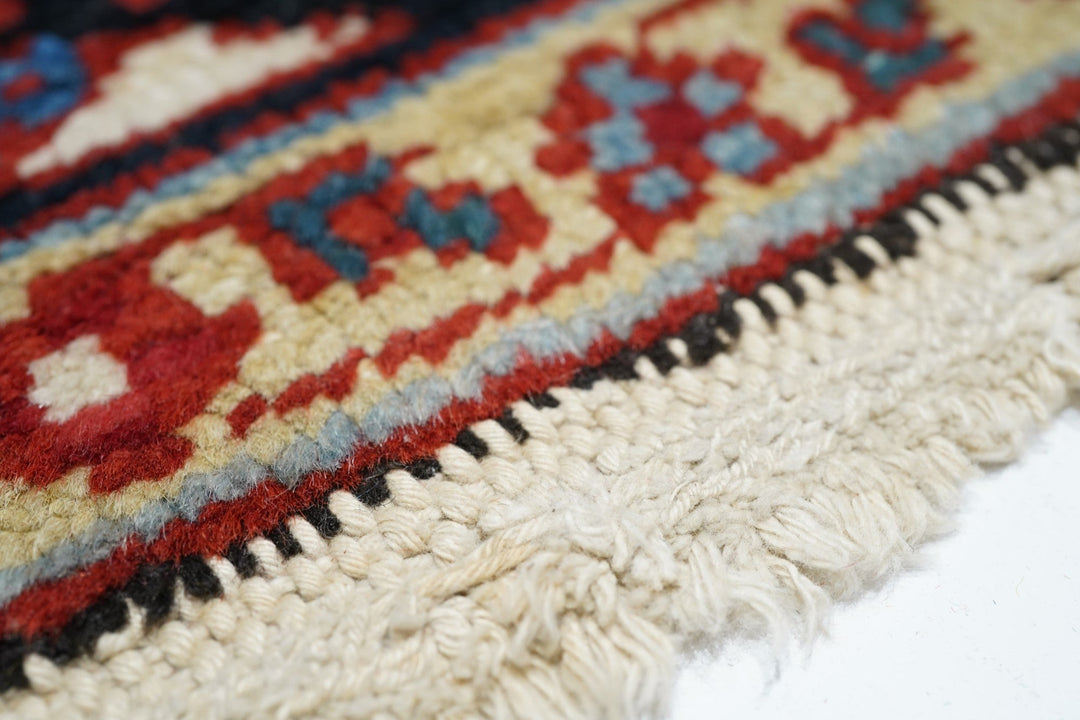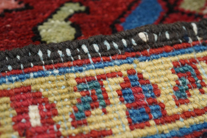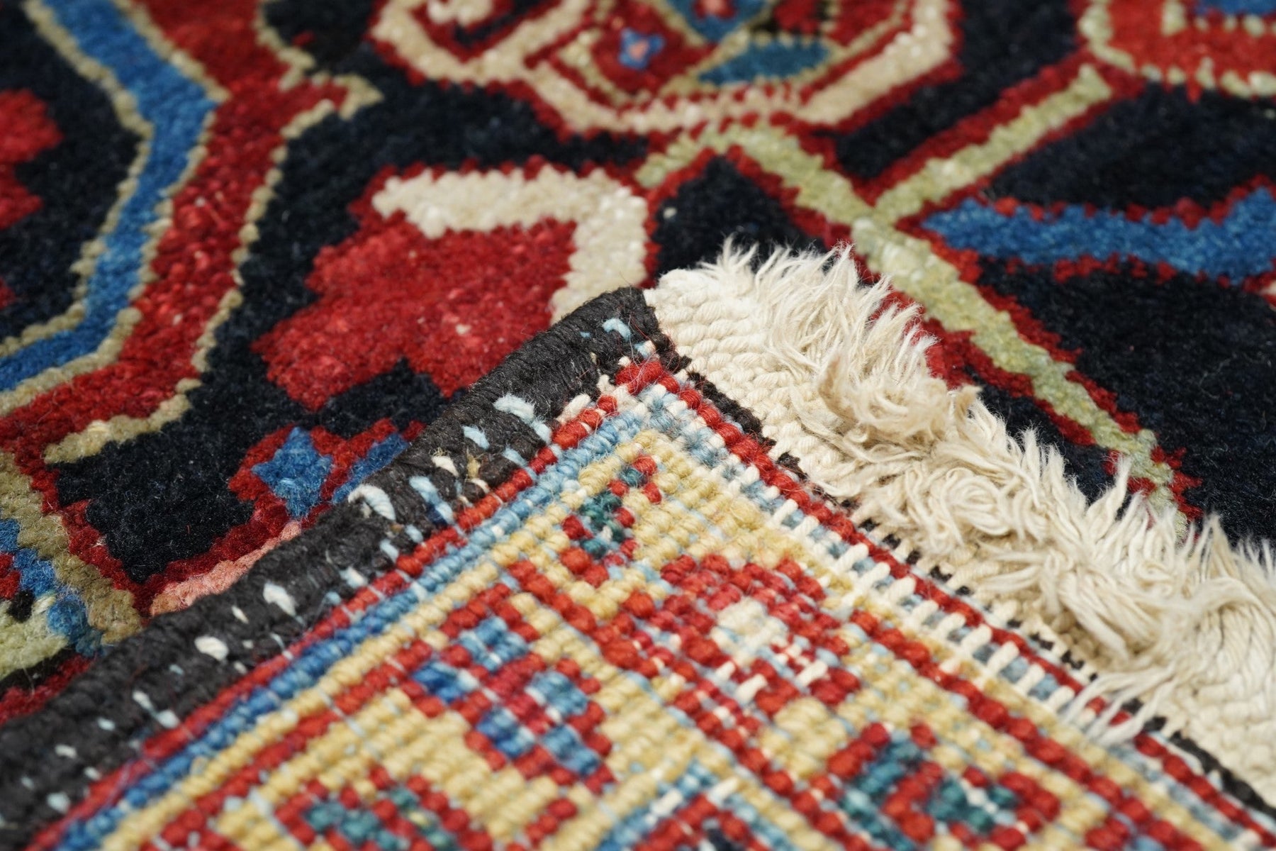 This well-woven, “Serapi” quality room size rustic carpet shows a stepped and angled abrashed red field supporting a pendanted navy stepped and lobed medallion with an inner blood red square floral cartouche. Ecru corners with mobile formal vinery and palmettes. Navy strip border with rosettes, dots and doubly bent leaves. Three reds and a magnificent green. Cotton foundation. Good condition.