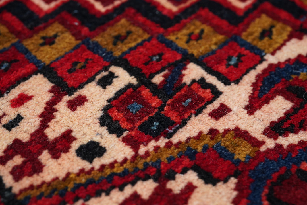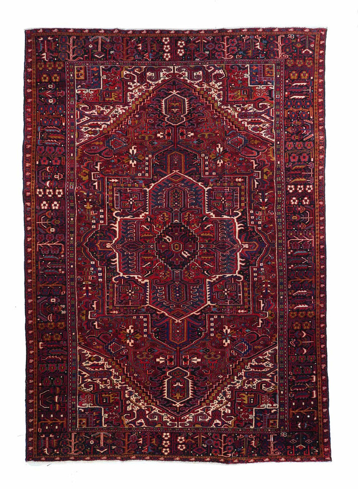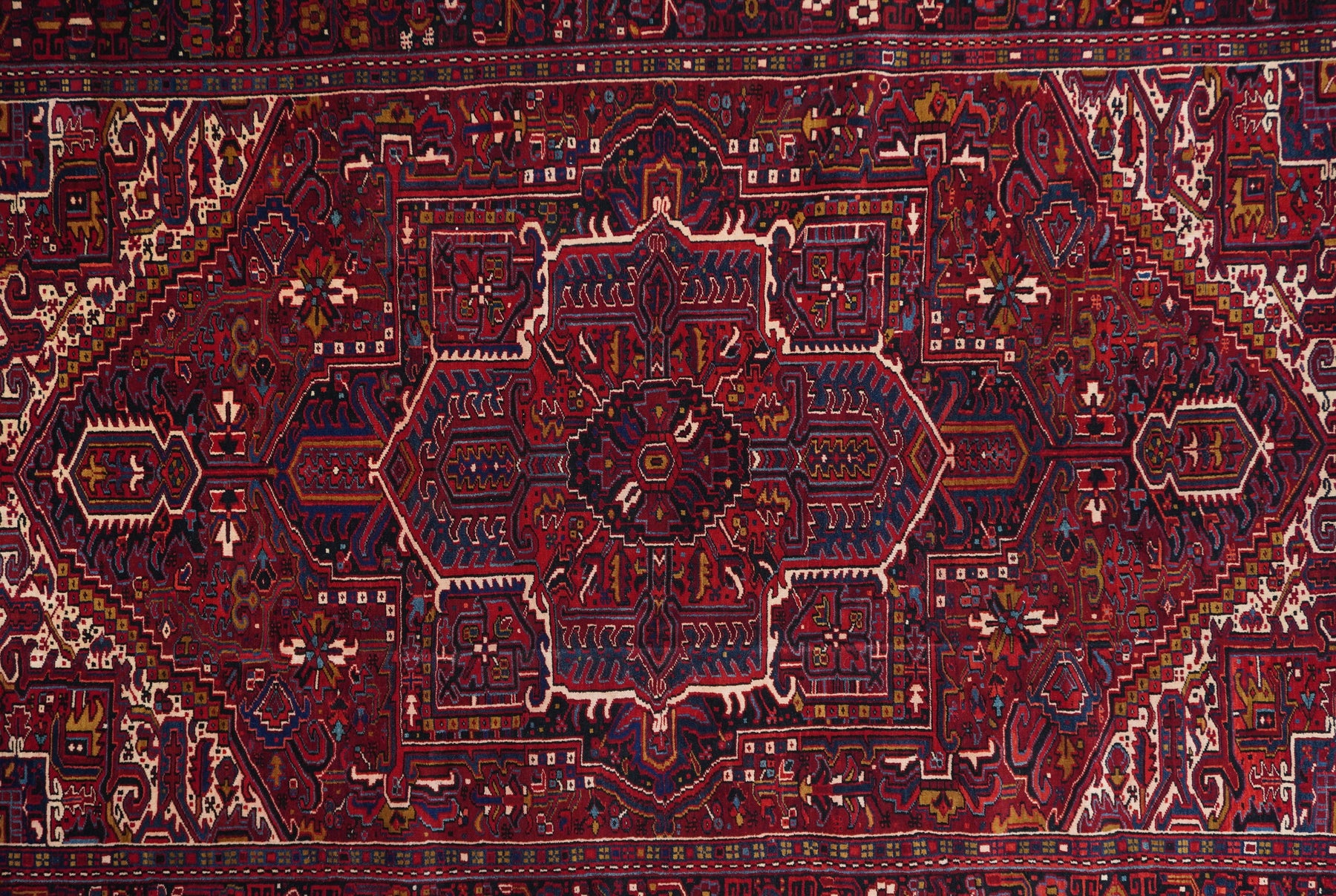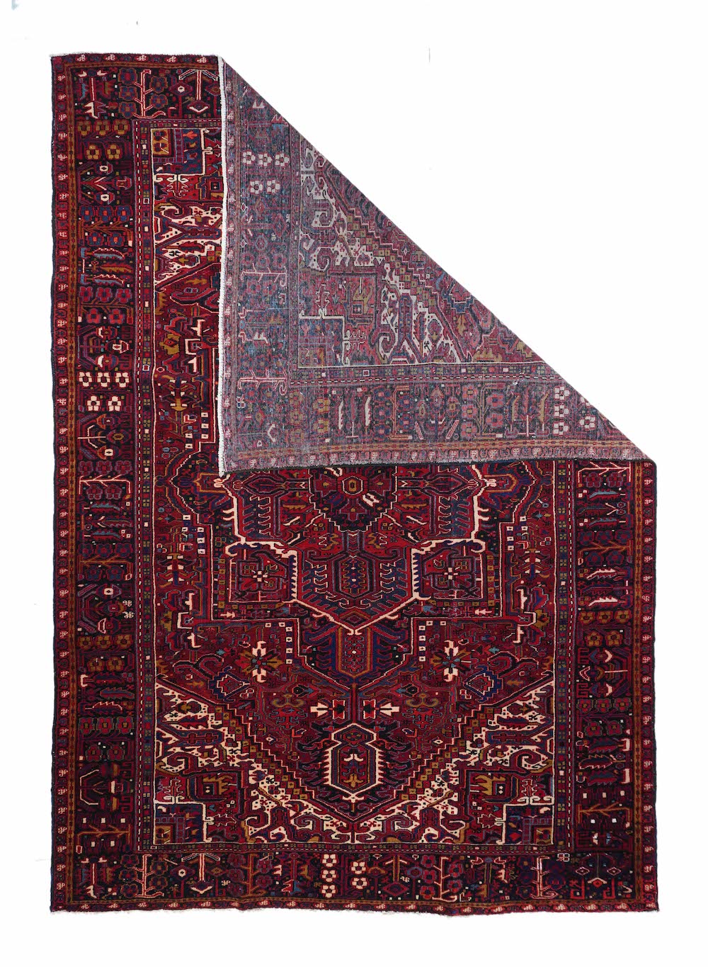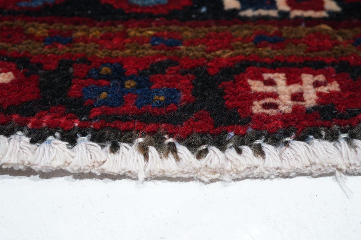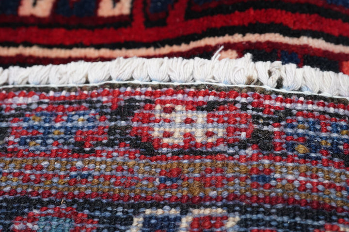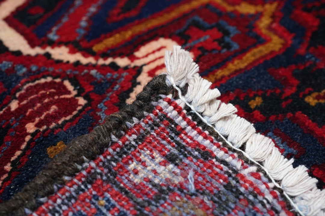 A post-WWII carpet with saturated palette, but a traditional design. Red field with red medallion and stepped navy sub-medallion. Layered ragged palmette navy pendants and well-packed minor devices. Ecru stepped corners with red square inner devices. Unusual red strip-style border with five-posy elements, barbed leaves and upright full flowers. Moderate/coarse weave on cotton. NW Persian village carpet with a ruby jewel-like tonality.