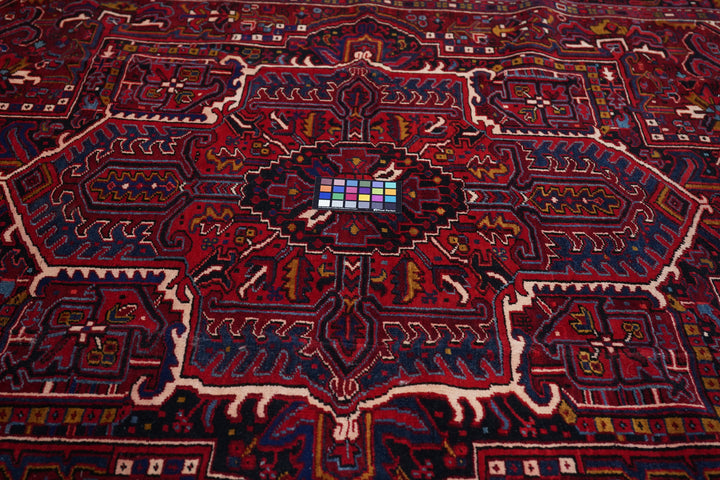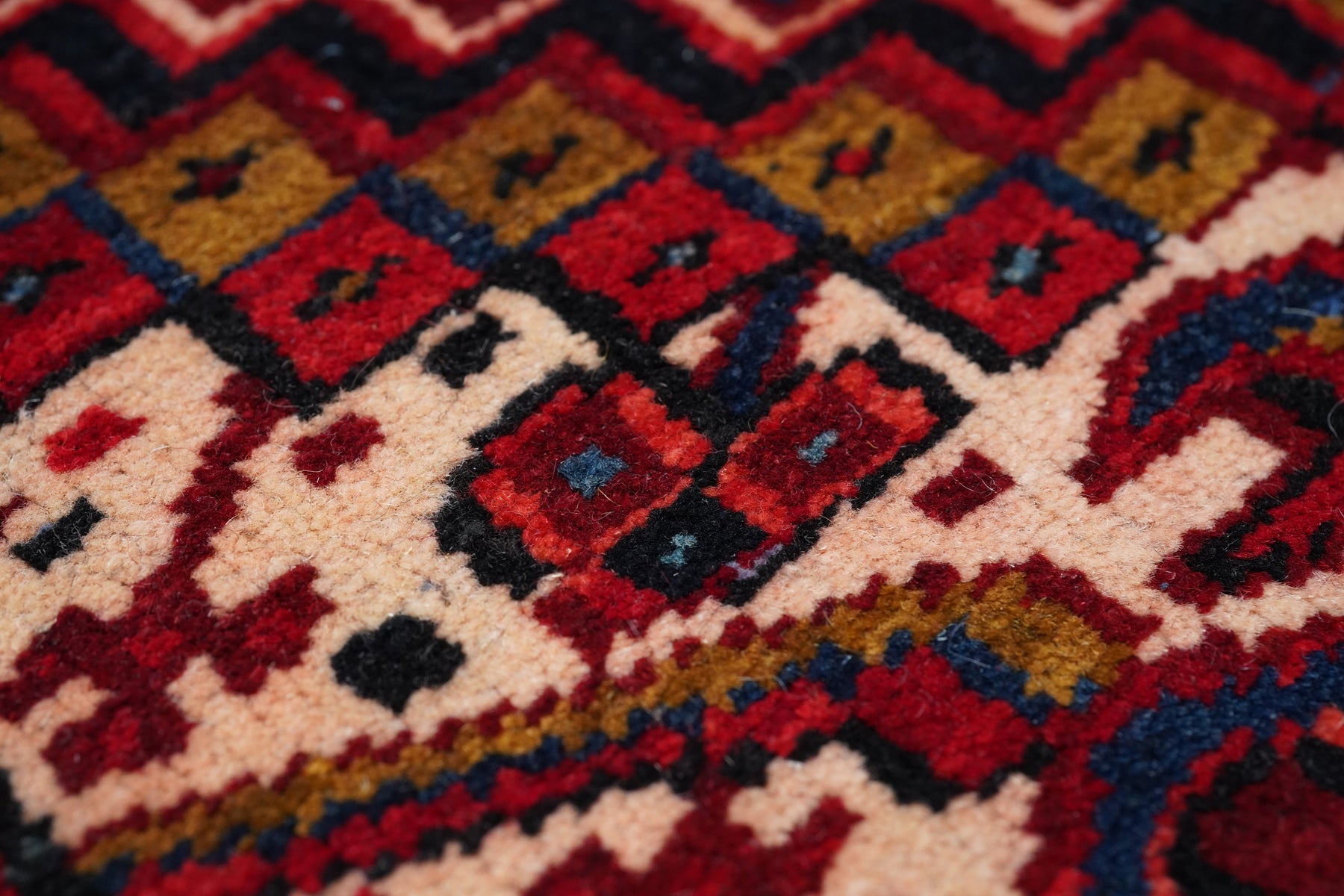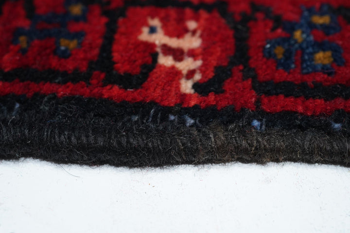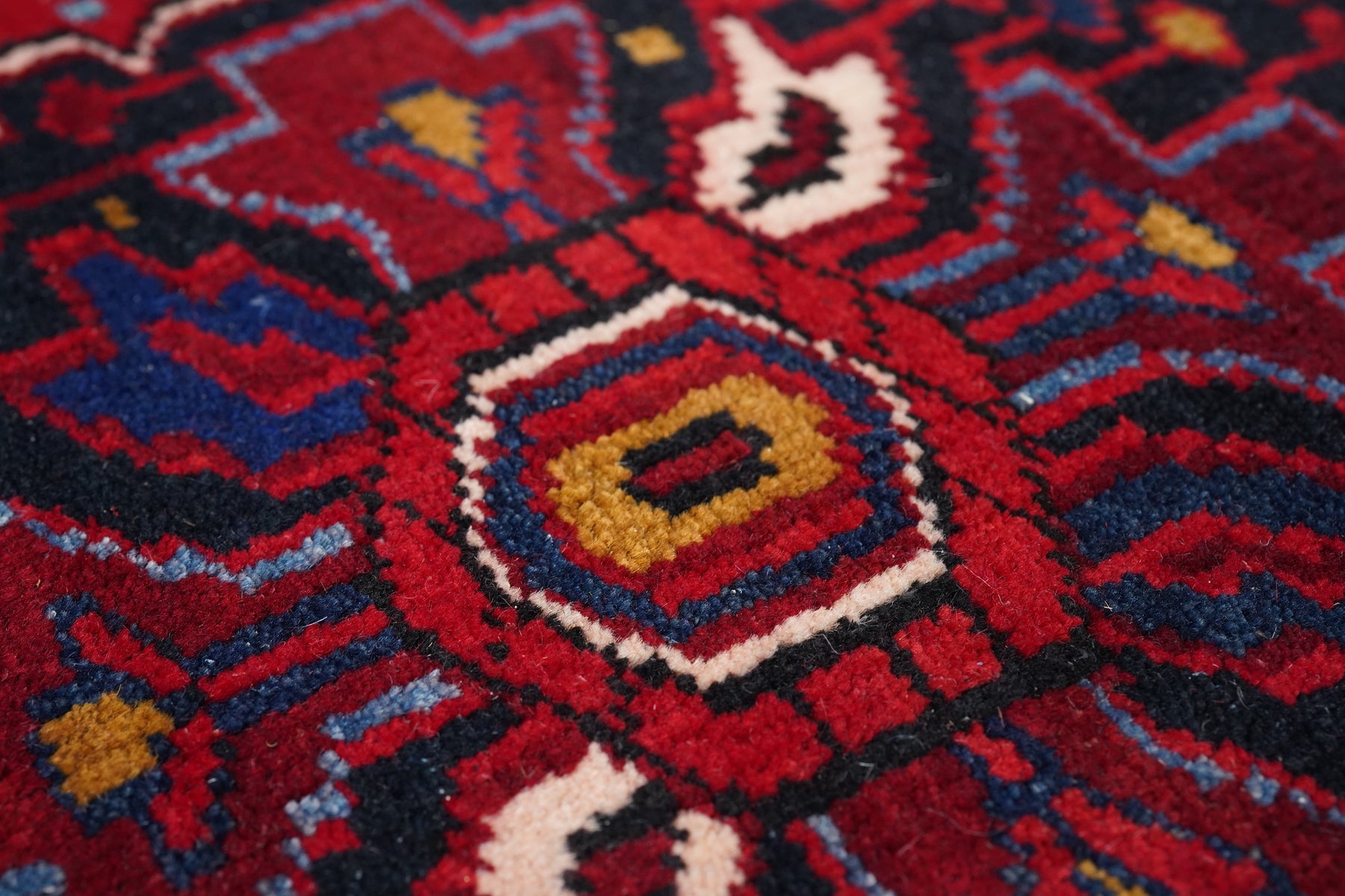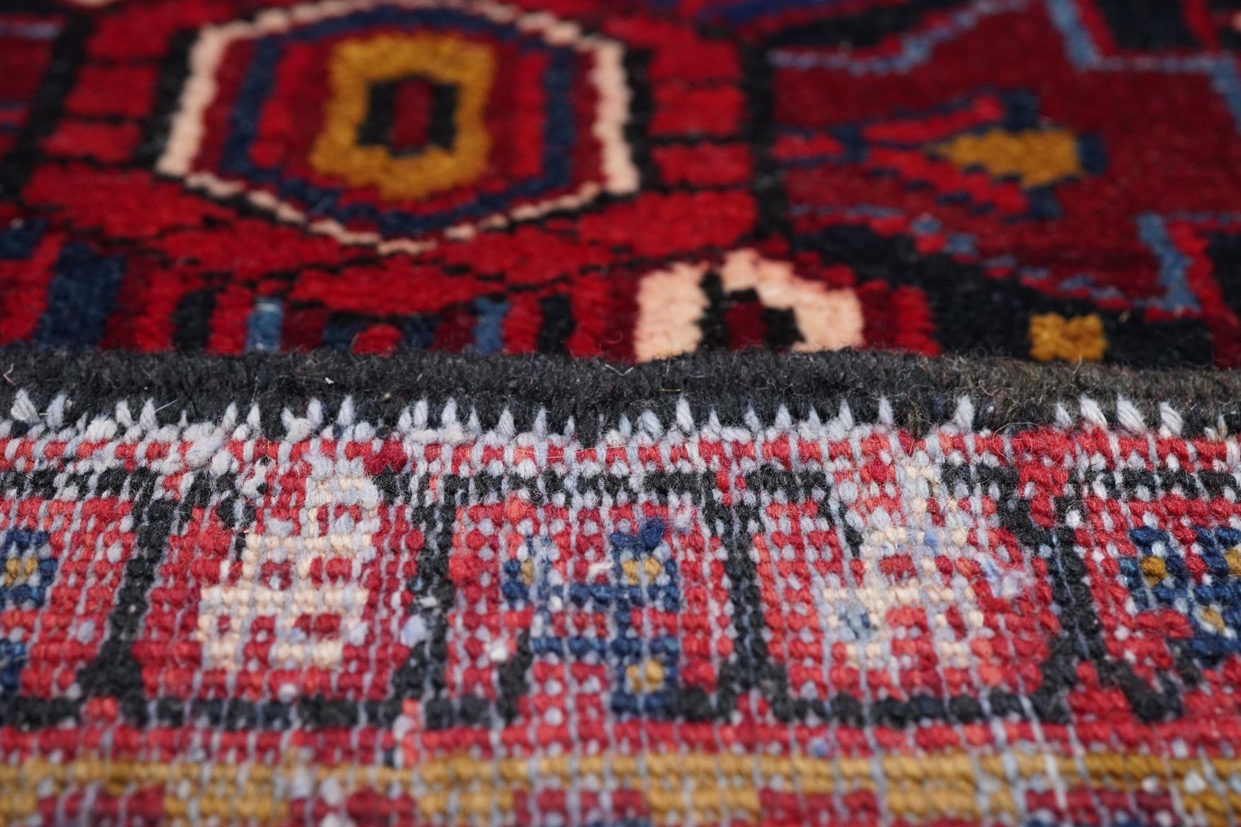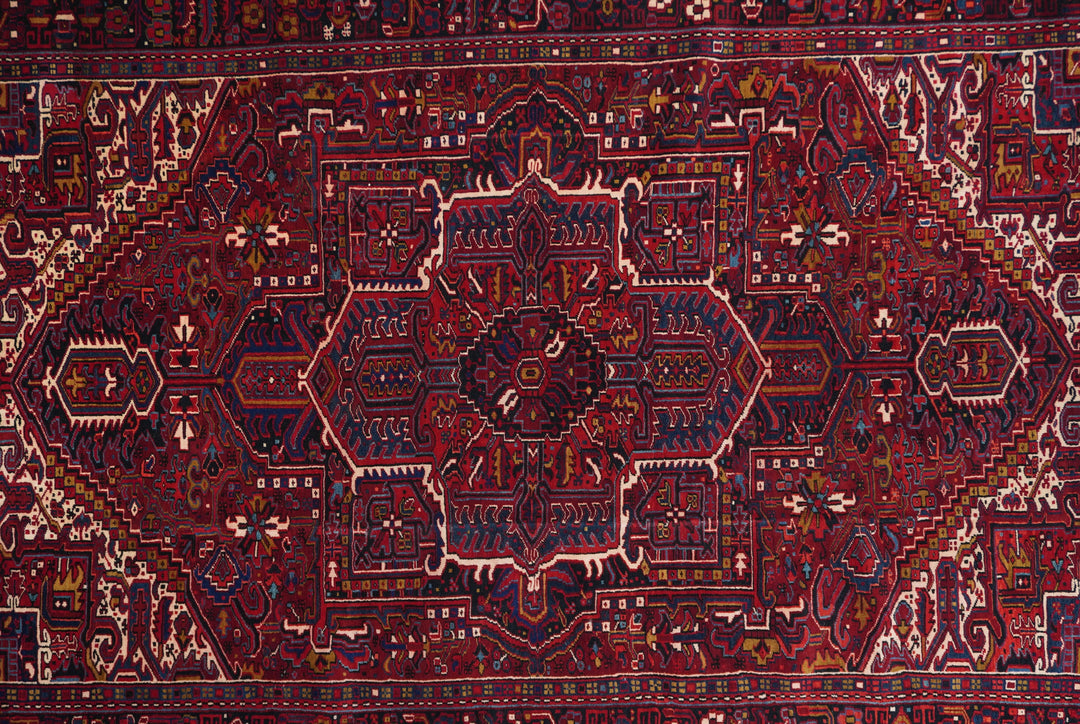 A post-WWII carpet with saturated palette, but a traditional design. Red field with red medallion and stepped navy sub-medallion. Layered ragged palmette navy pendants and well-packed minor devices. Ecru stepped corners with red square inner devices. Unusual red strip-style border with five-posy elements, barbed leaves and upright full flowers. Moderate/coarse weave on cotton. NW Persian village carpet with a ruby jewel-like tonality.