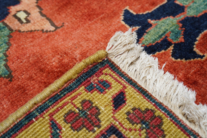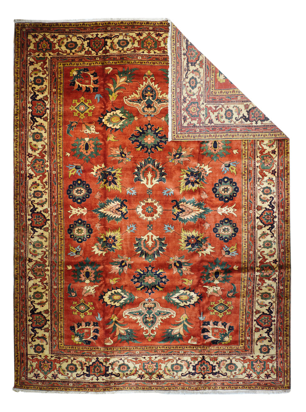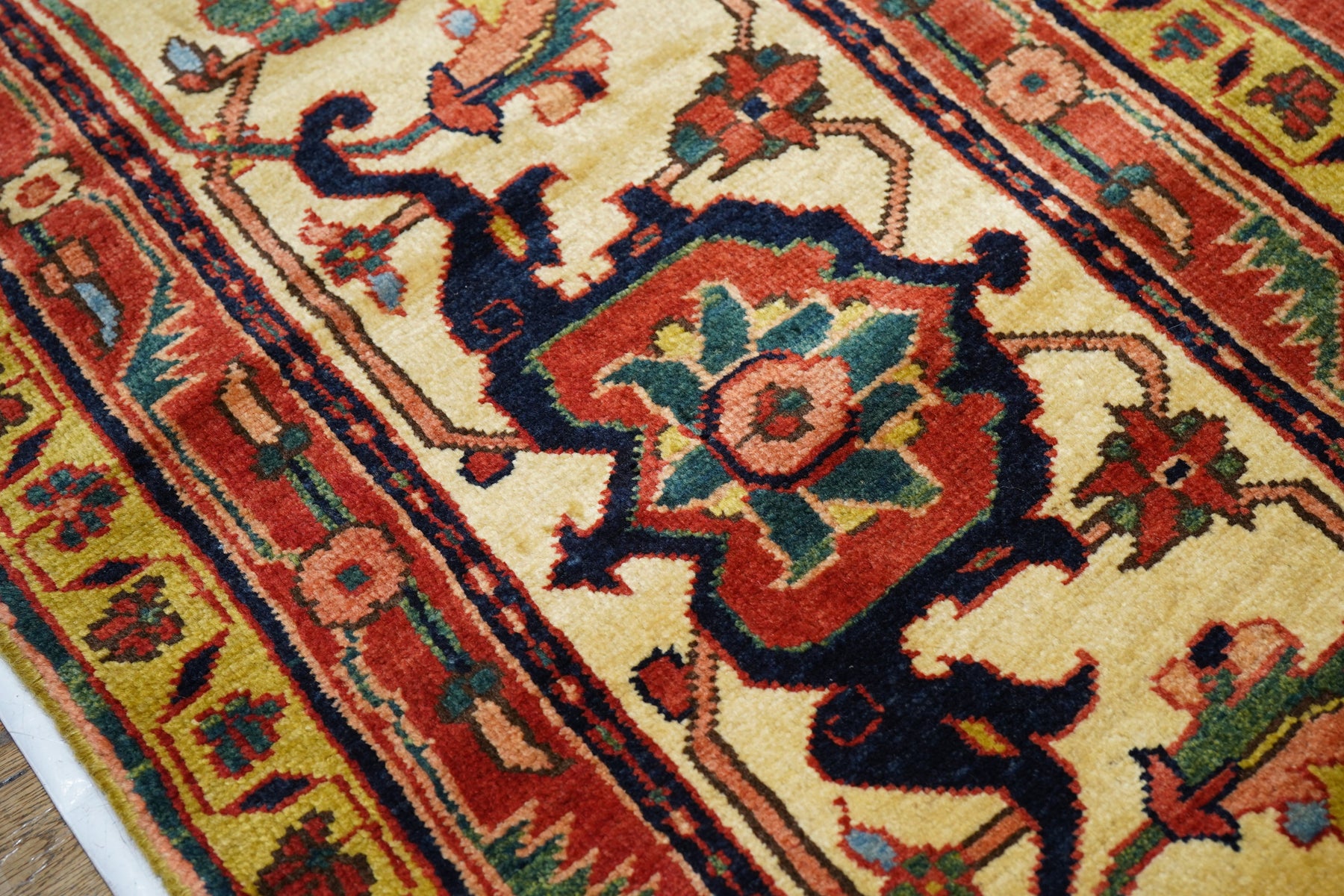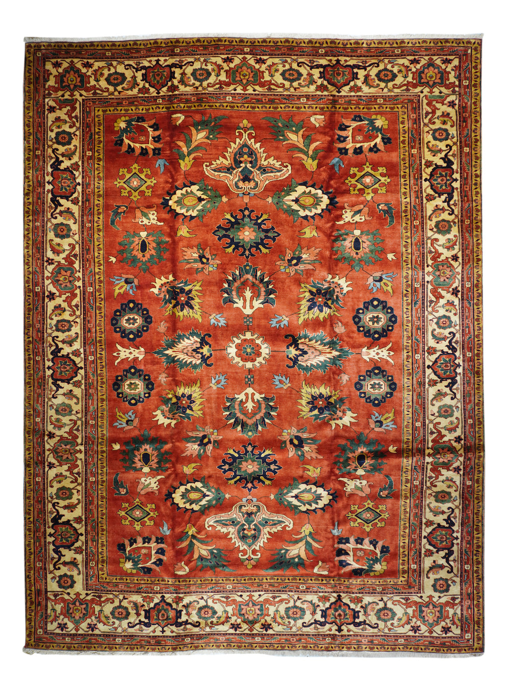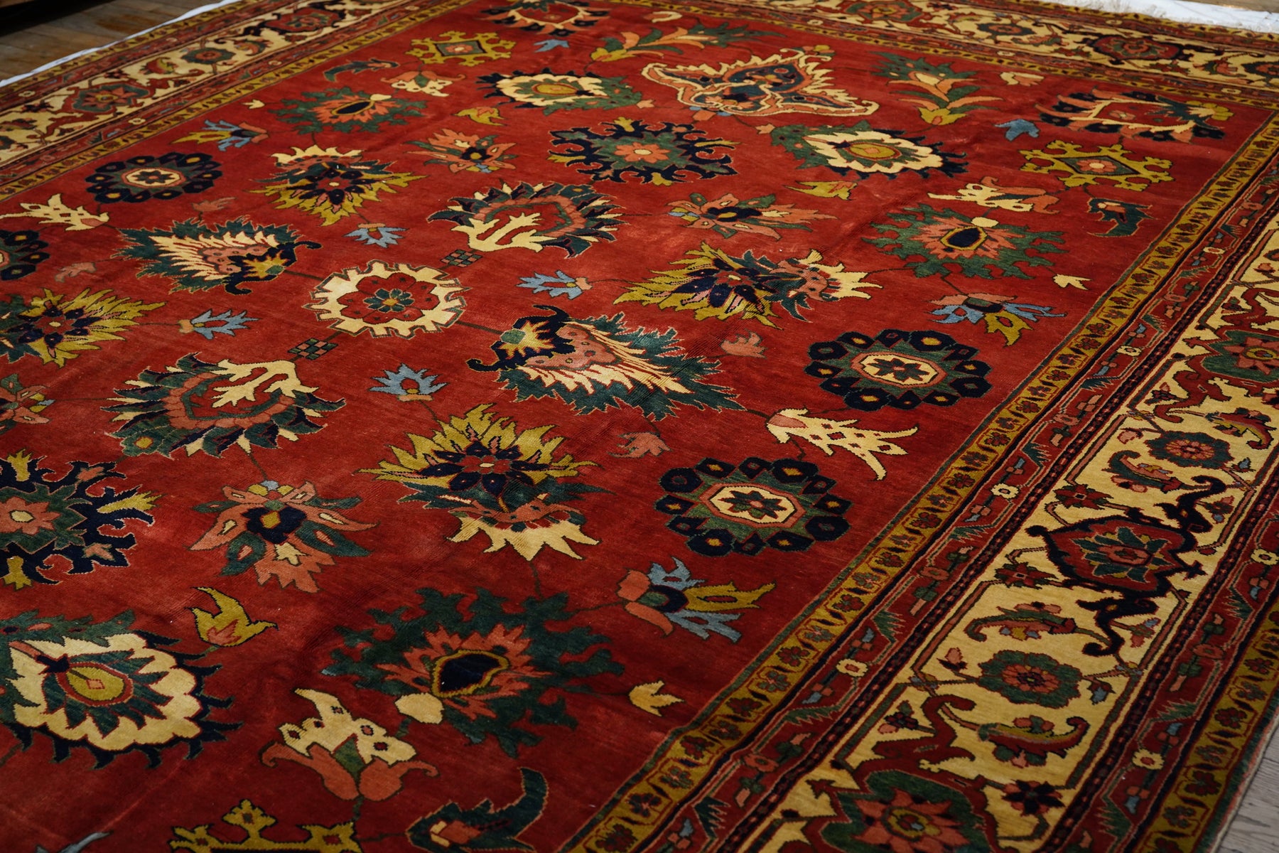 This relatively recent NW Persian village carpet features an abrashed rust-red field symmetrically displaying a central cogwheel rosette, tilted, upright and lazy petal palmettes, other rosettes, and flaming winged pendants. Ivory strip-style main border with well-spaced reversing turtles. Moderate weave. A very attractive village NW Persian carpet showing current design trends while still not departing from characteristic local "rugginess".
