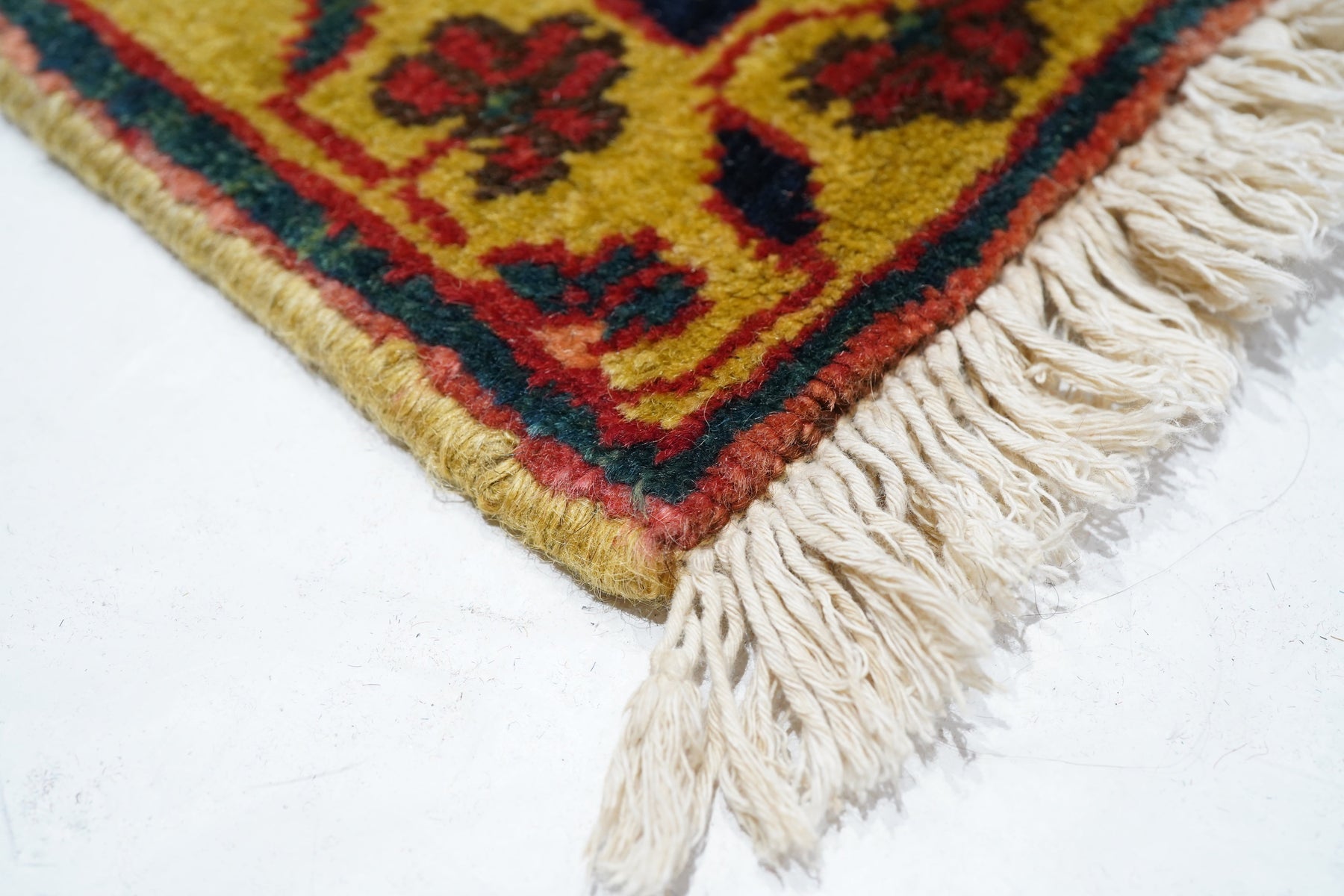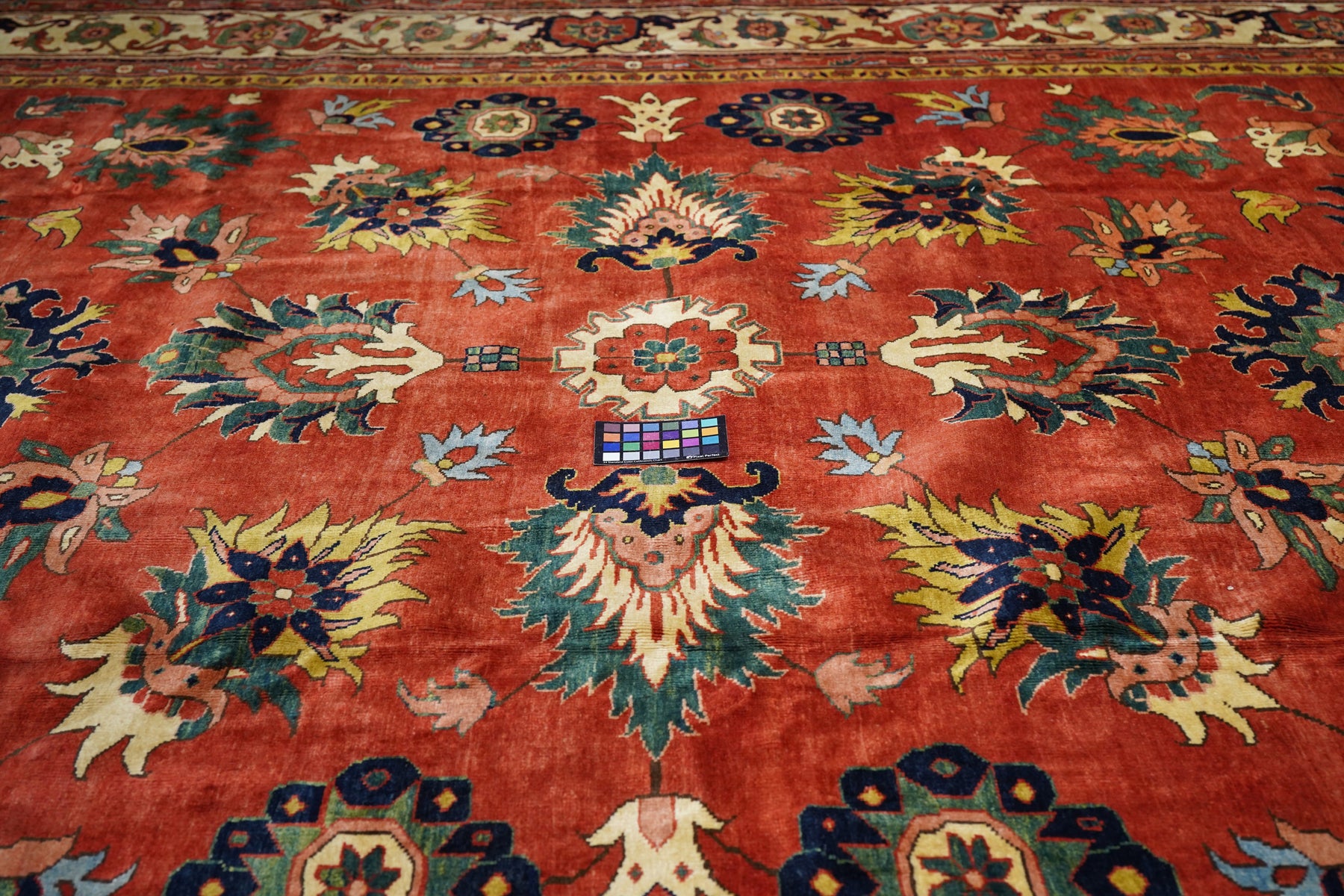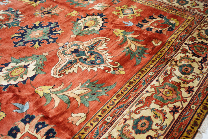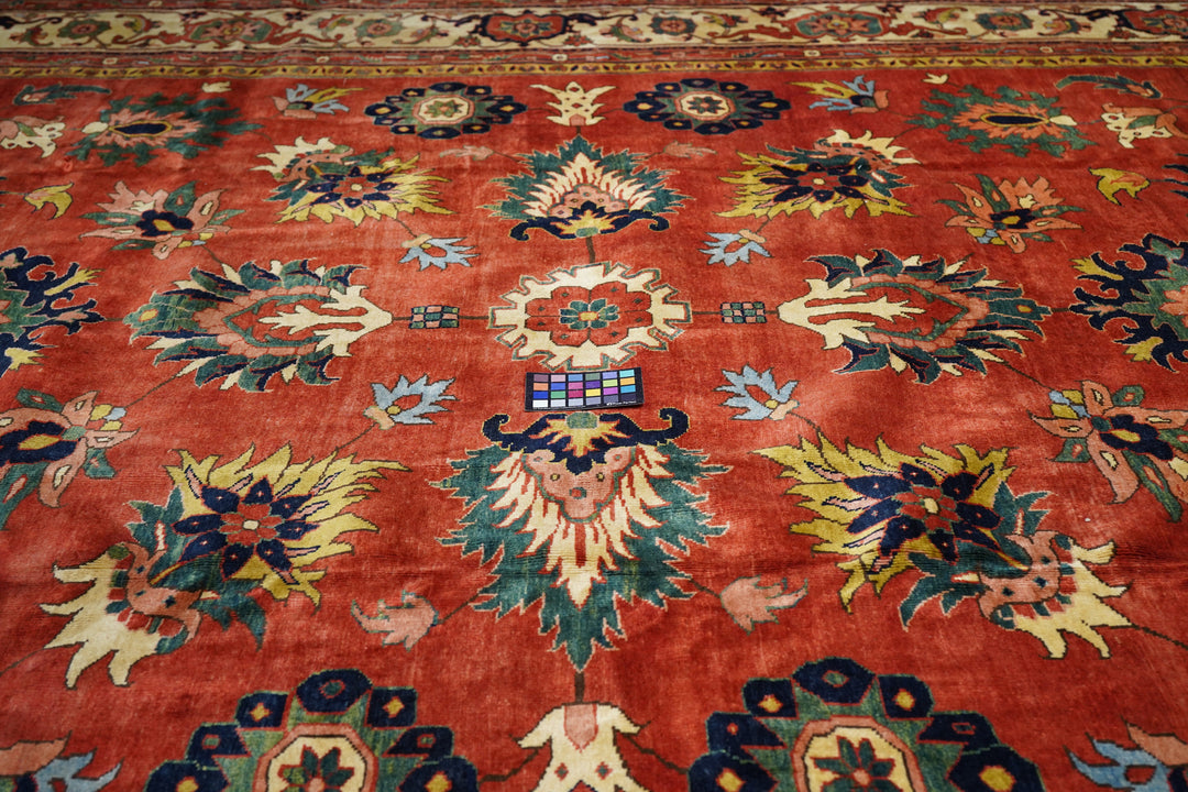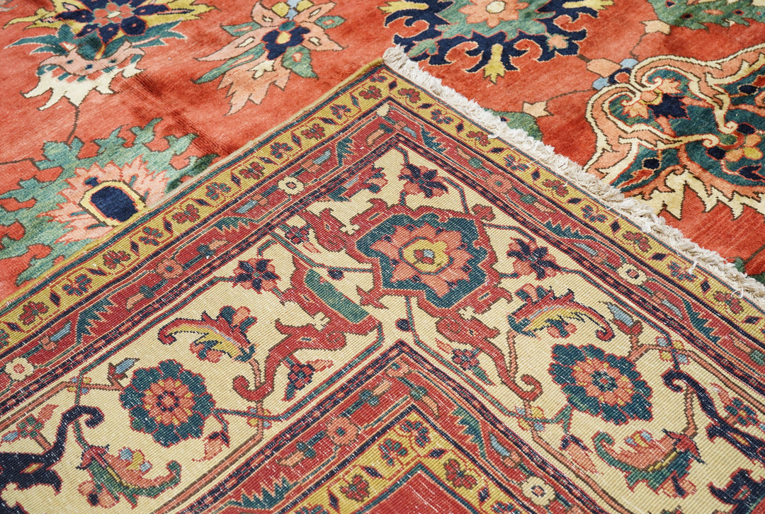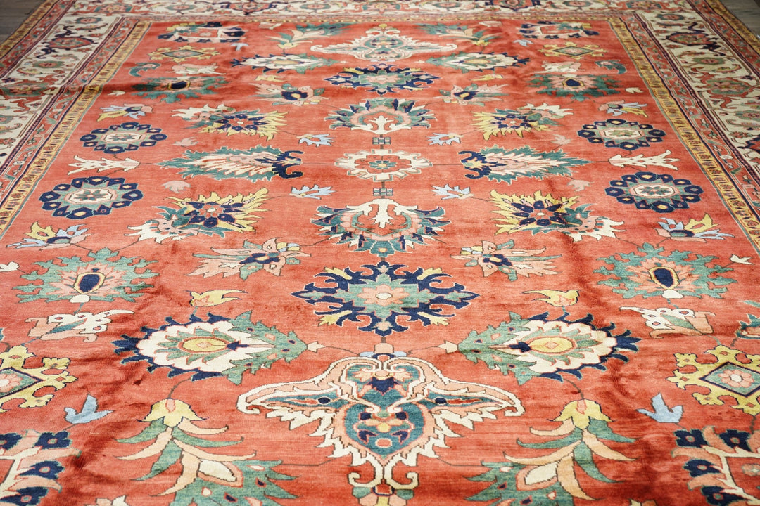 This relatively recent NW Persian village carpet features an abrashed rust-red field symmetrically displaying a central cogwheel rosette, tilted, upright and lazy petal palmettes, other rosettes, and flaming winged pendants. Ivory strip-style main border with well-spaced reversing turtles. Moderate weave. A very attractive village NW Persian carpet showing current design trends while still not departing from characteristic local "rugginess".