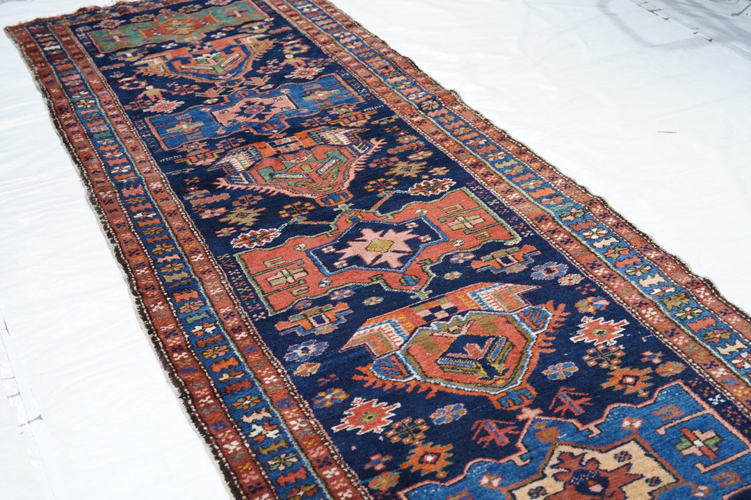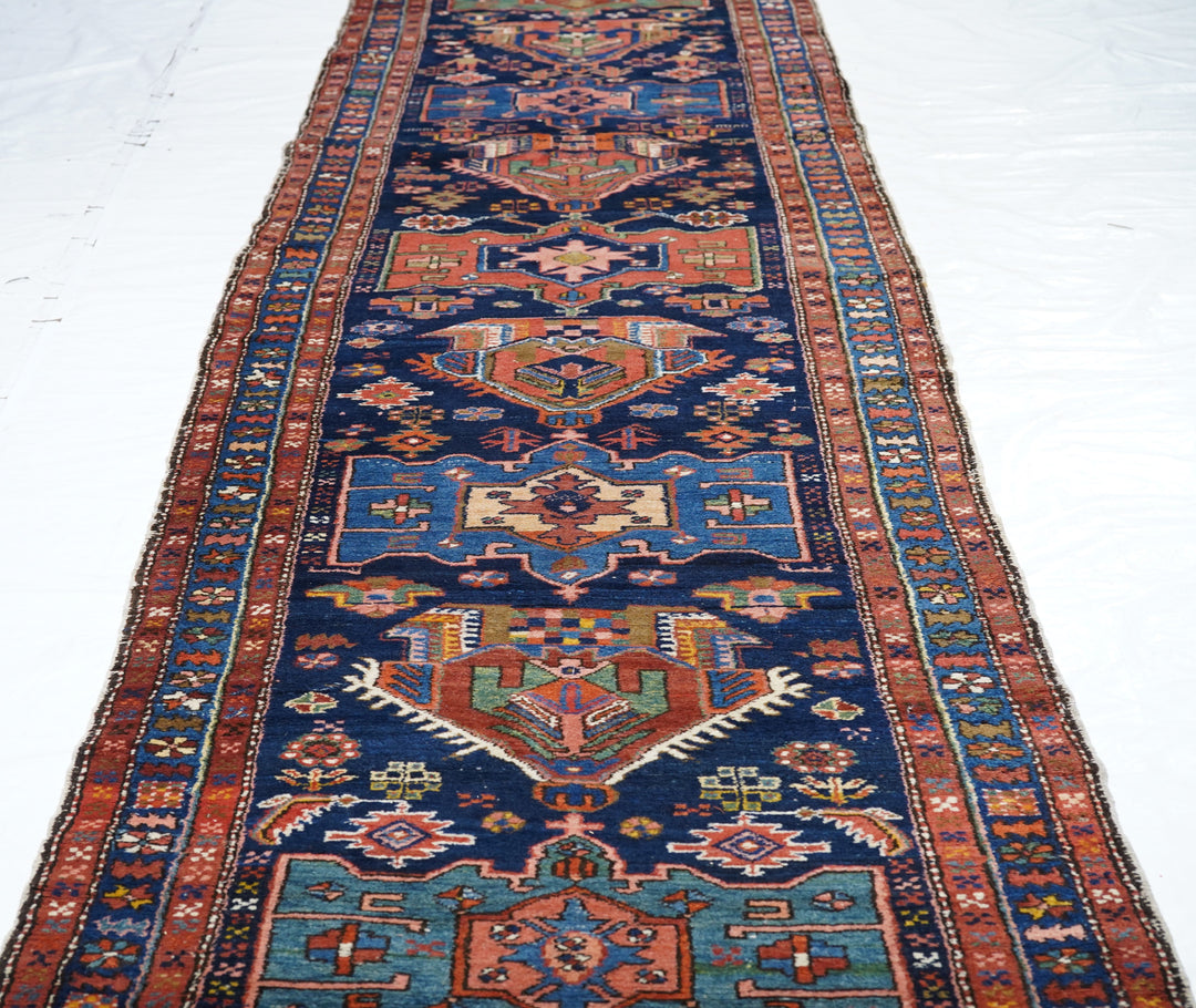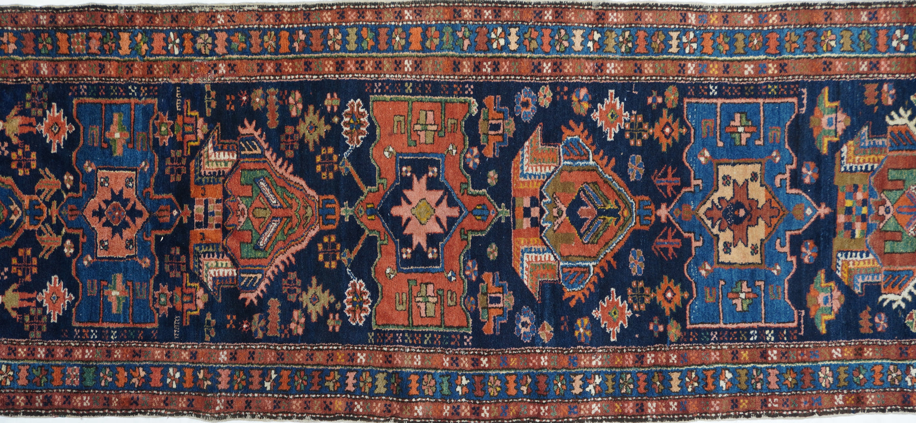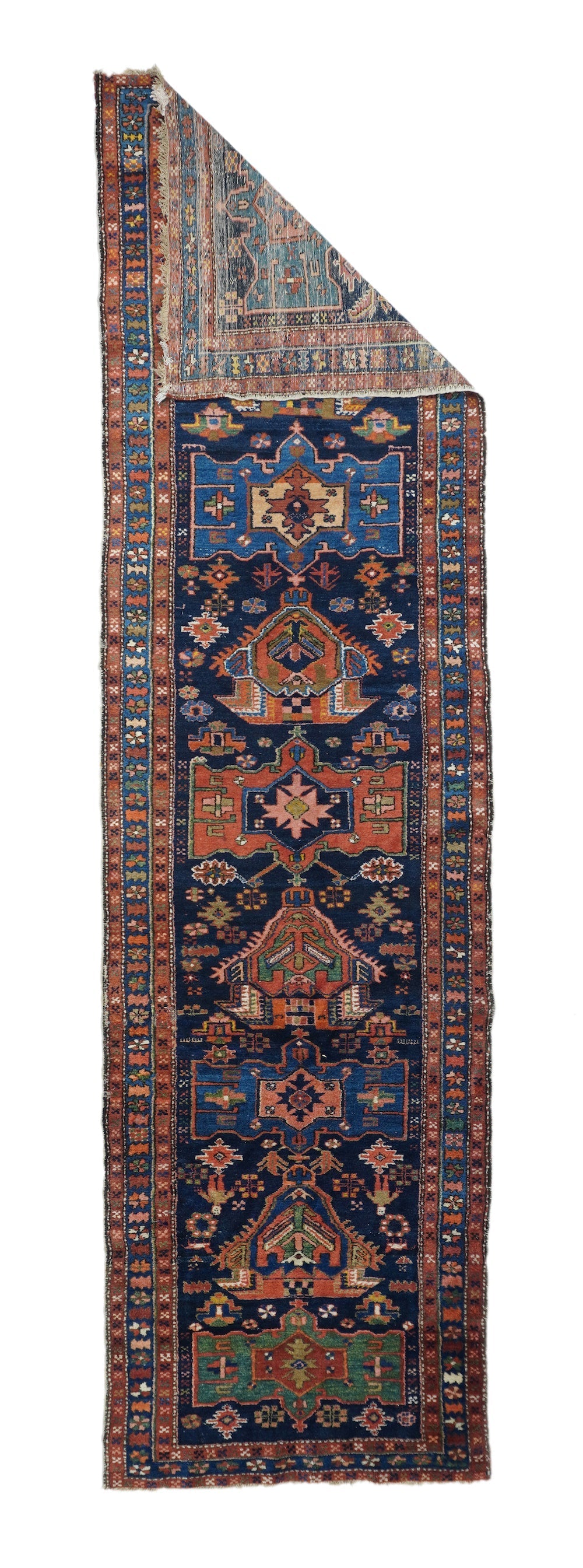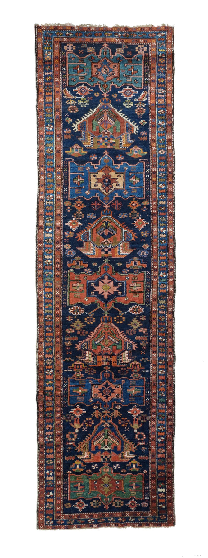 From the greater Heriz district in NW Persia, this Kenare (runner) displays a central pole medallion of teal, rust and medium blue octogramme cartouches, alternating with barbed, one way palmettes in red and rust, all on the deep indigo round. Narrow cerulean blue border of rosettes and leaves. Moderate weave. Before the popularity of Karajas, there were Karadaghs ("black mountains").