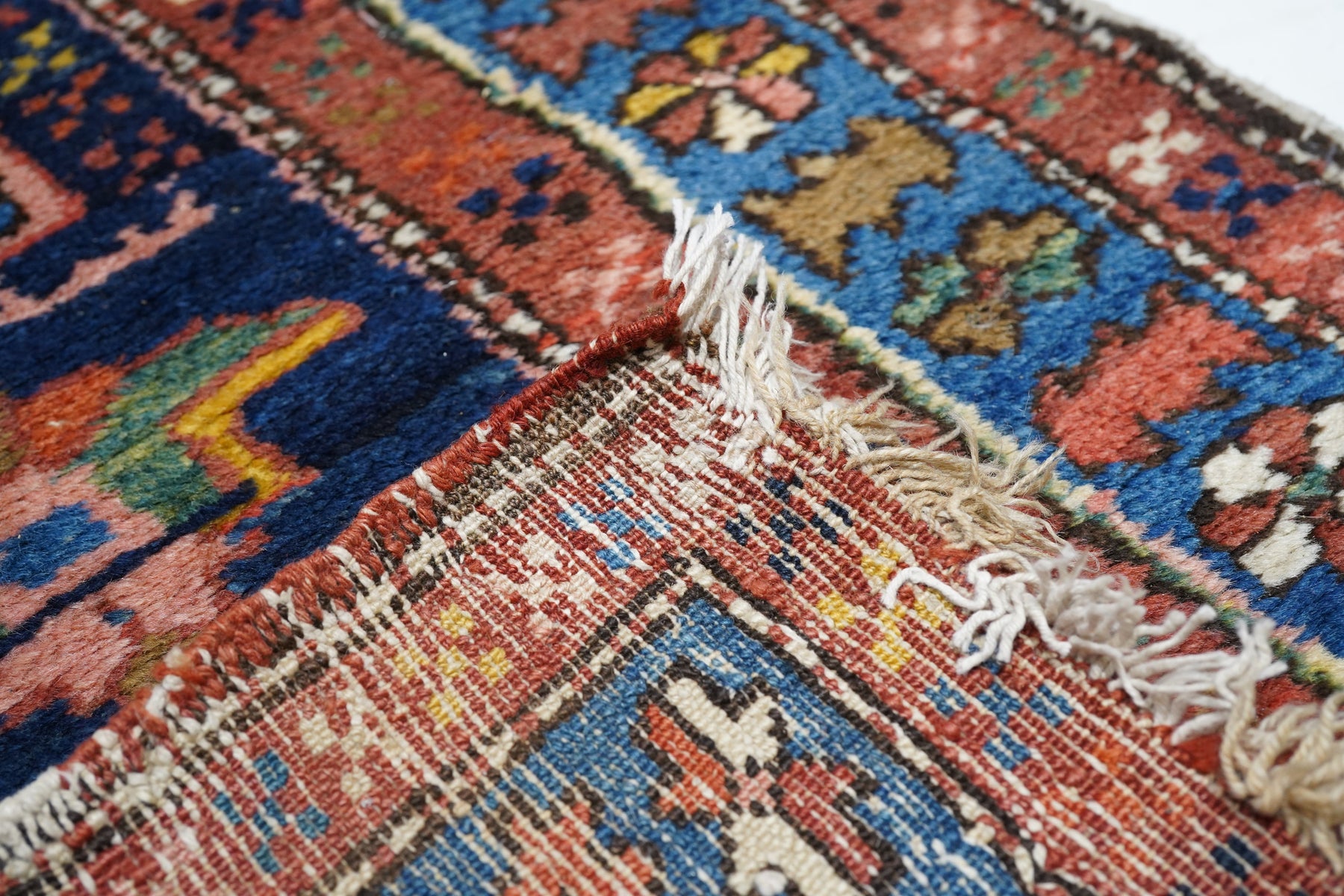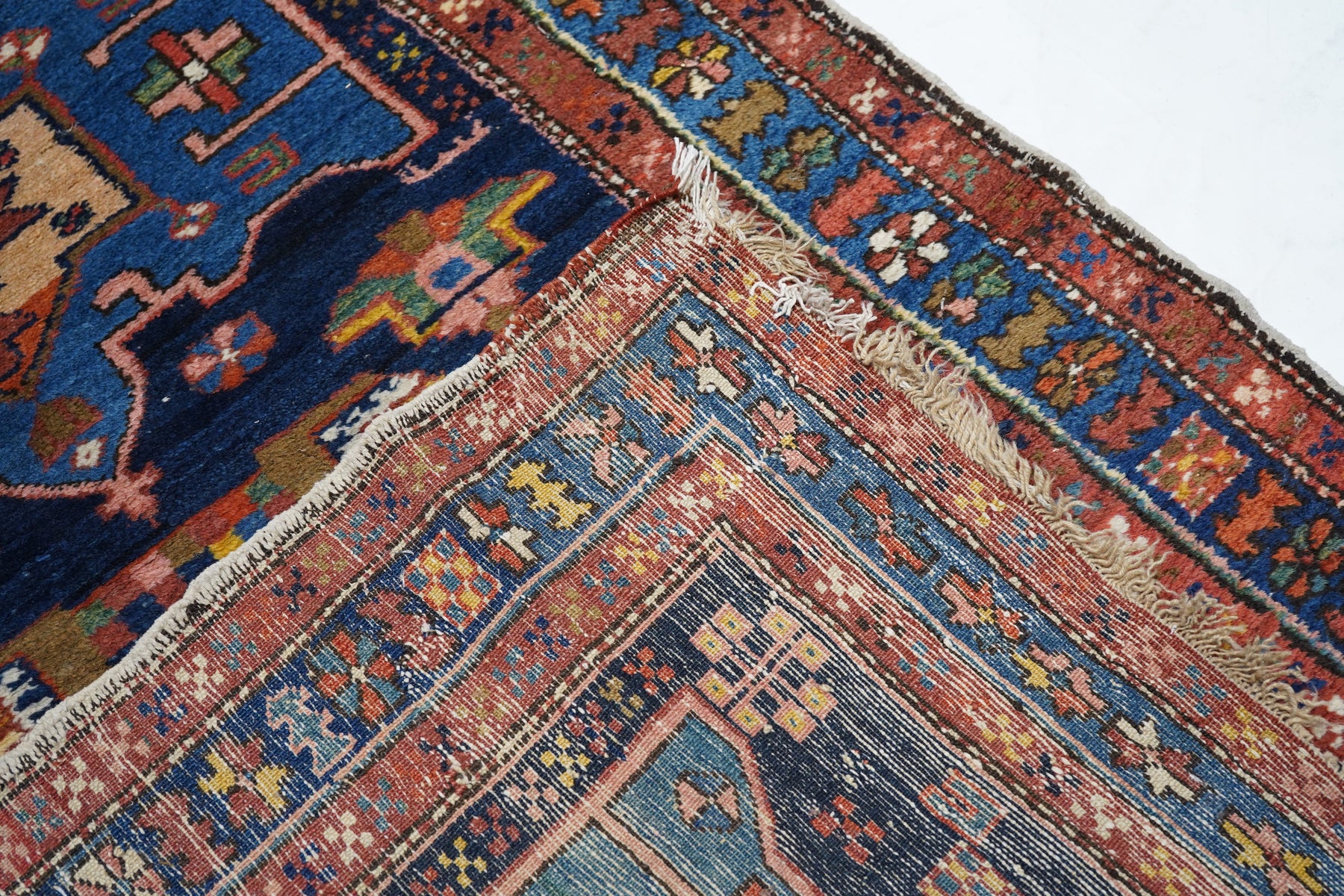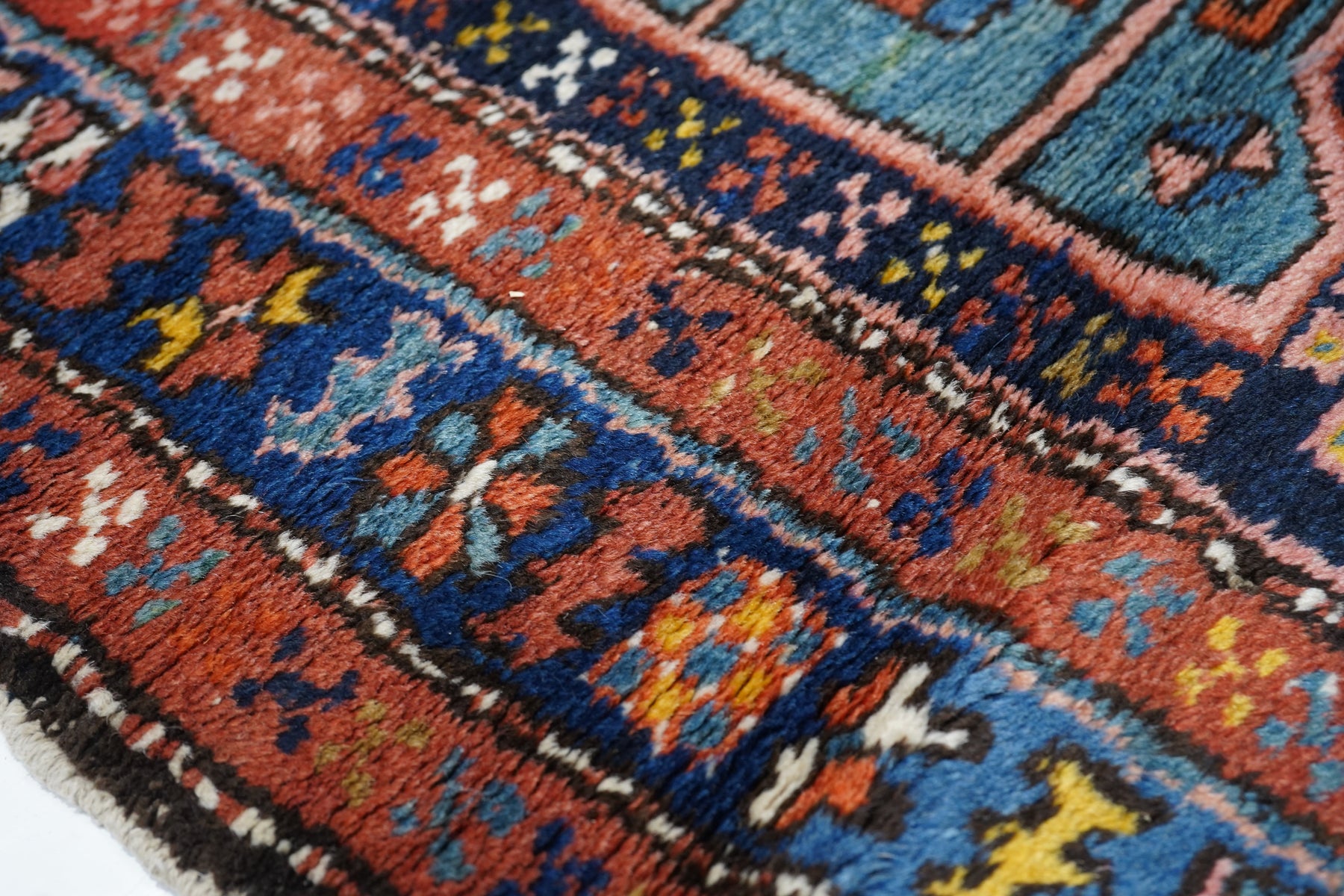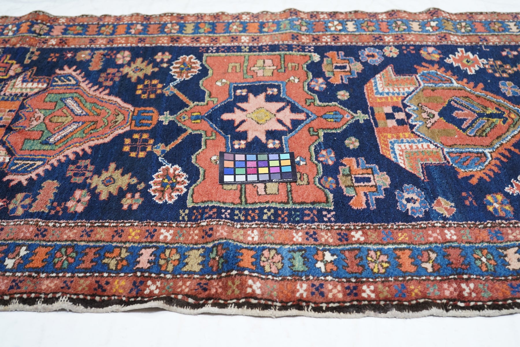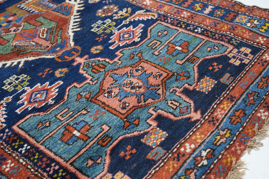 From the greater Heriz district in NW Persia, this Kenare (runner) displays a central pole medallion of teal, rust and medium blue octogramme cartouches, alternating with barbed, one way palmettes in red and rust, all on the deep indigo round. Narrow cerulean blue border of rosettes and leaves. Moderate weave. Before the popularity of Karajas, there were Karadaghs ("black mountains").