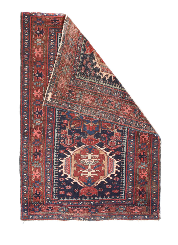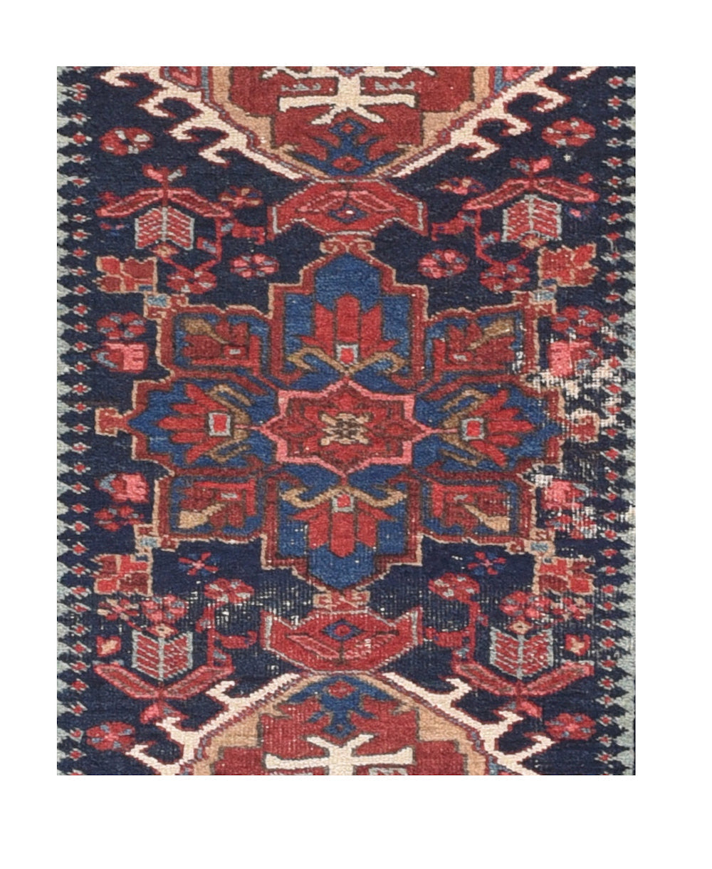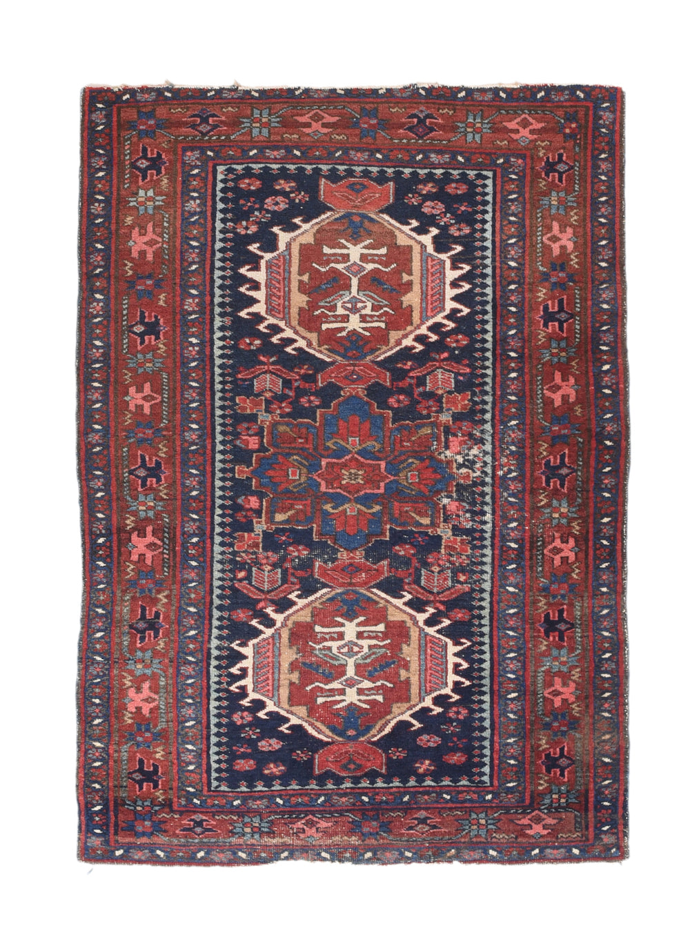 NW Persian village scatter of moderate weave with a navy field and three characteristic medallions in a pole layout, either ivory hooked hexagons or red octogramme. Red border of simplified reversing palmettes and associated stars. Light blue details. Slight reduction at one end. Good condition otherwise.