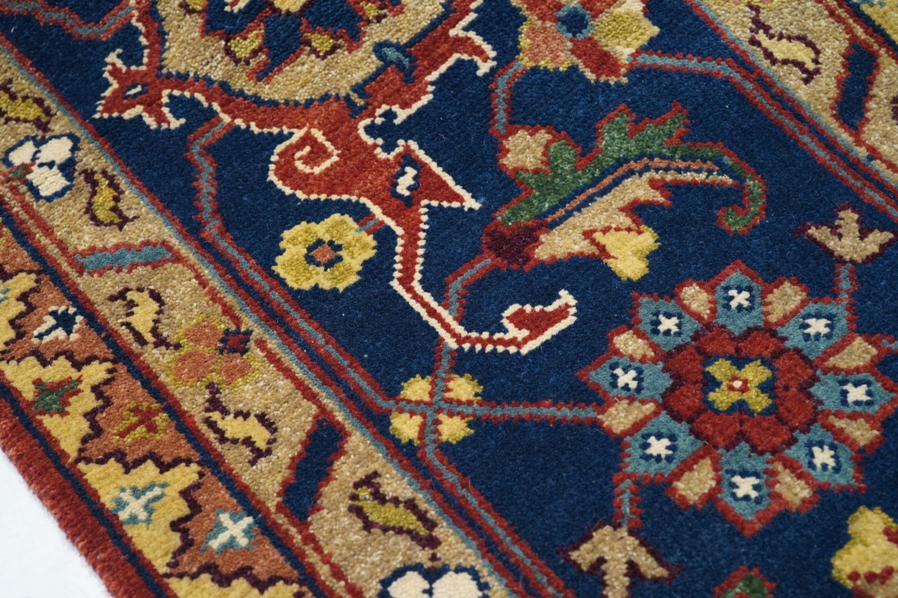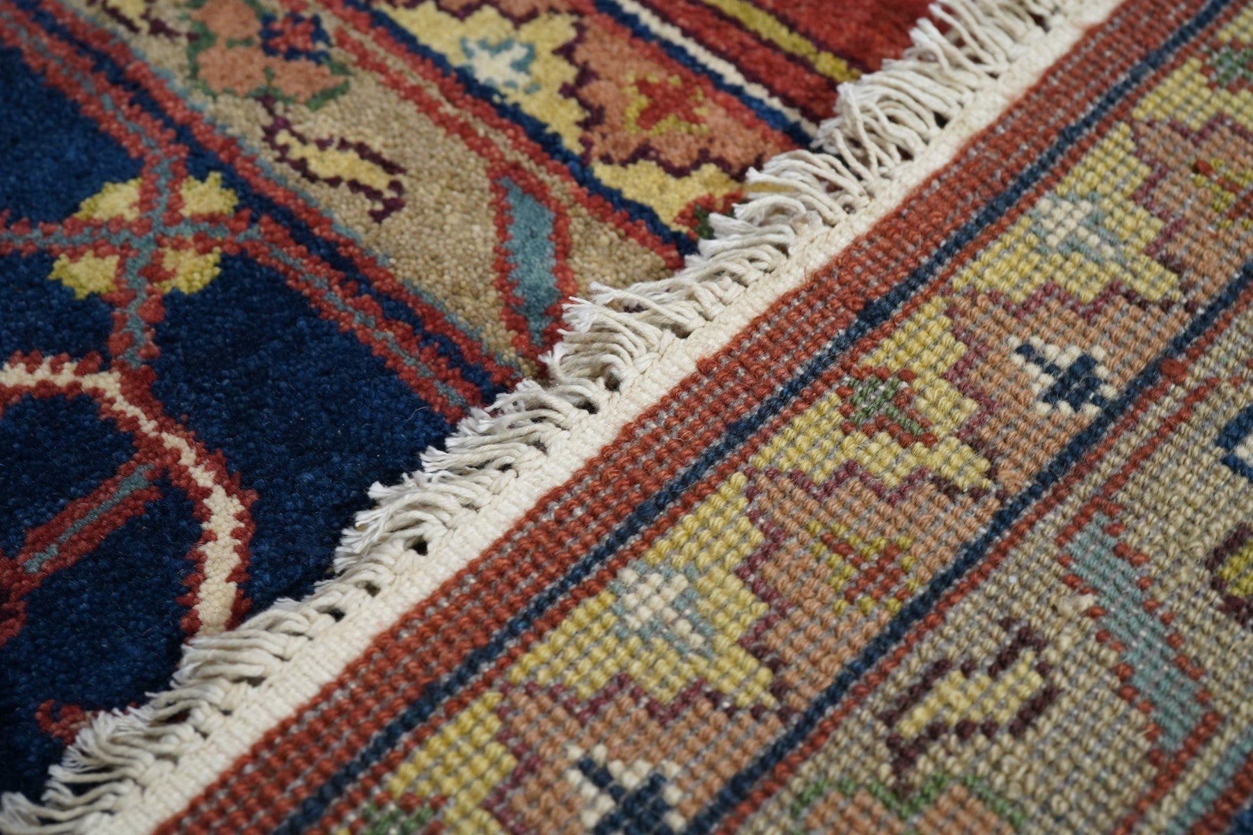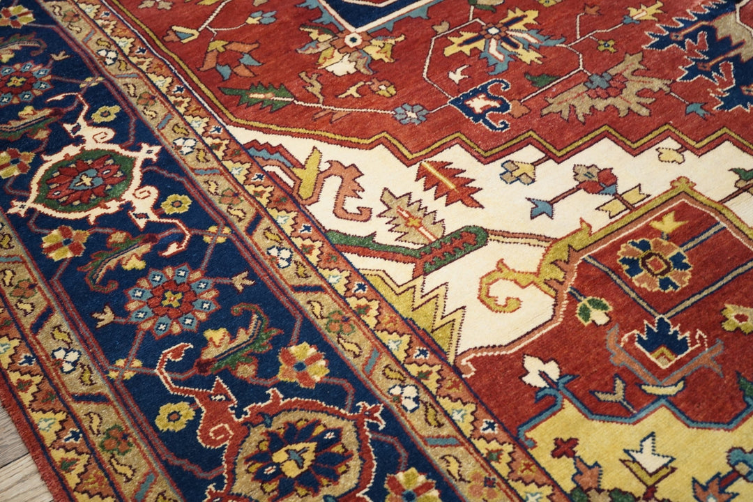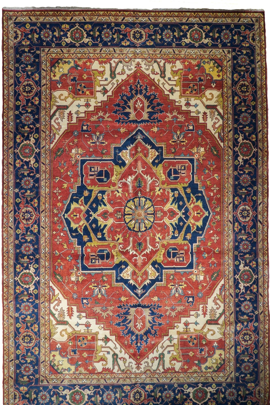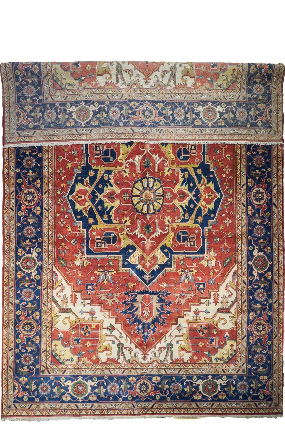21A very precisely drawn modern takeoff on an eternally popular type. It closely follows the originals with a red field hosting a navy octogramme medallion and red sub-medallion. Stepped ivory corners and ragged palmette medallion pendants. Goldenrod and straw details. Navy main border with reversing turtles. Moderate weave. Most Indo-Heriz pieces are quite small, so this large example is unusual. A "no-worry" Heriz.