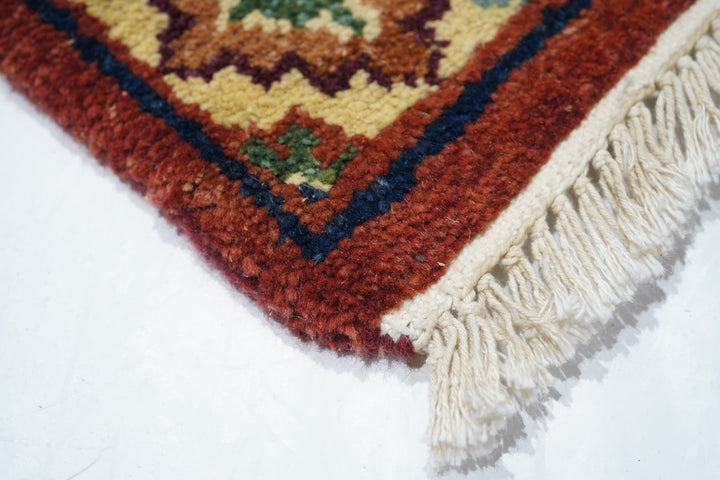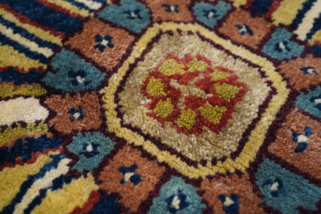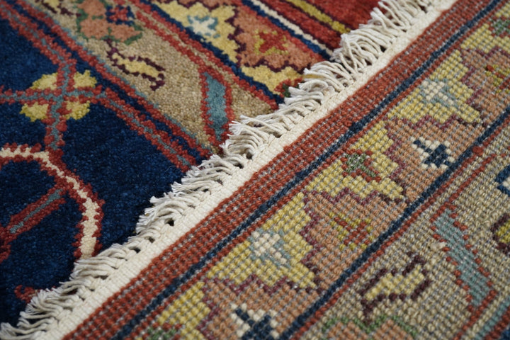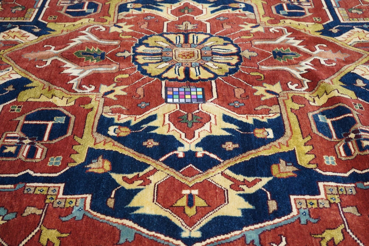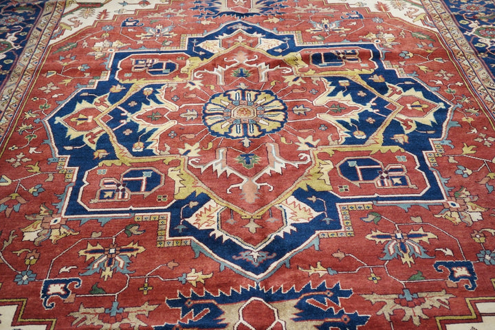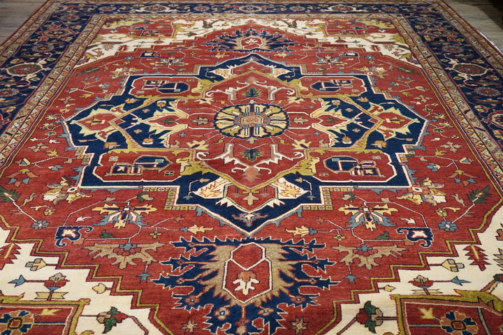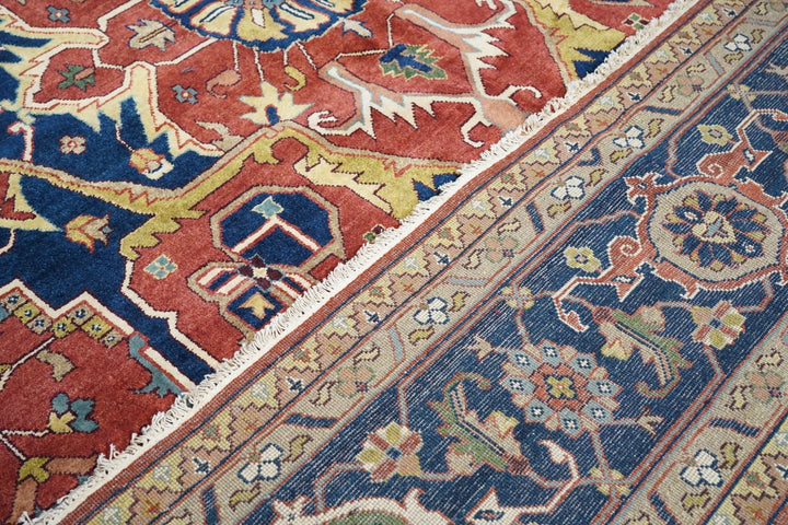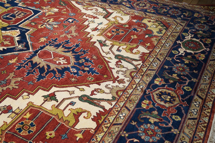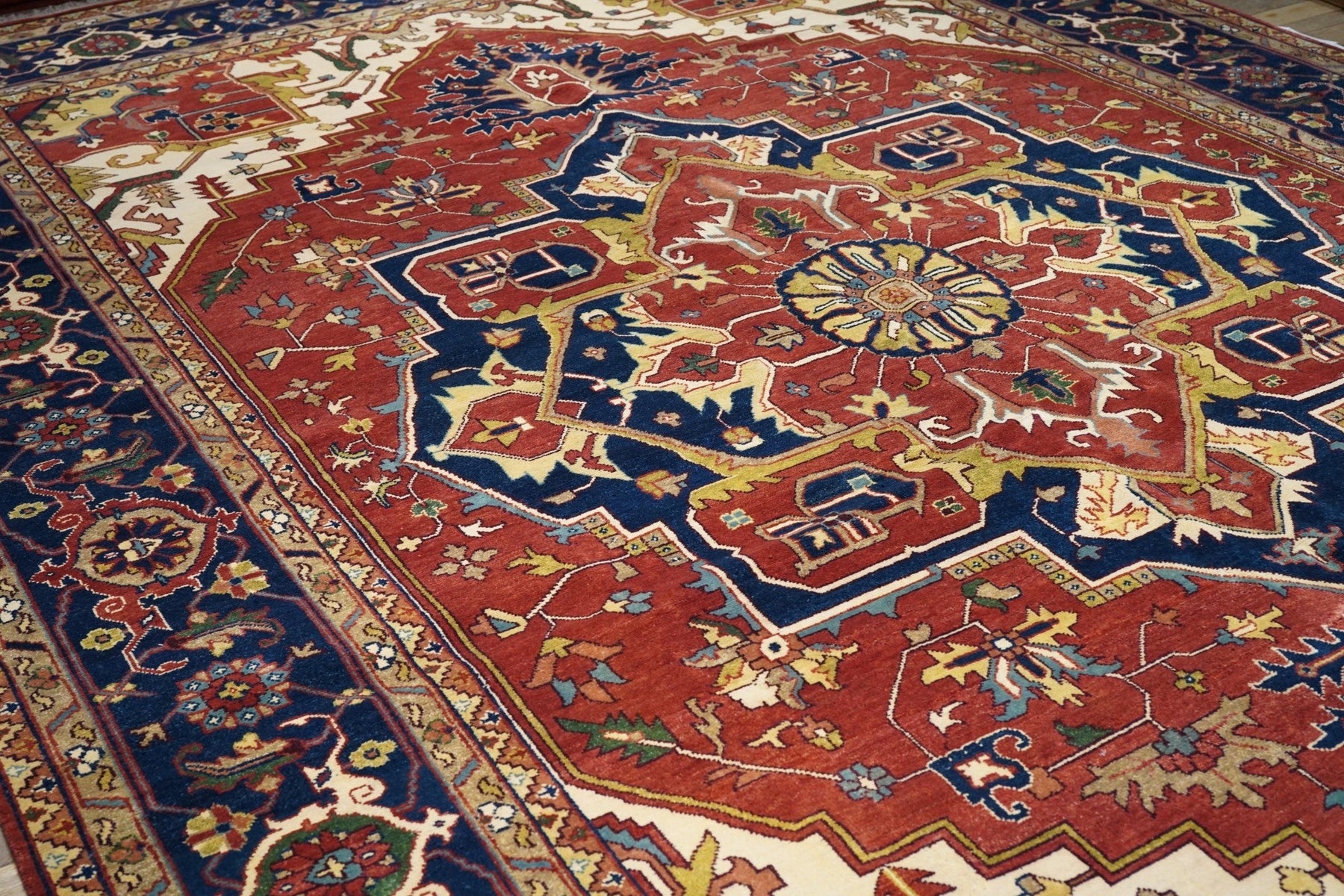 21A very precisely drawn modern takeoff on an eternally popular type. It closely follows the originals with a red field hosting a navy octogramme medallion and red sub-medallion. Stepped ivory corners and ragged palmette medallion pendants. Goldenrod and straw details. Navy main border with reversing turtles. Moderate weave. Most Indo-Heriz pieces are quite small, so this large example is unusual. A "no-worry" Heriz.
