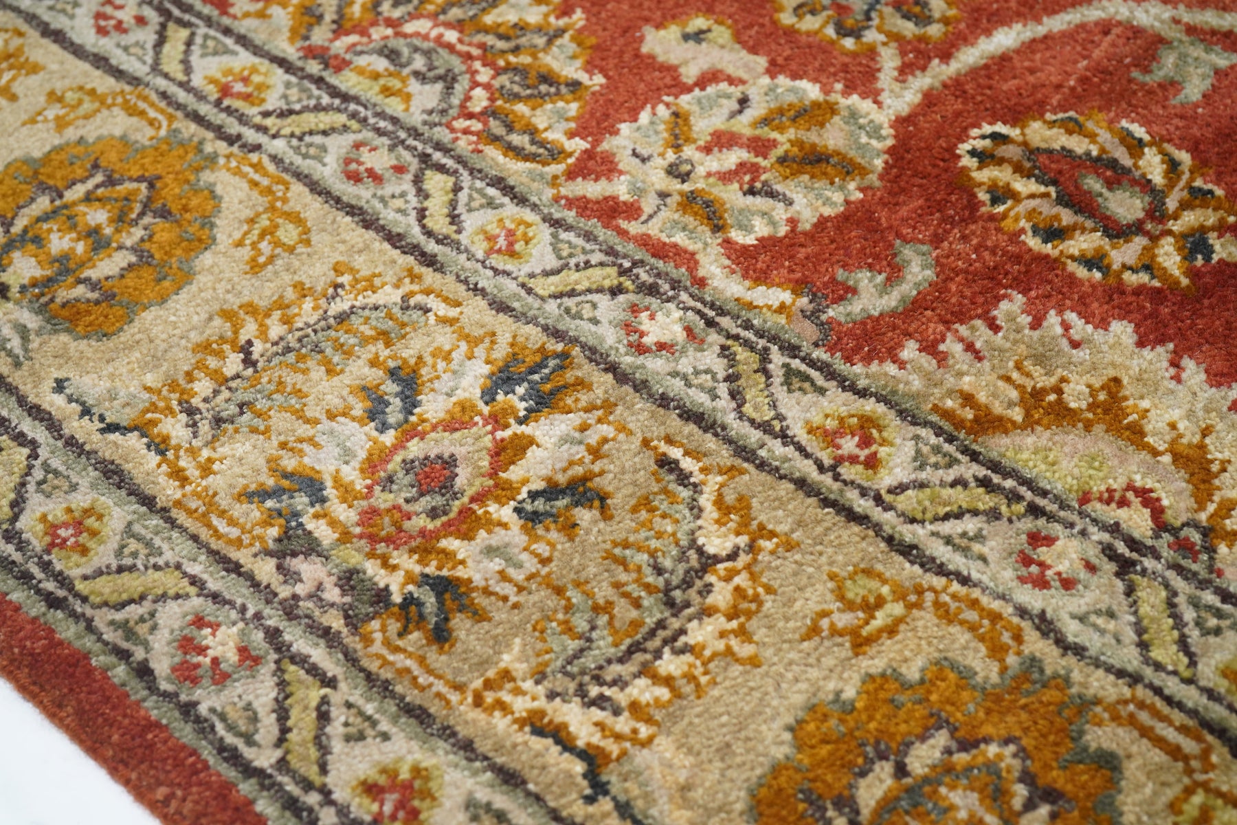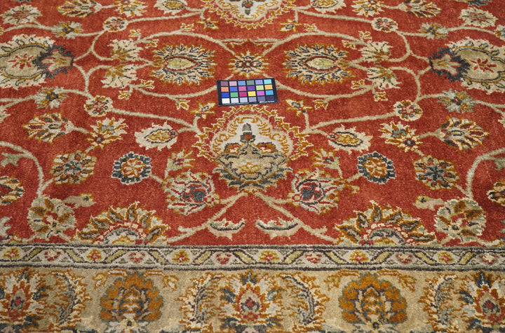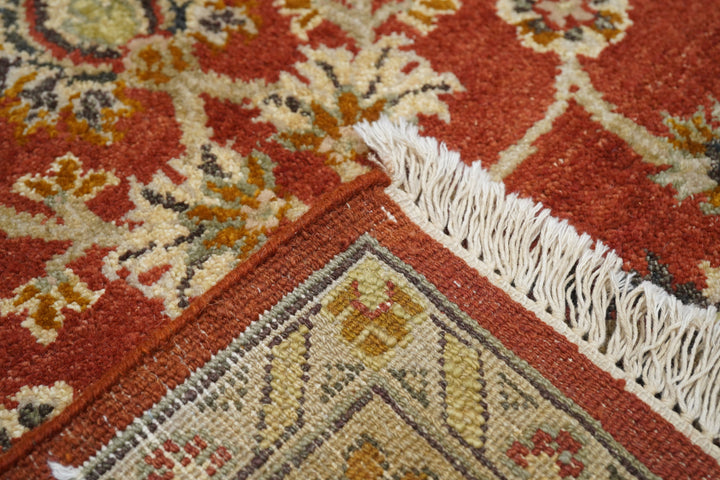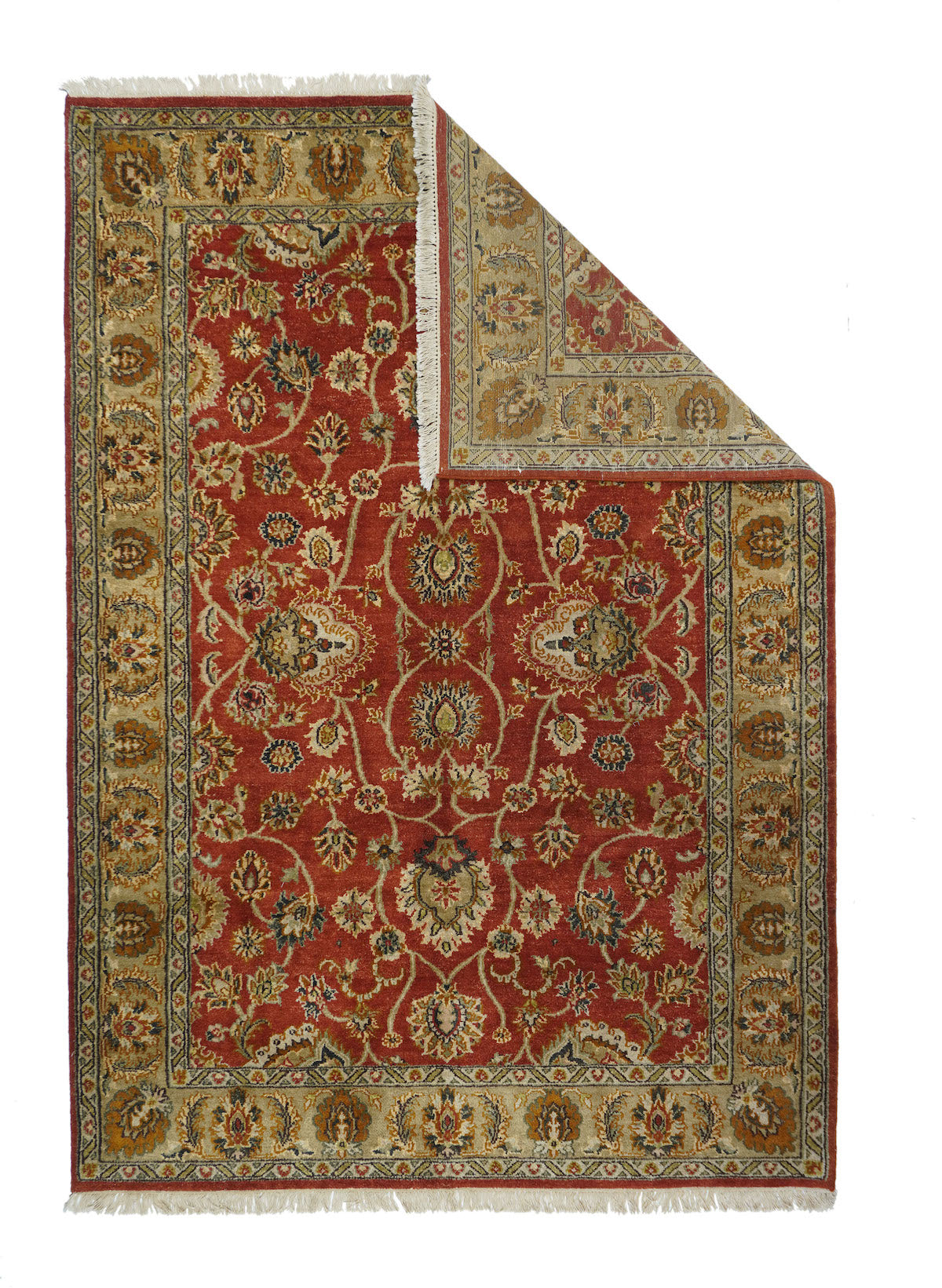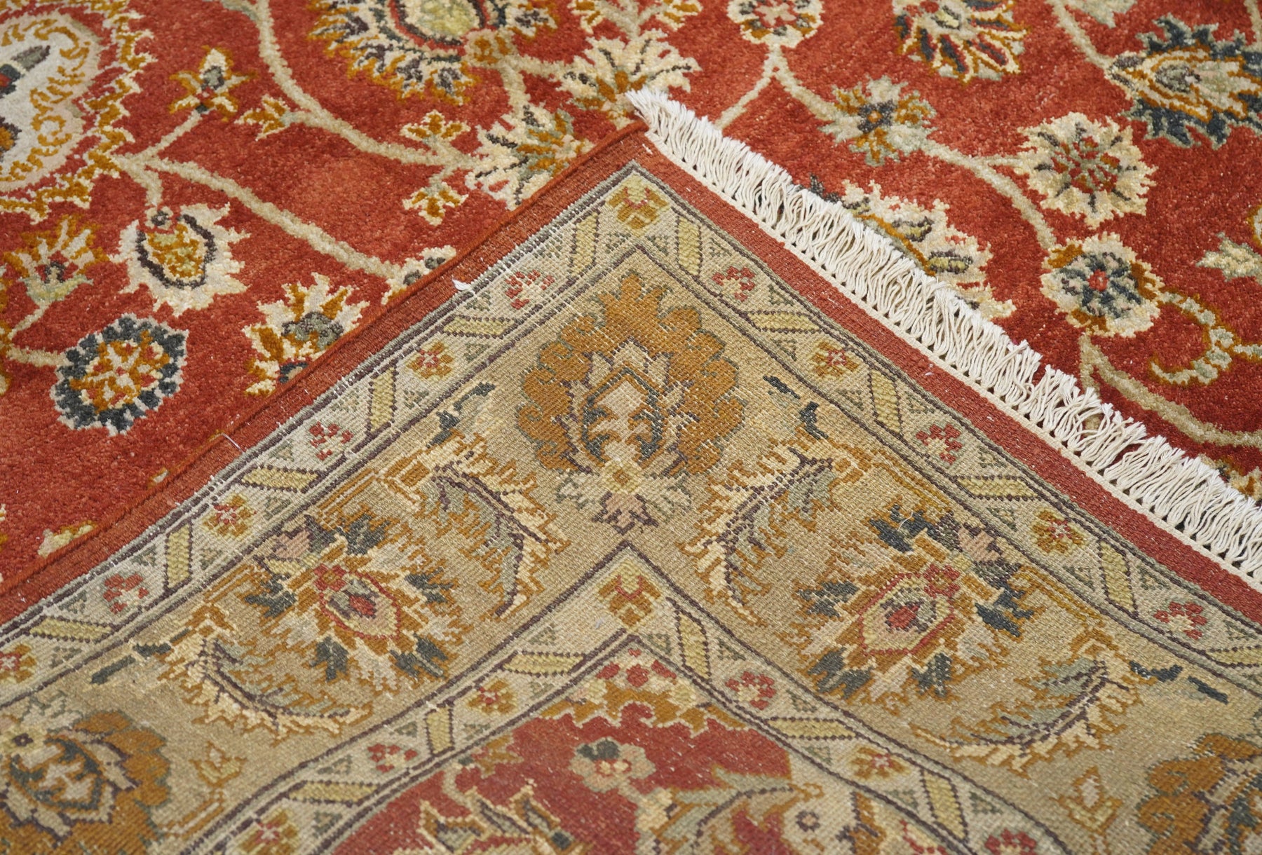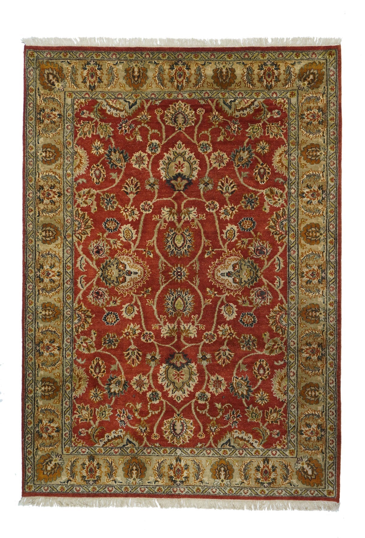 Palmettes point up. Palmettes point down. Palmettes flow all around on a vigorous vinery arabesque, on the brisk red field, accented in charcoal, light green, rust, ecru beige and dark red. Straw-camel border with complex ragged palmettes with equally ragged acanthus supporters, and simpler inward red palmettes. Cotton foundation, well-woven. Urban weave.